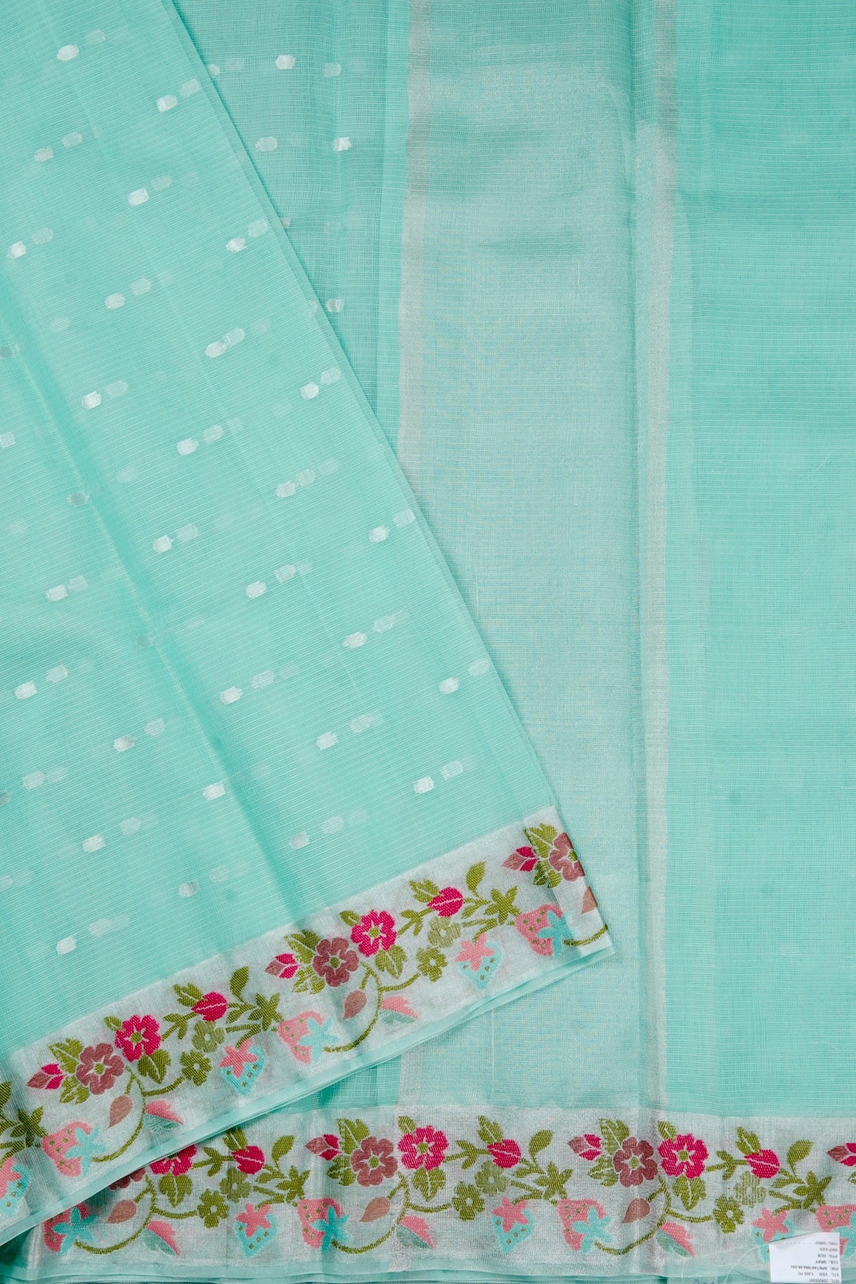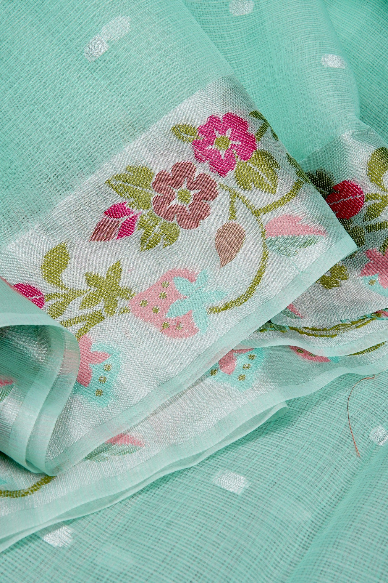 Previous NextTurquoise blue supernet saree with polka dots woven in silver zari throughout the body and a thick border with buds, leaves and floral motifs woven in green, pink and carmine. The pallu has a wide band of mild silver zari.