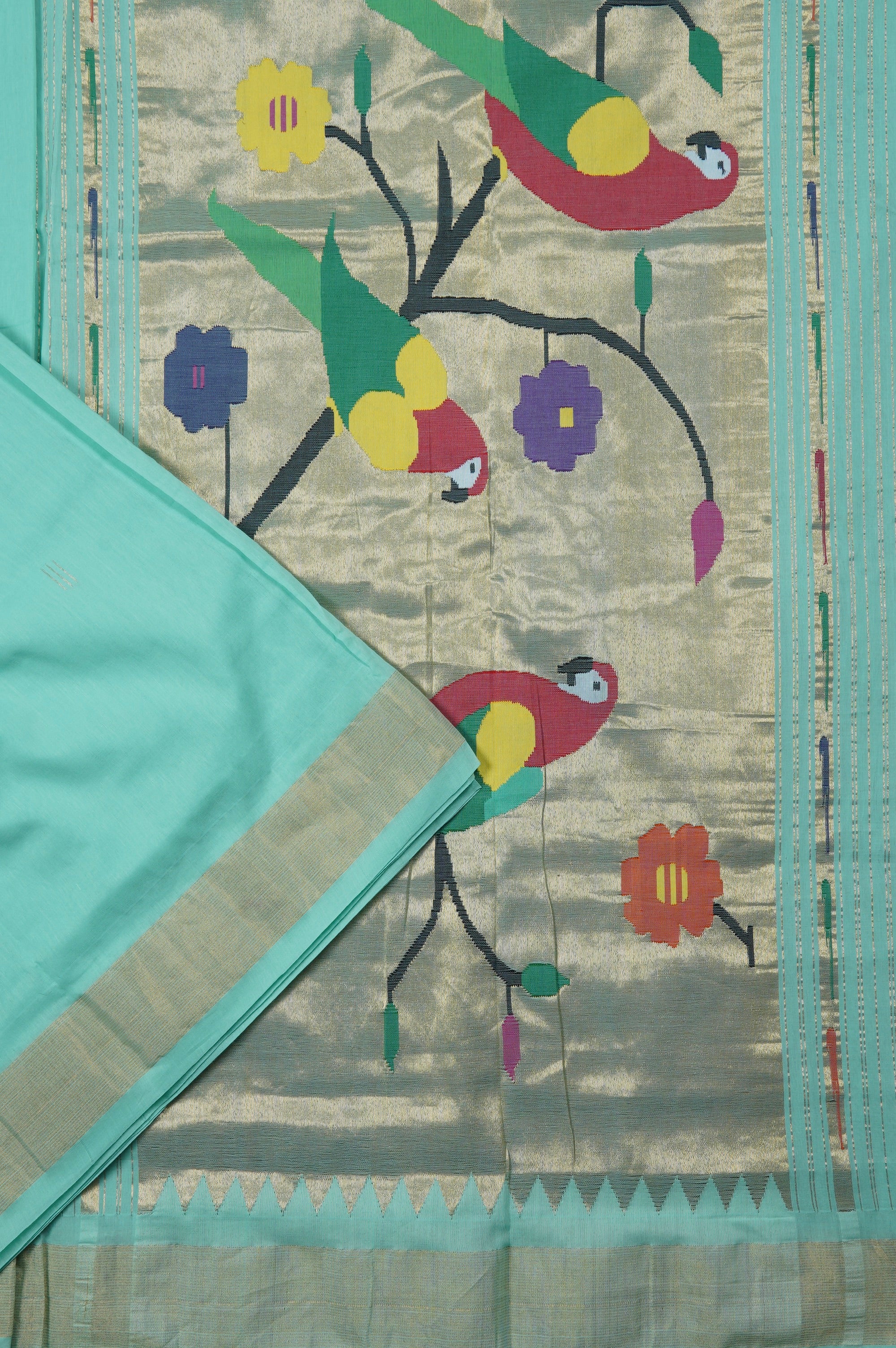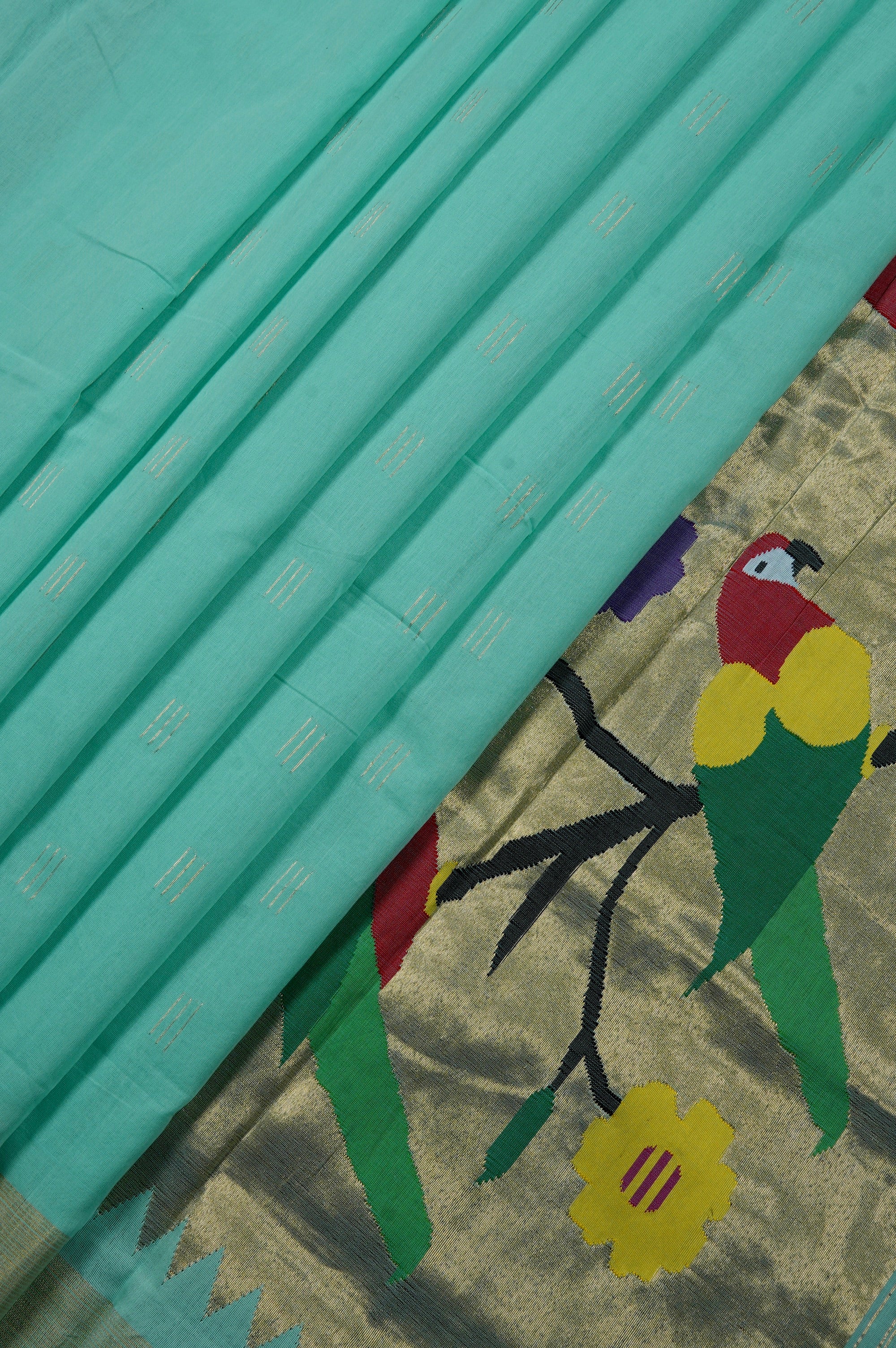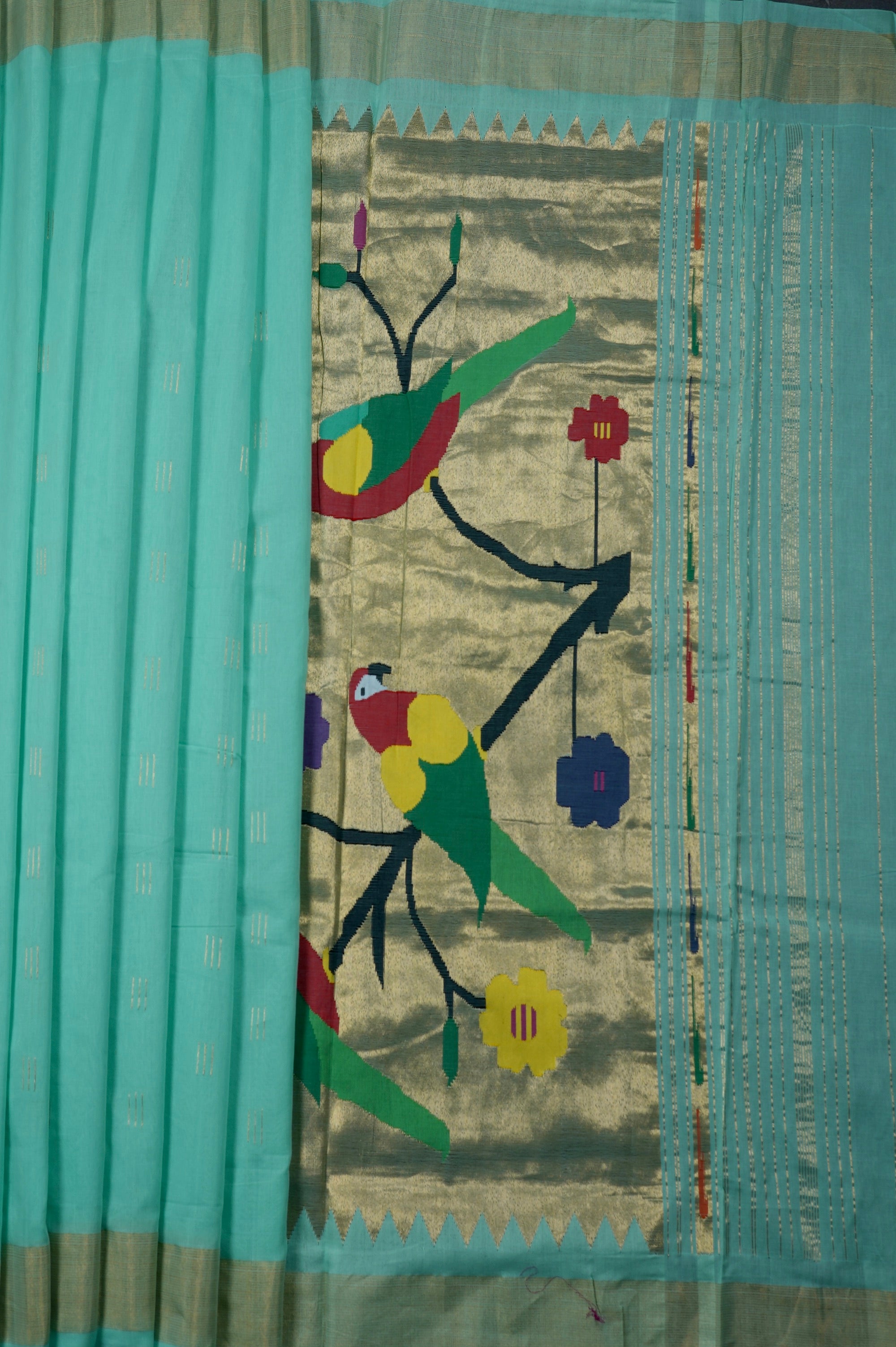 Previous NextA minimal turquoise cotton saree, woven with small thin lines in gold zari, grouped together forming bhuttas along the body. The border complements the minimalism with a simple band of gold zari. The saree flows into a contrasting pallu with a gold zari base. It showcases the blend of storytelling with craftsmanship, portraying colorful birds resting on the branches of a tree. These are woven in vibrant shades of red, green, black, blue and yellow, ending with a simple band of gold zari.