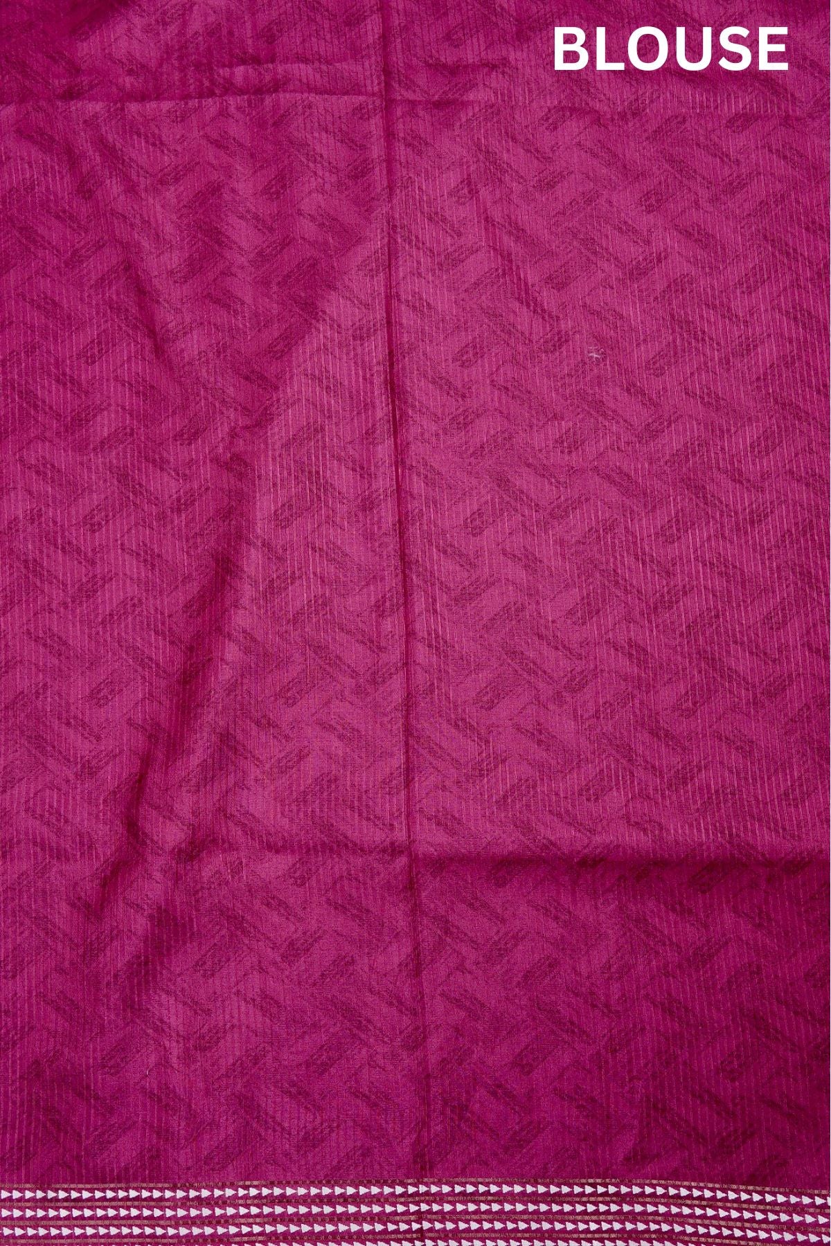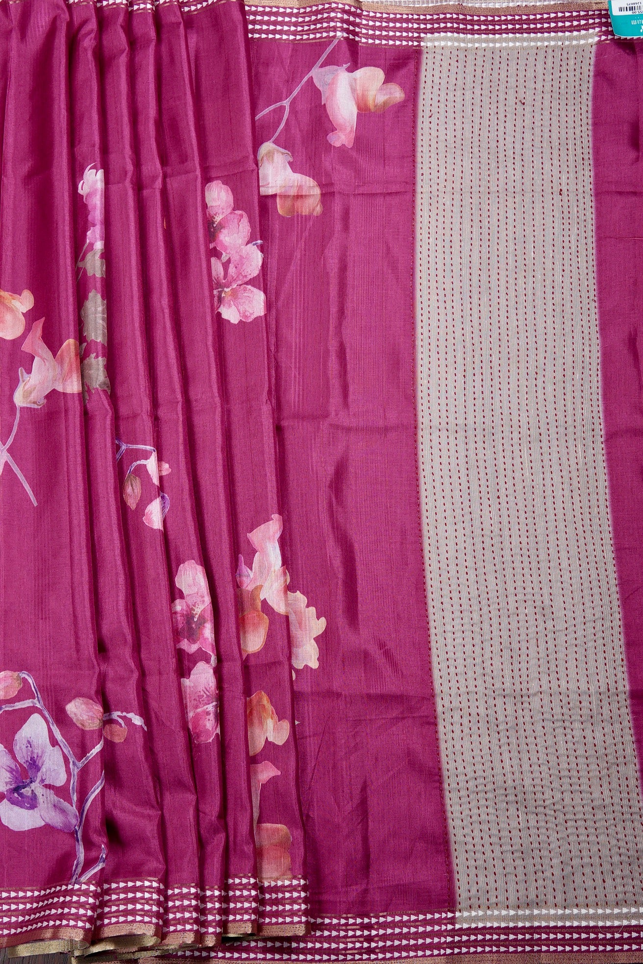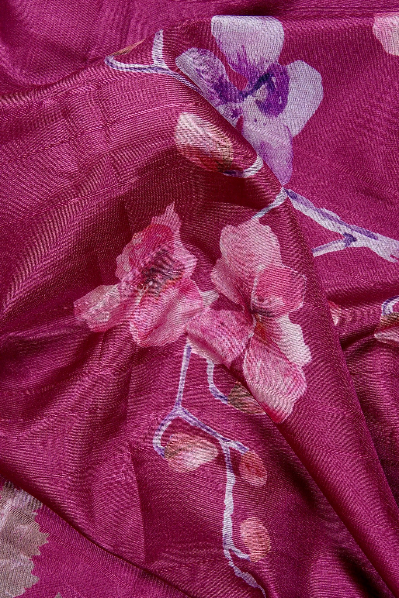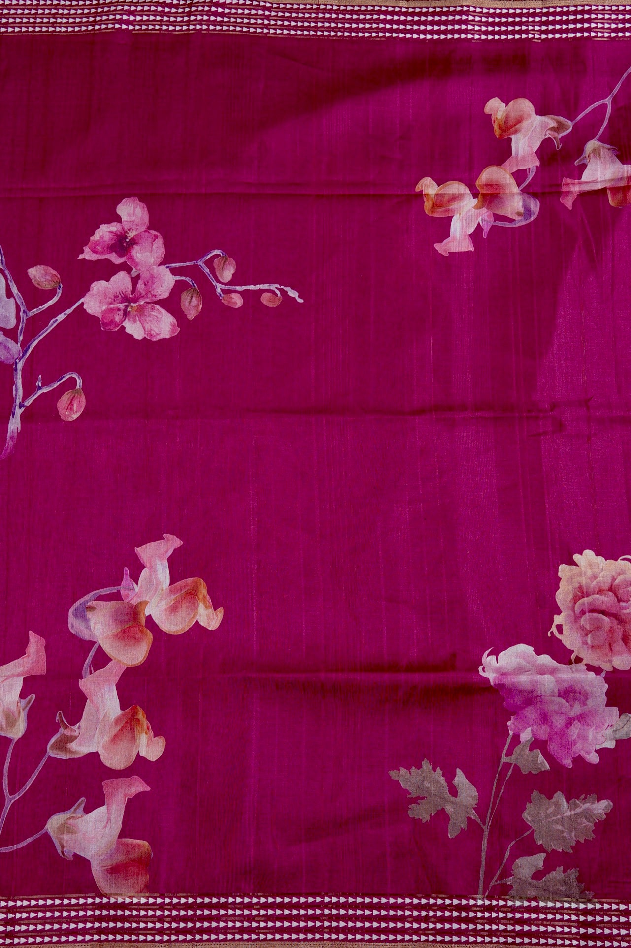 Previous NextA vibrant berry semi tussar saree, adorned with delicate floral vines in shades of soft blush and cream. The border has geometric white triangles, leading into a contrasting pallu in ivory that features rhythmic vertical stripes. The saree has a vibrant pink blouse, intricately textured with a tonal geometric weave that echoes the modern spirit of the collection.
