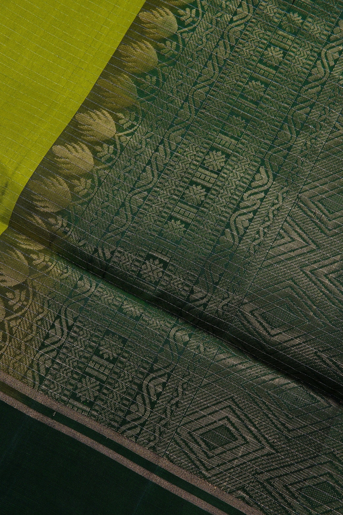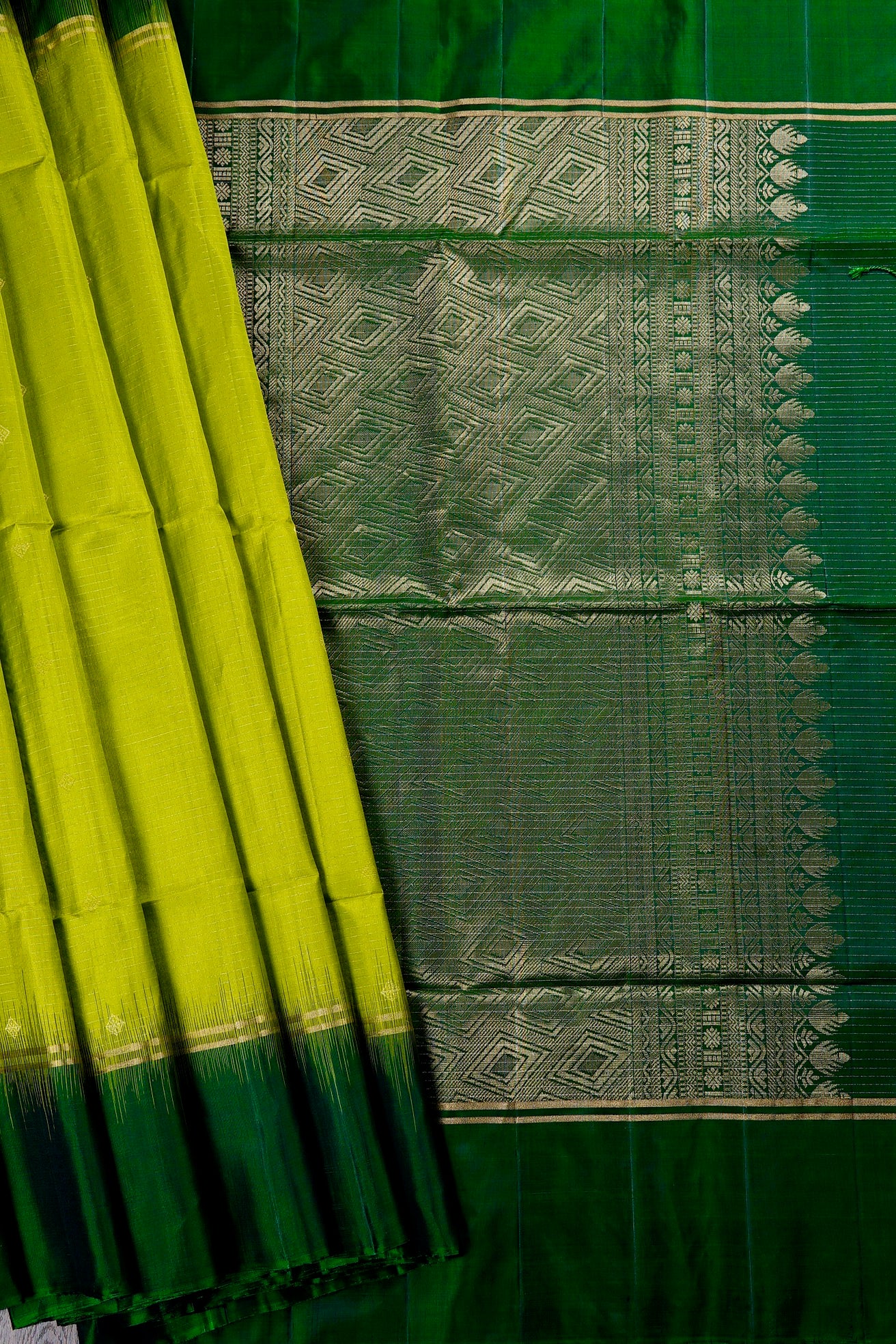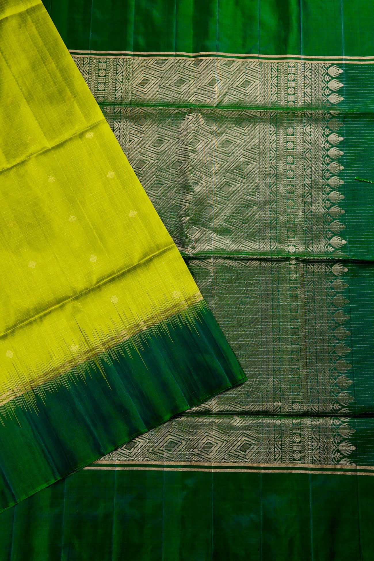 A bright soft silk saree woven in vivid lime green threads, filled with vaira oosi running horizontally passing through small diamond shaped motifs woven in gold zari, gradating into a dark green border in color blocking gold zari lines. The pallu is of a dark green shade, enhanced by concentric diamonds, followed by bands of waves and a rudraksha pet woven in gold zari, making it look like a green-gold silk. The saree has a dark green blouse filled with vaira oosi woven horizontally in gold zari.