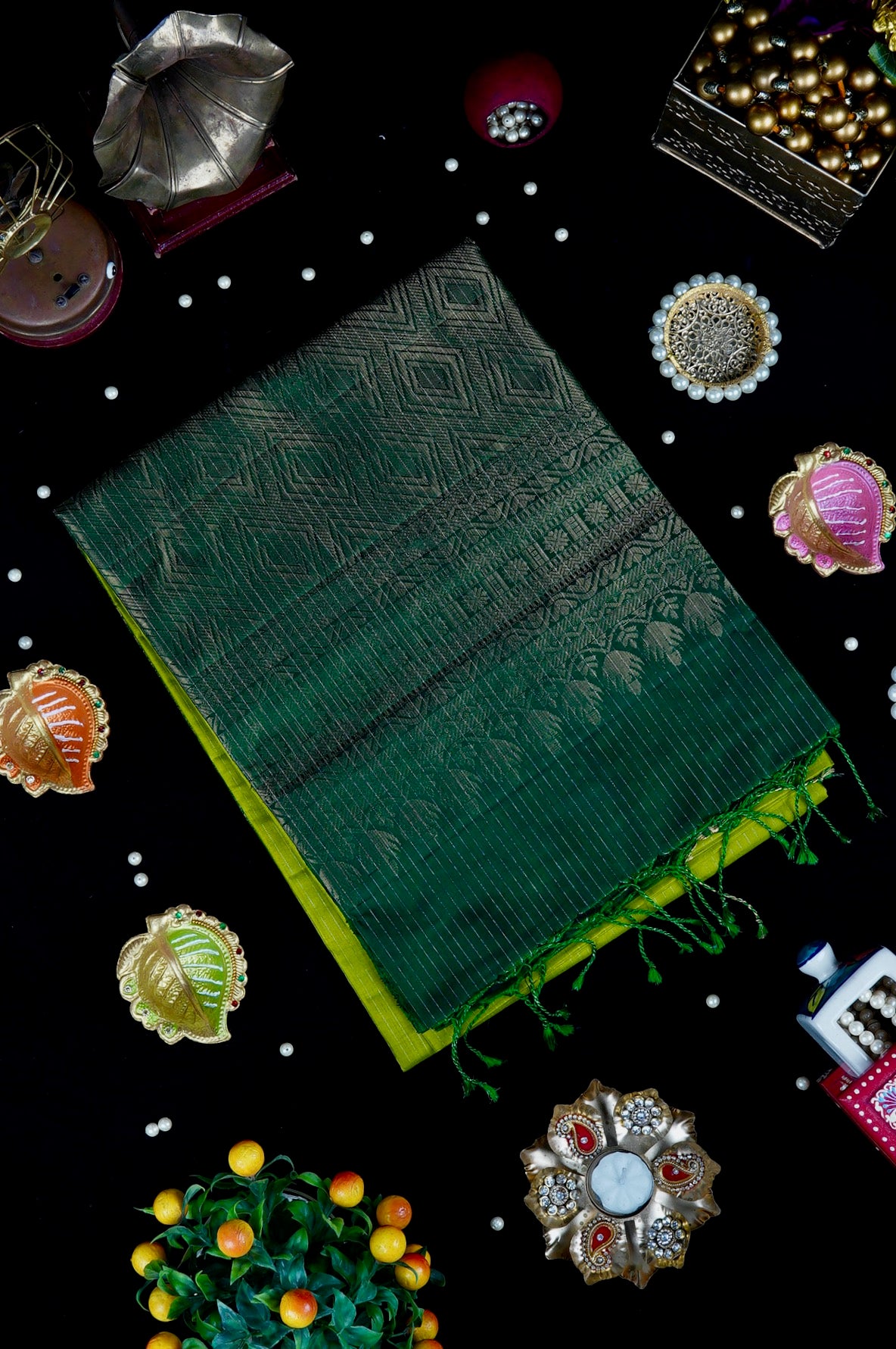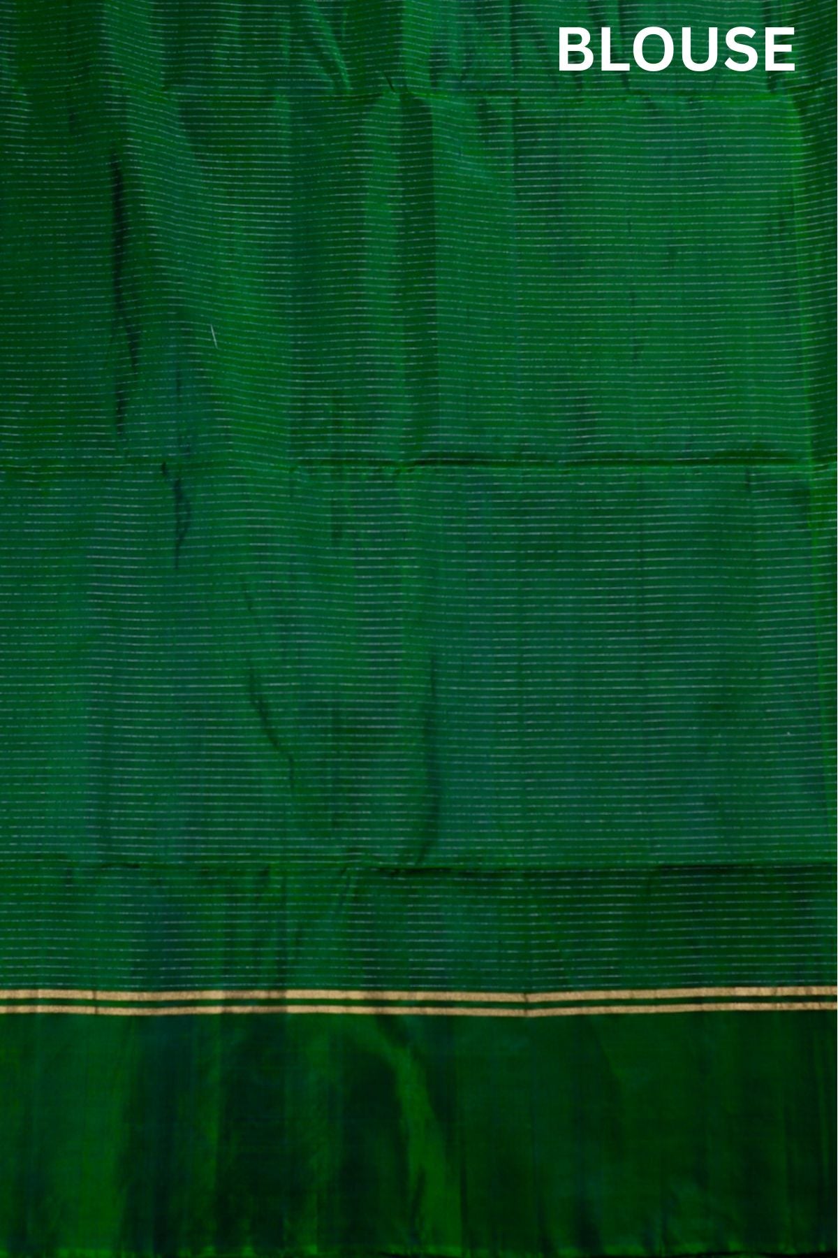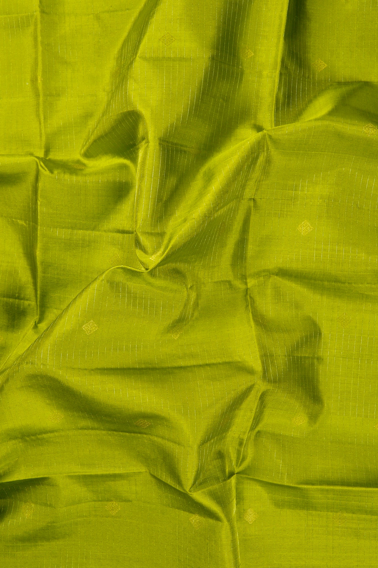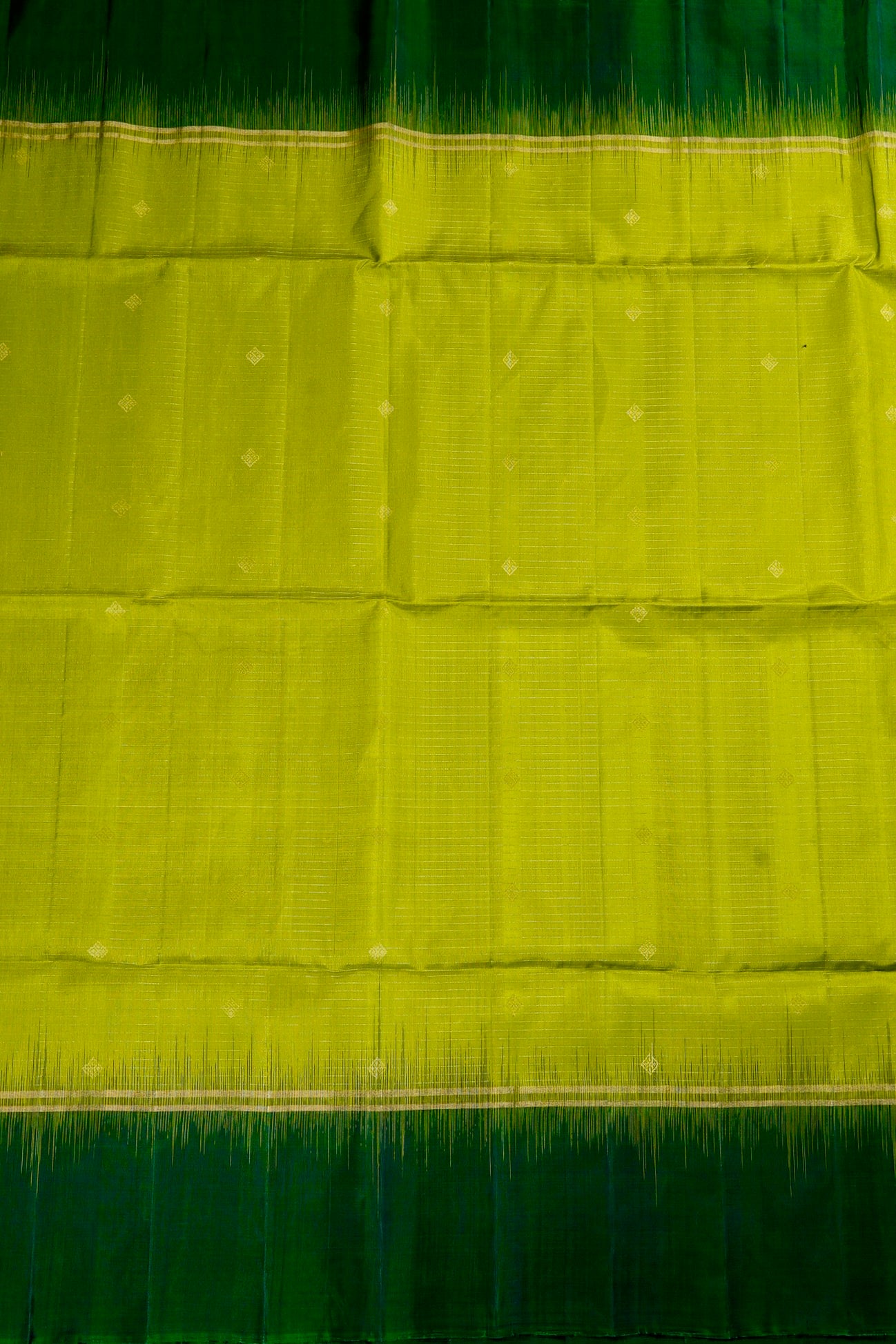 A bright soft silk saree woven in vivid lime green threads, filled with vaira oosi running horizontally passing through small diamond shaped motifs woven in gold zari, gradating into a dark green border in color blocking gold zari lines. The pallu is of a dark green shade, enhanced by concentric diamonds, followed by bands of waves and a rudraksha pet woven in gold zari, making it look like a green-gold silk. The saree has a dark green blouse filled with vaira oosi woven horizontally in gold zari.