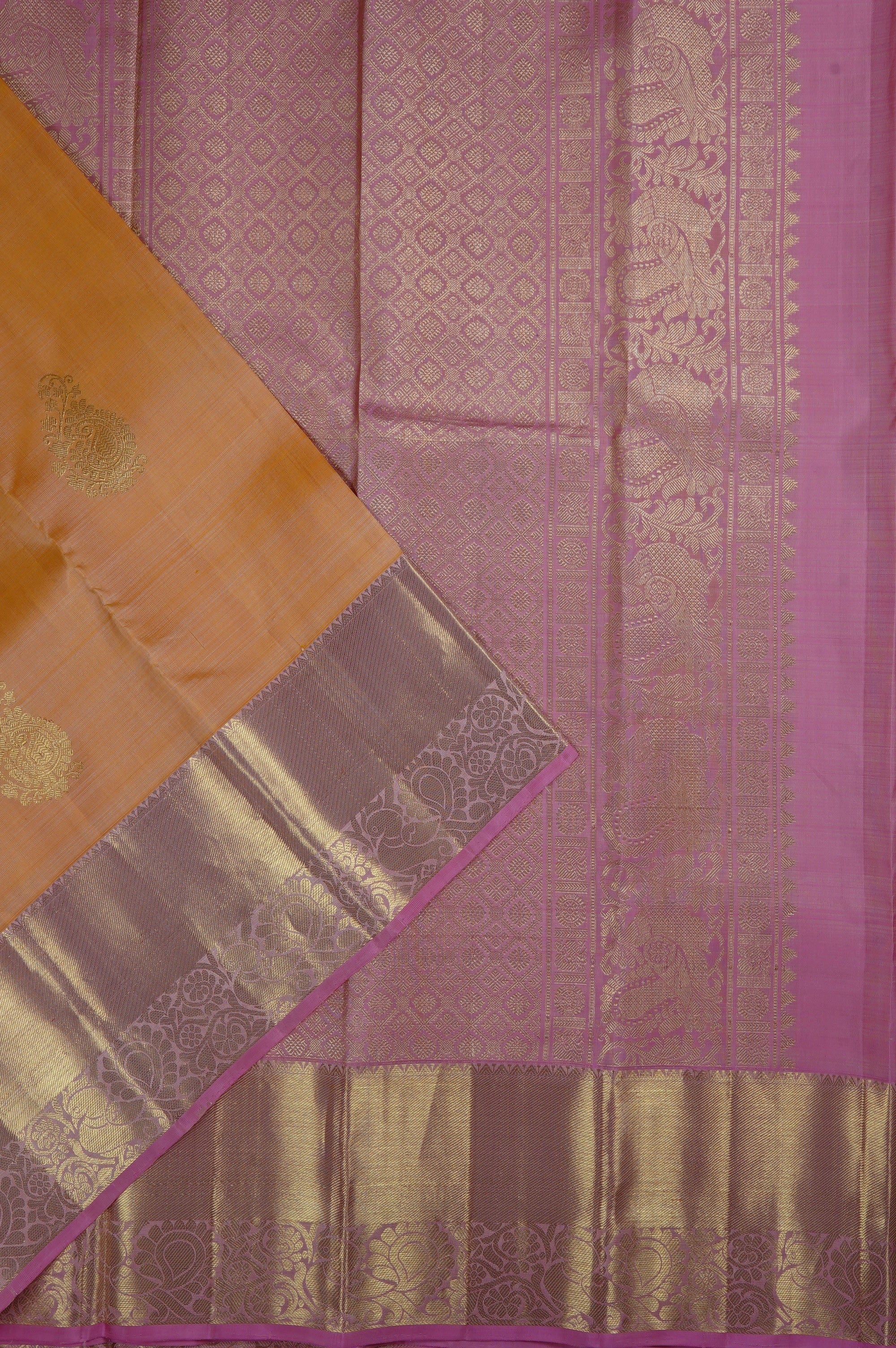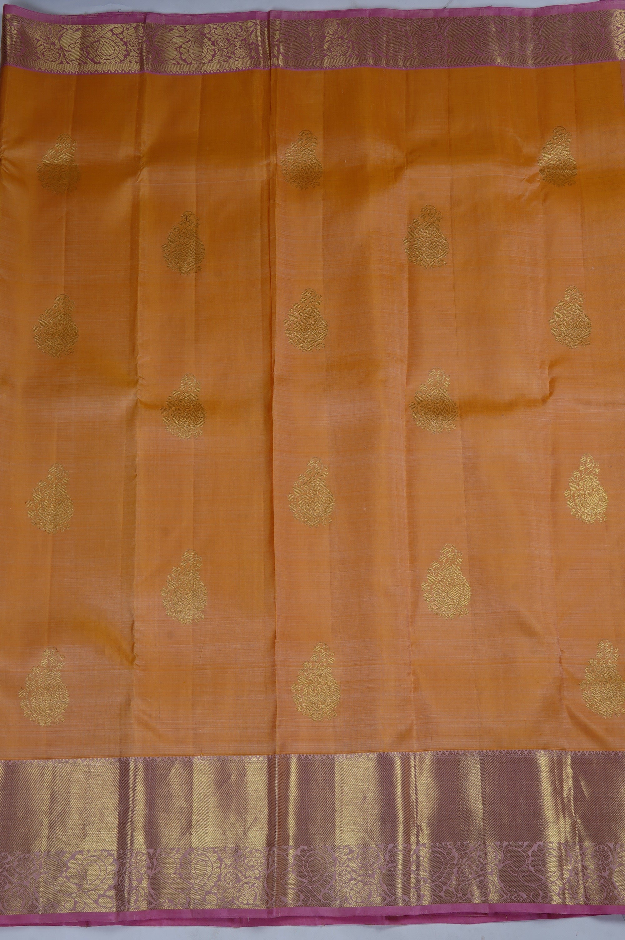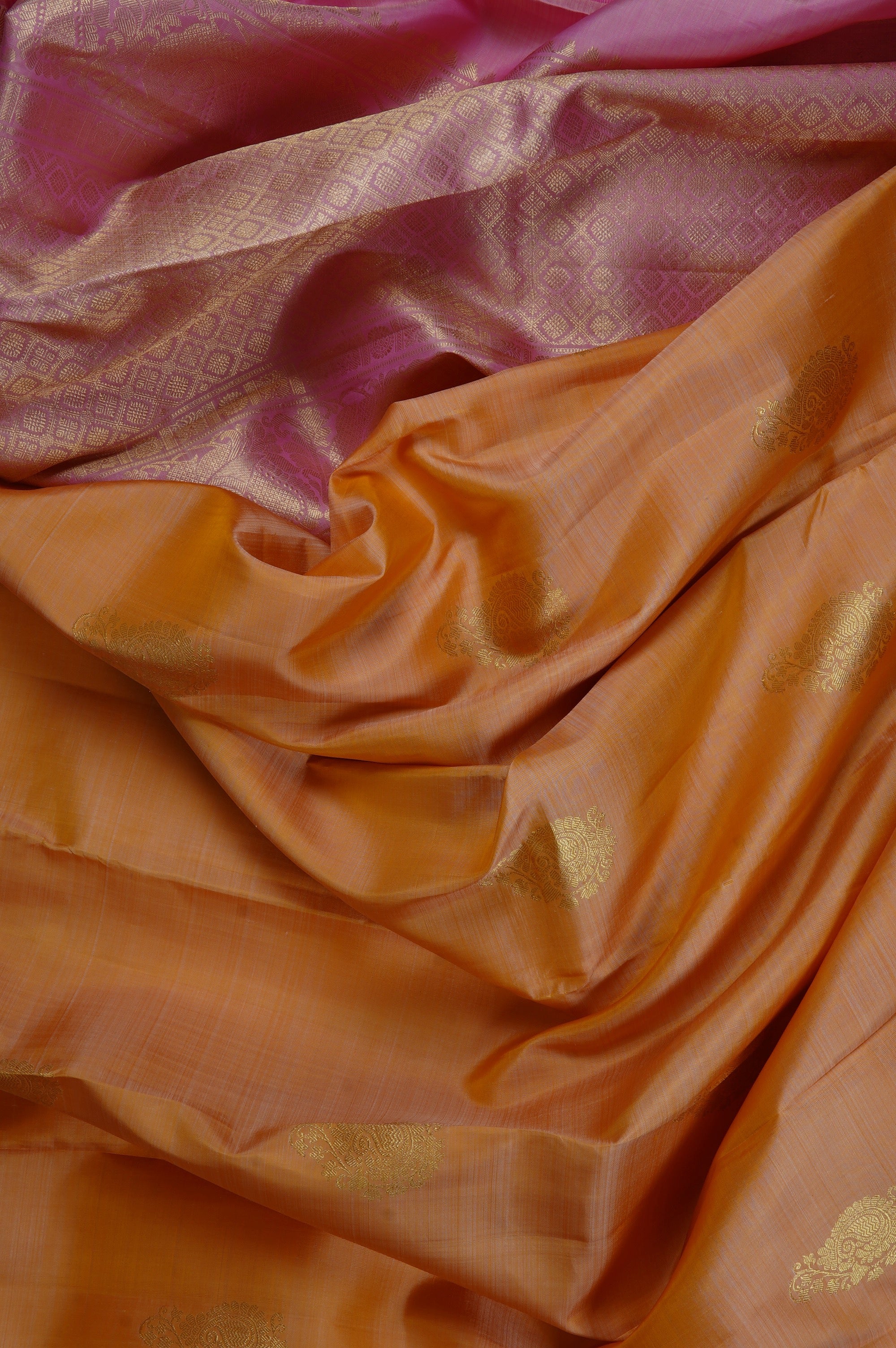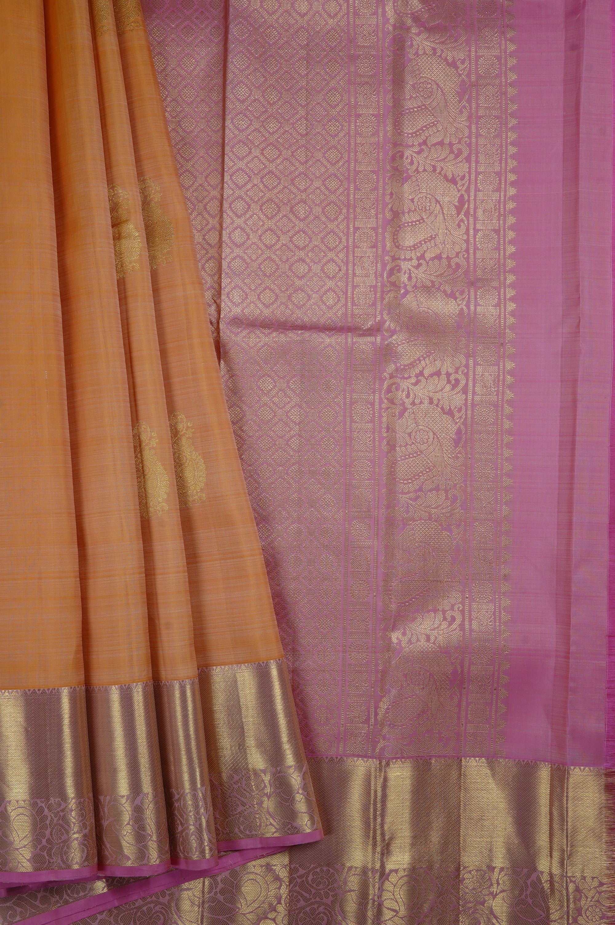 Previous NextCantaloupe Kanchipuram silk saree with elegantly stylised mango bhuttas resembling a traditional motifs woven in gold zari spaced out on the body, with a Turkish rose border starting with a solid band of gold zari, followed by a band of recurring peacock bhuttas. The pallu has a Turkish rose base, filled with small diamond grids, ending with a band of recurring peacock motifs similar to the border woven in gold zari. The saree has a plain Turkish rose blouse with the same border.