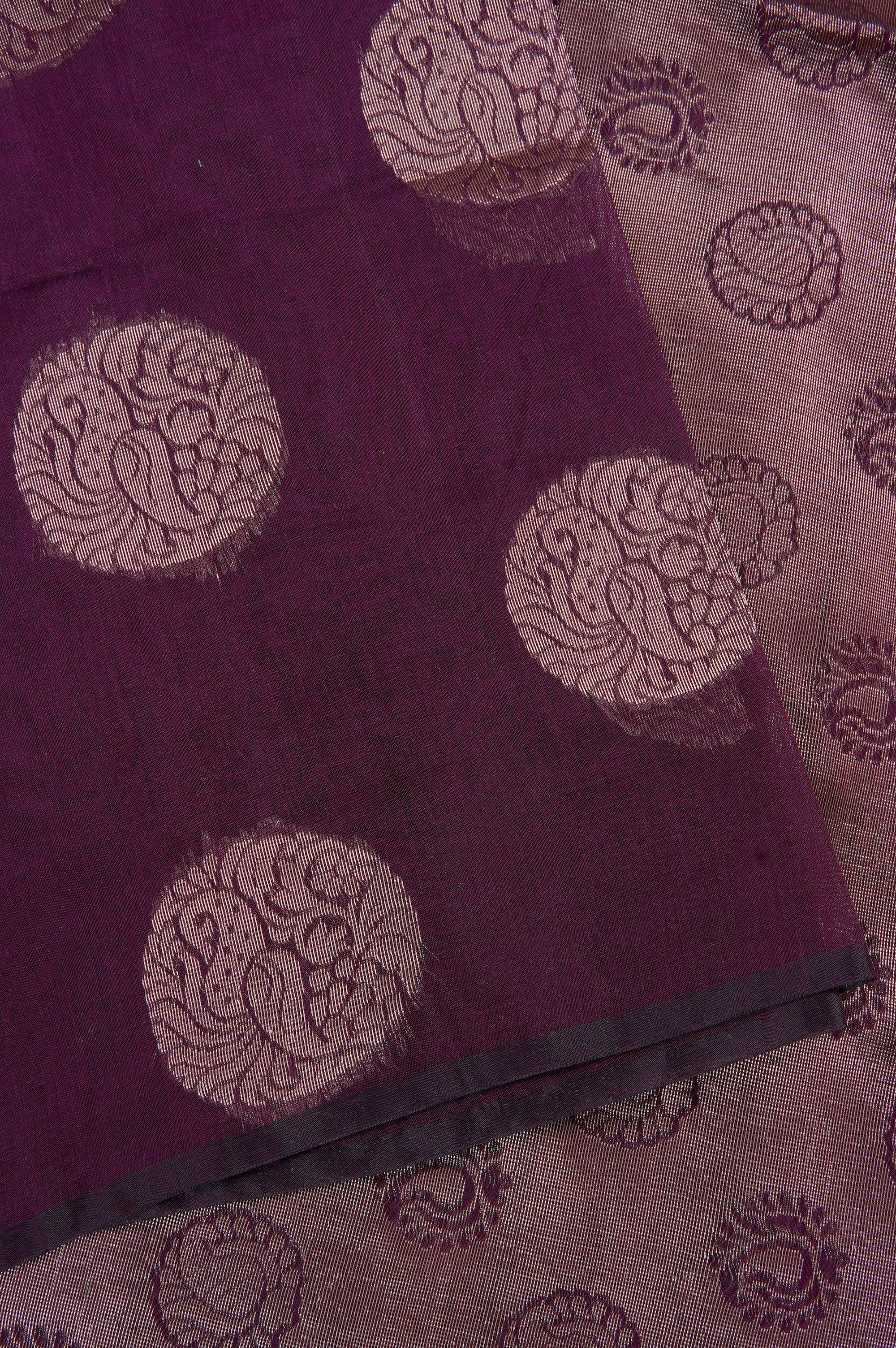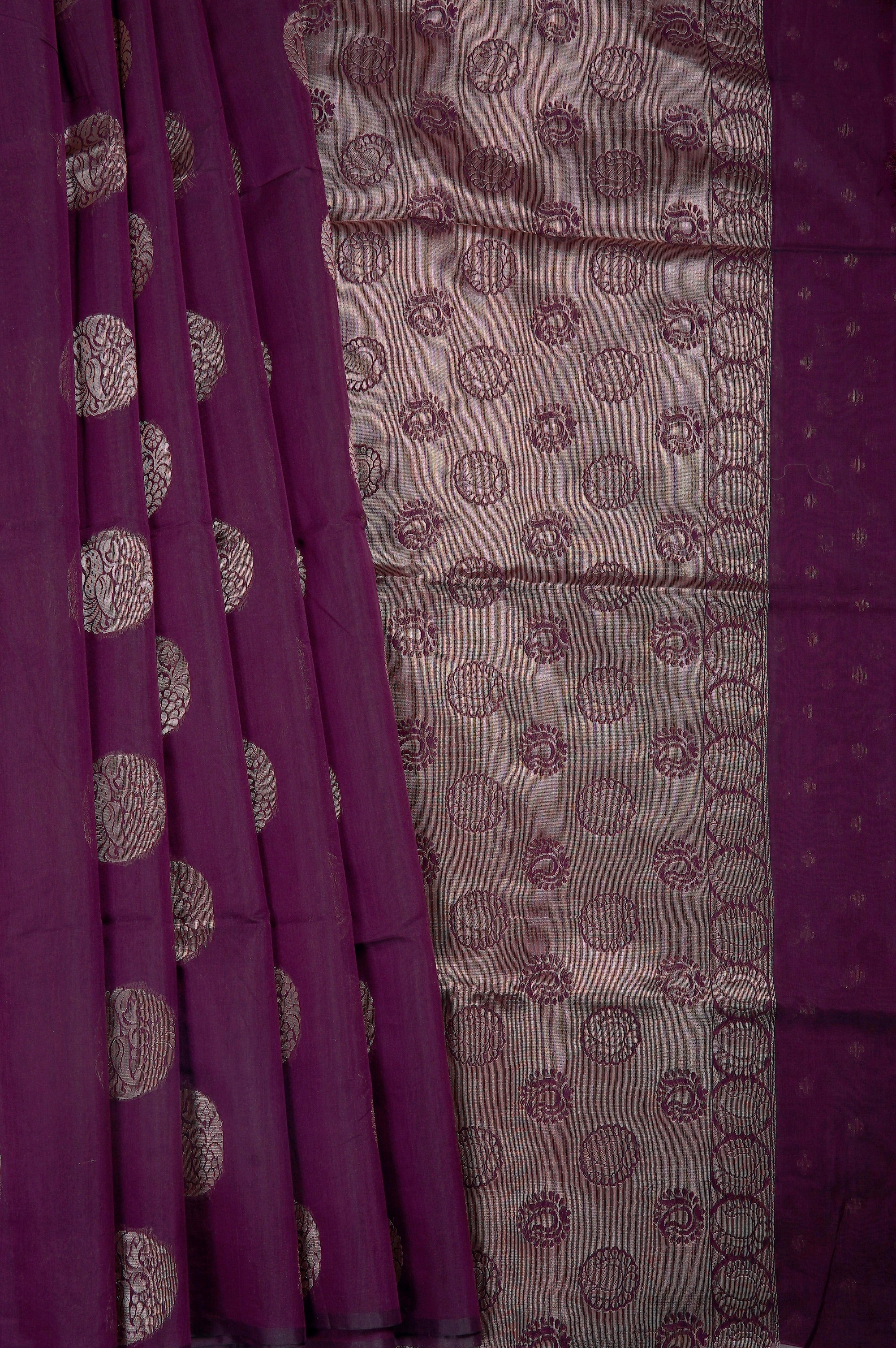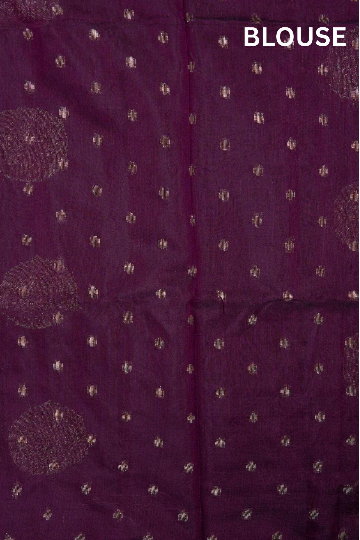 Previous NextWrap yourself in the regal charm of this crimson violet semi-silk cotton saree, a perfect harmony of comfort and opulence. The deep violet body is beautifully adorned with large, stylized zari mango bhuttas in circular frames, woven in gold zari. The pallu features a width of gold filled with small coin shaped bhuttas woven with stylised mango bhuttas. This ensemble is completed with a matching blouse piece accented by subtle, miniature zari bhuttas for a sophisticated finish.