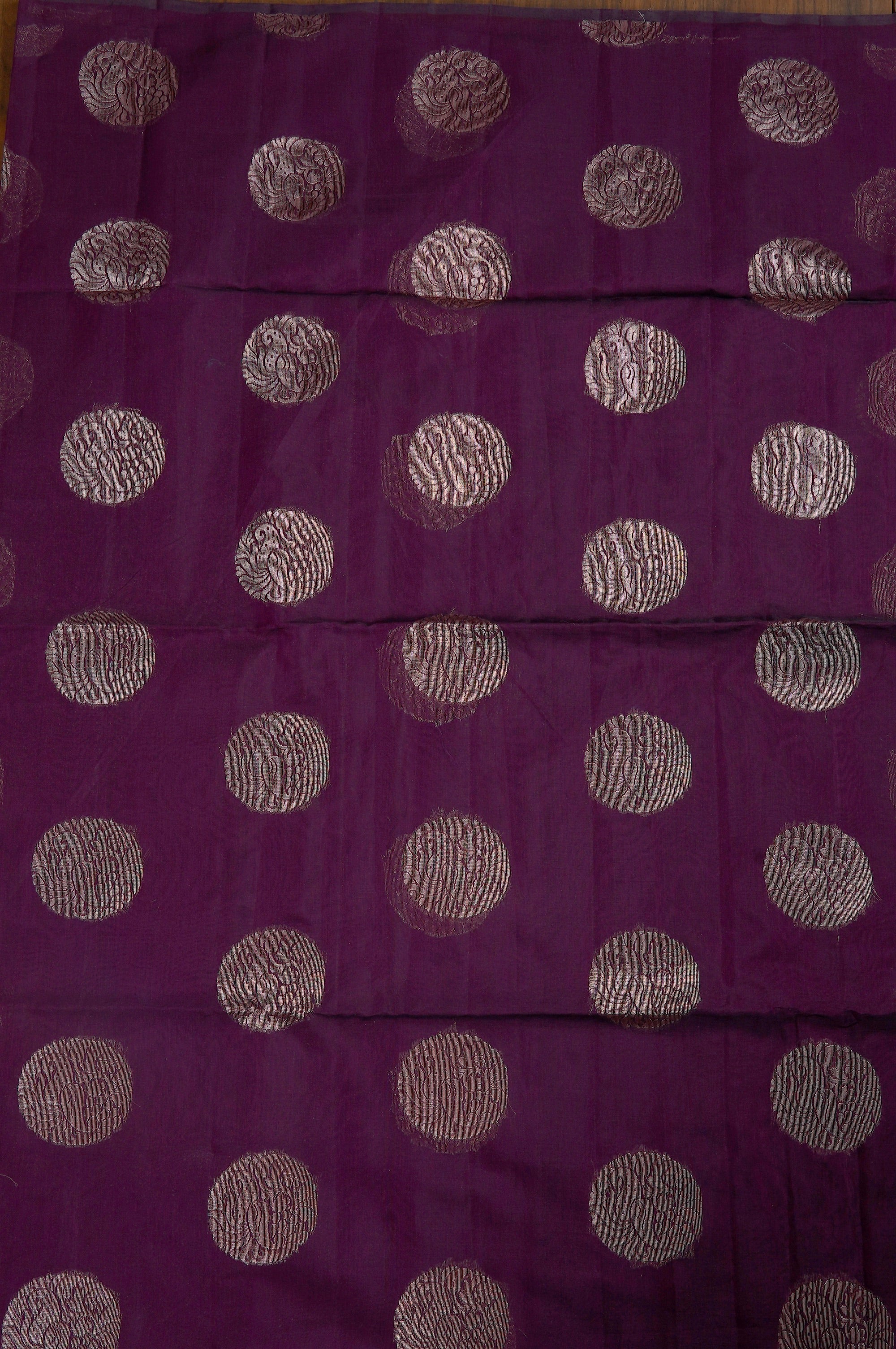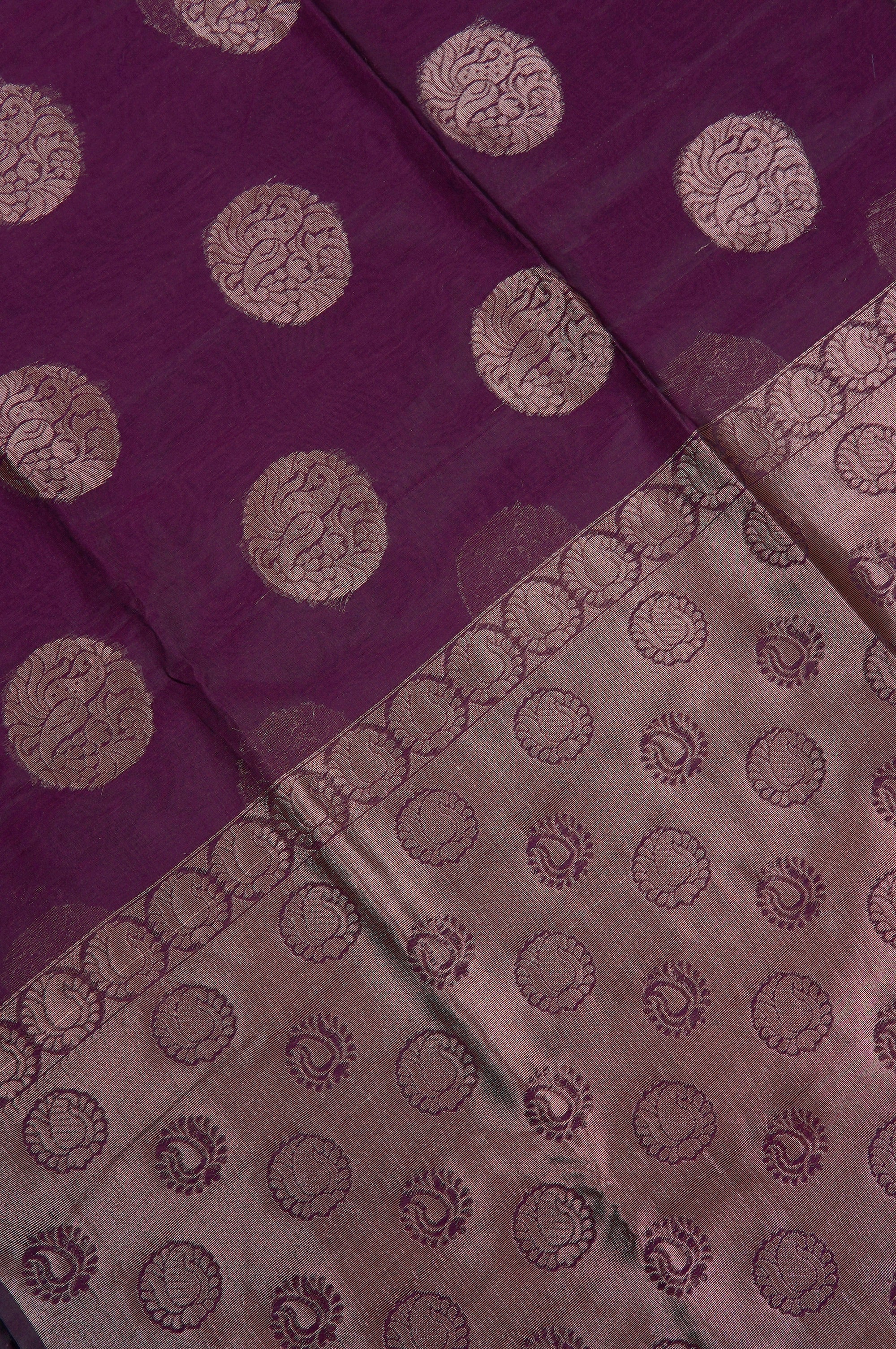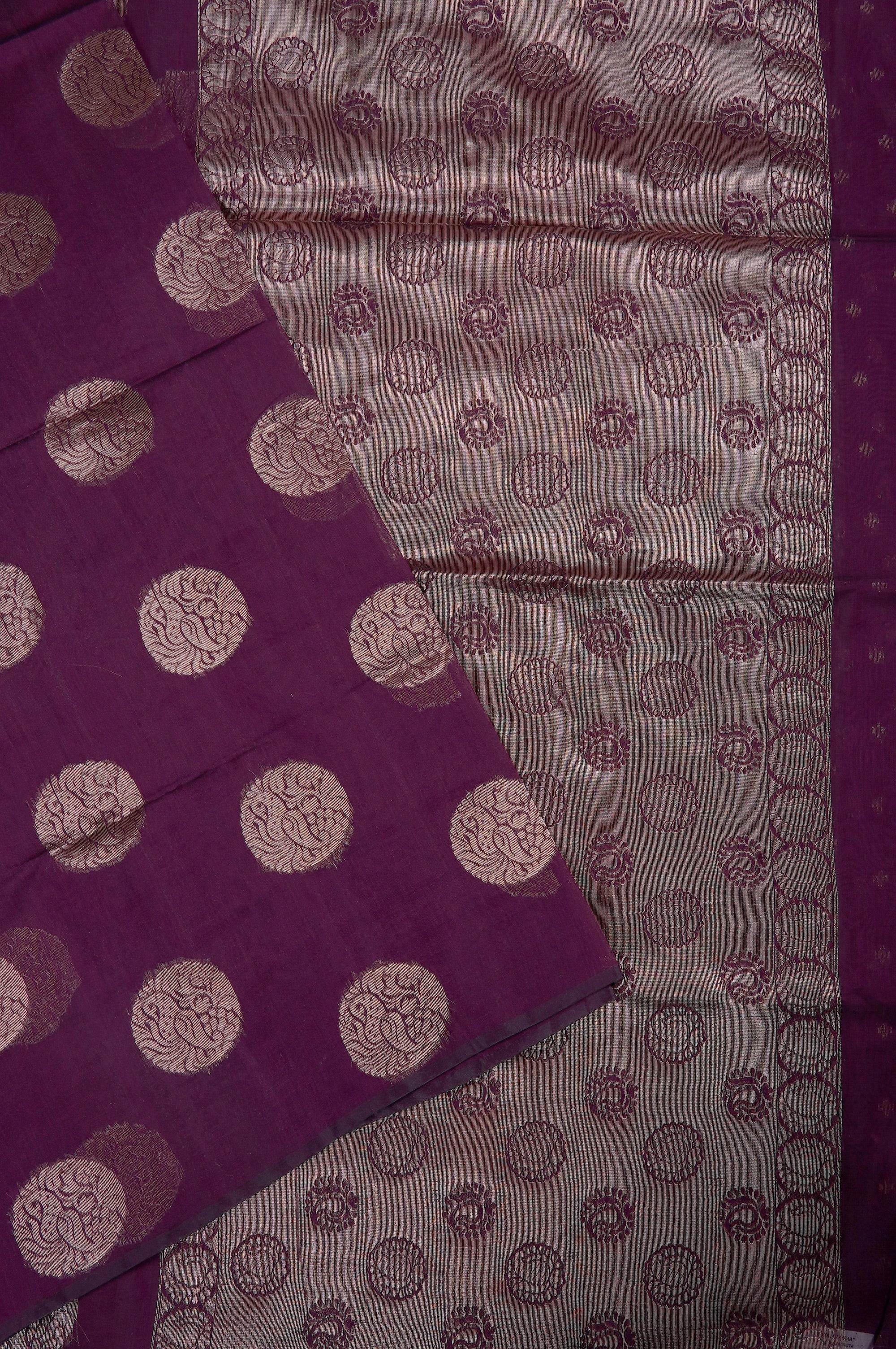 Previous NextWrap yourself in the regal charm of this crimson violet semi-silk cotton saree, a perfect harmony of comfort and opulence. The deep violet body is beautifully adorned with large, stylized zari mango bhuttas in circular frames, woven in gold zari. The pallu features a width of gold filled with small coin shaped bhuttas woven with stylised mango bhuttas. This ensemble is completed with a matching blouse piece accented by subtle, miniature zari bhuttas for a sophisticated finish.