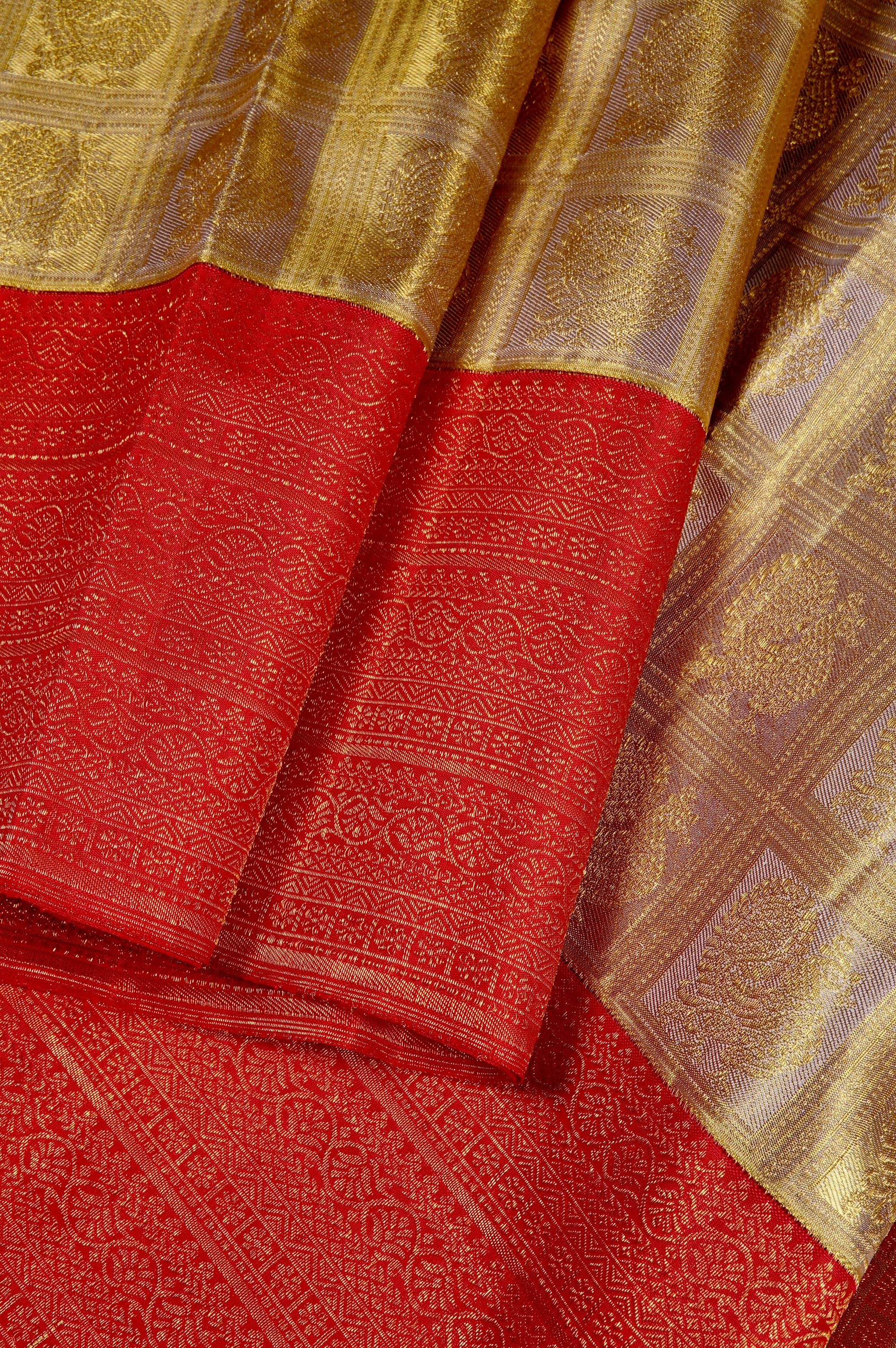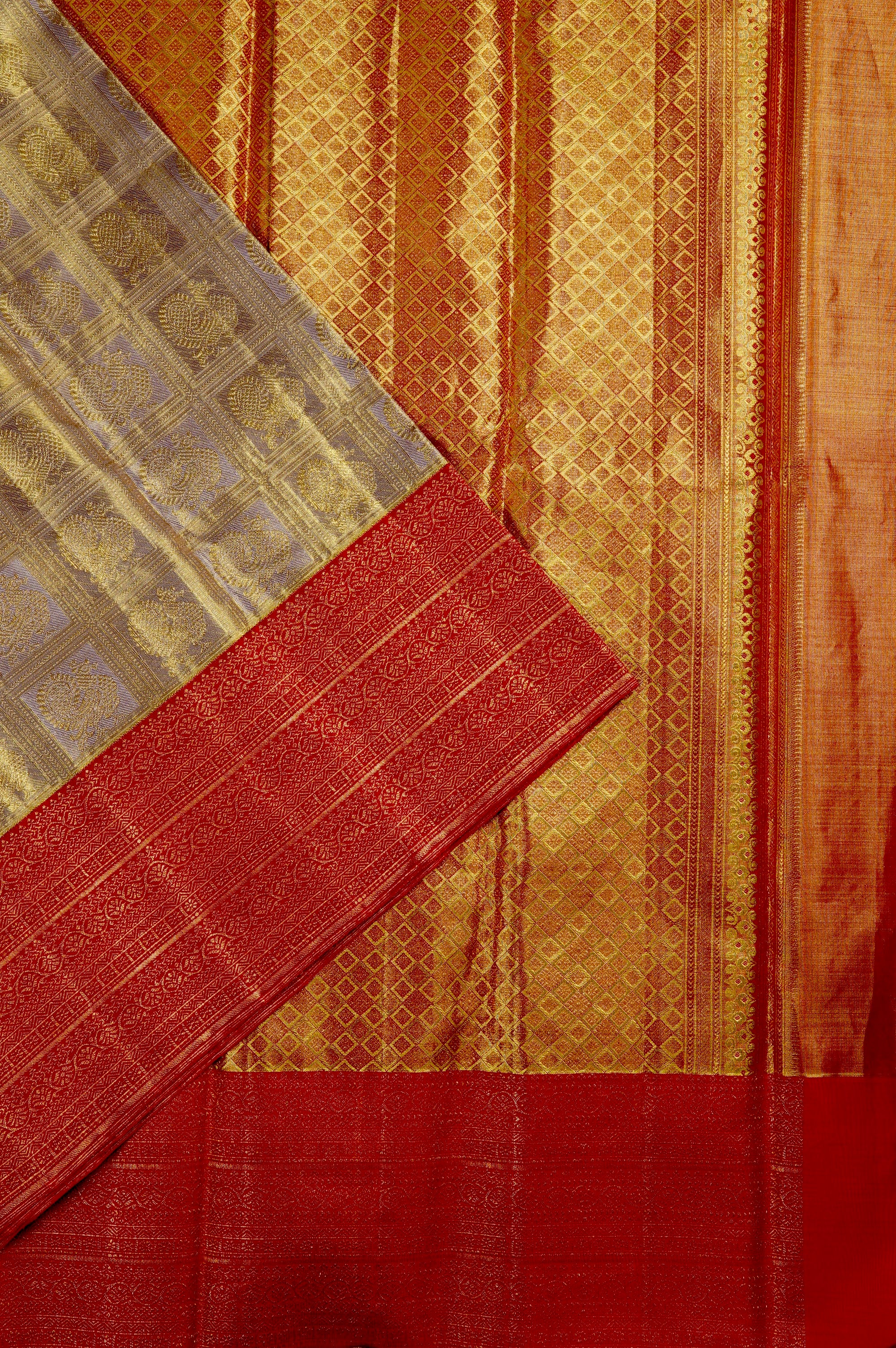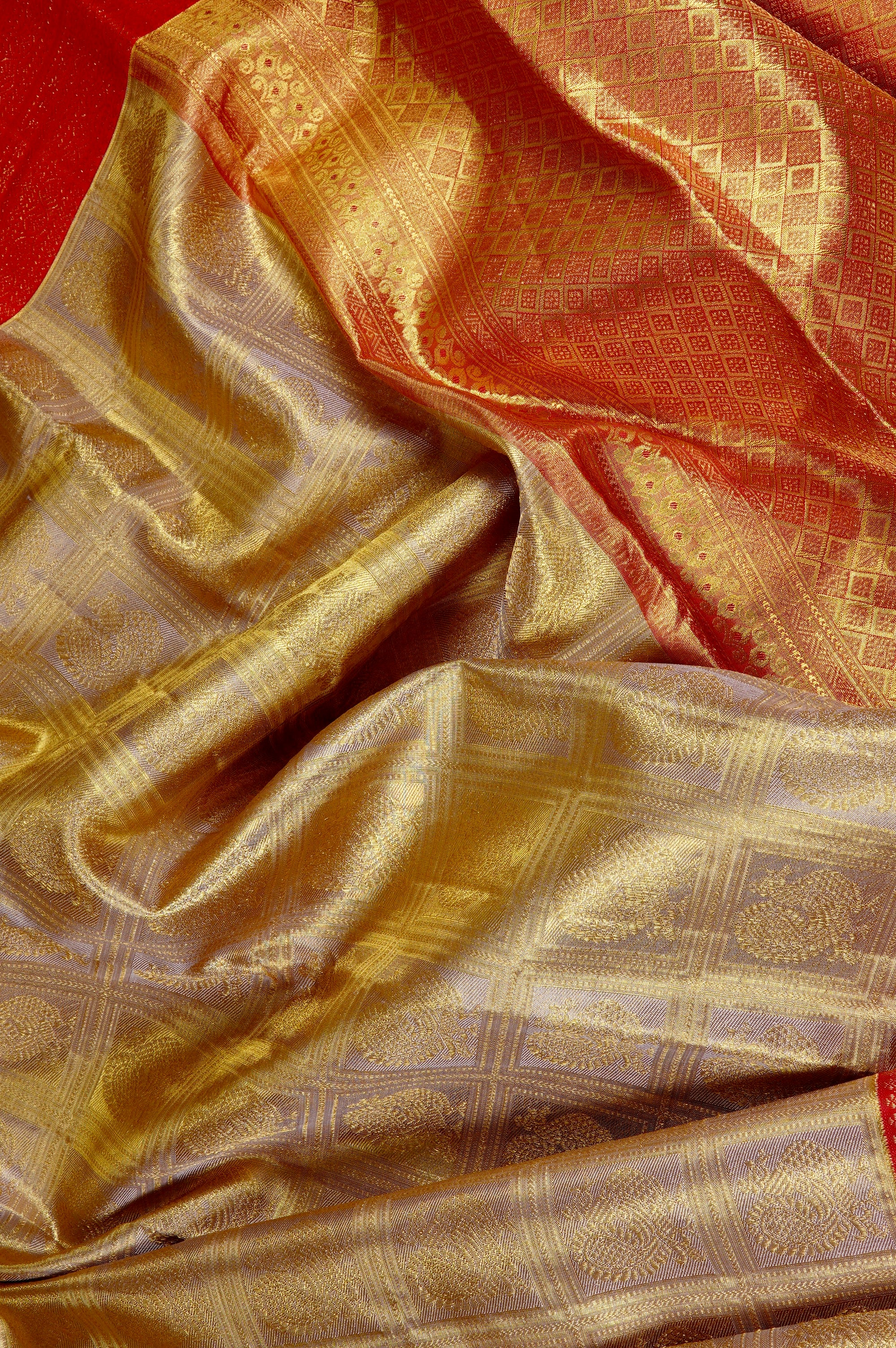 Previous NextA grand gold Kanchipuram silk saree filled with perfect square grids, each tile holding a peacock motif in alternating silver and gold zari background, with a bright red border filled with intricate bands of traditional motifs woven in gold zari. The pallu has a bright red base filled with bold and intricate gold zari grids, followed by bands of smaller motifs, making it look like an almost bright orange color under the mixture of red and gold. The saree has a red-gold dual shade blouse with the same border.