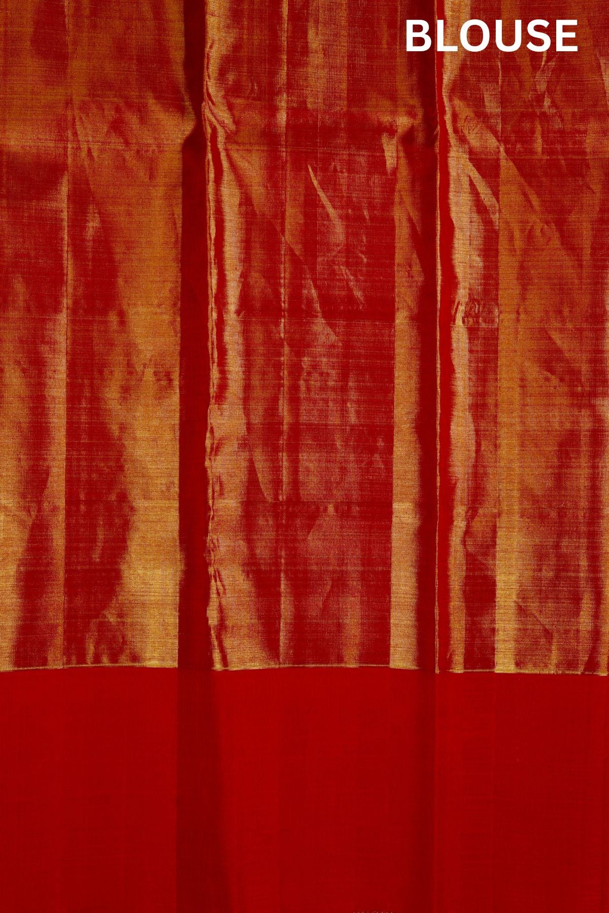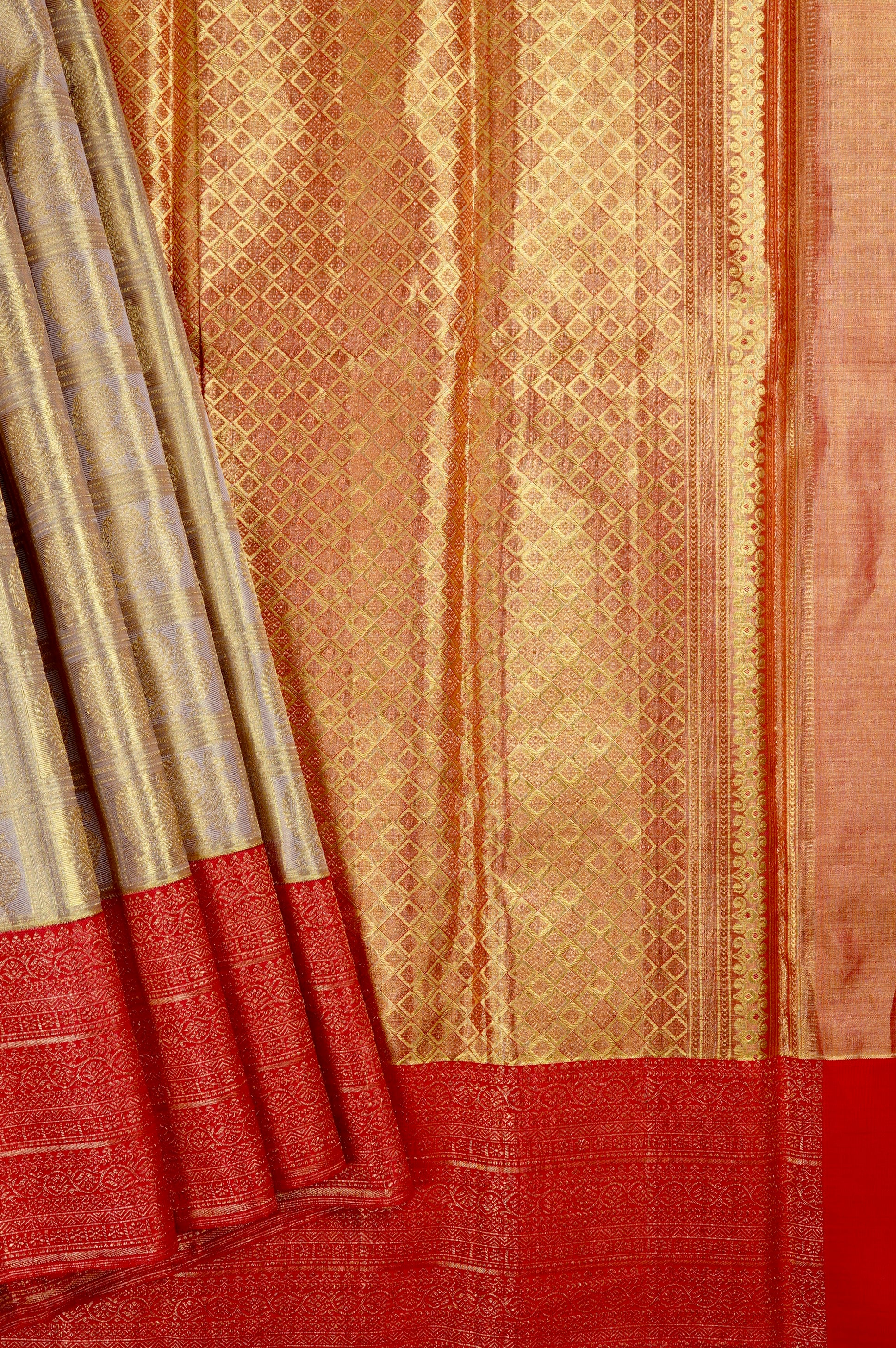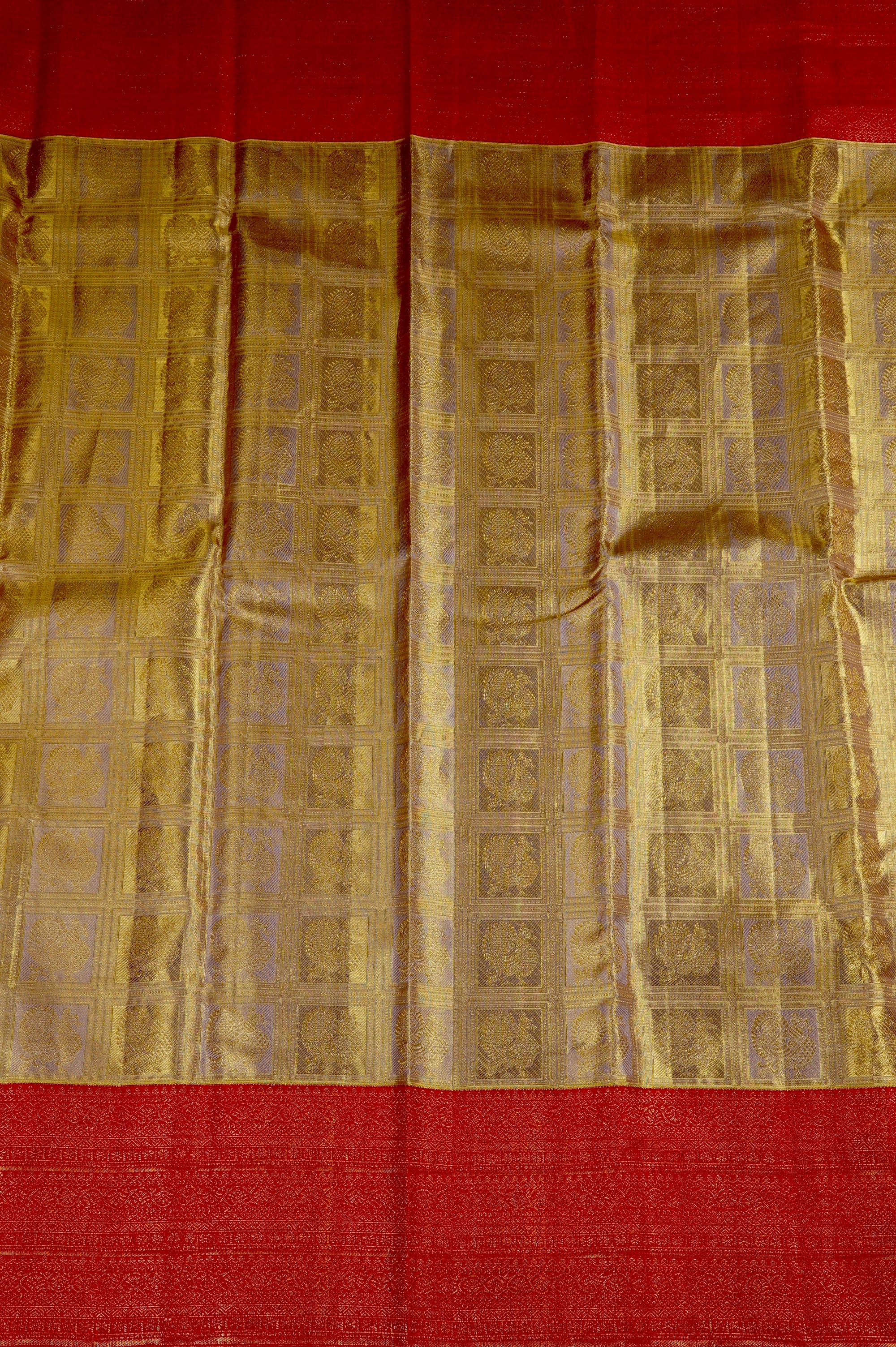 Previous NextA grand gold Kanchipuram silk saree filled with perfect square grids, each tile holding a peacock motif in alternating silver and gold zari background, with a bright red border filled with intricate bands of traditional motifs woven in gold zari. The pallu has a bright red base filled with bold and intricate gold zari grids, followed by bands of smaller motifs, making it look like an almost bright orange color under the mixture of red and gold. The saree has a red-gold dual shade blouse with the same border.