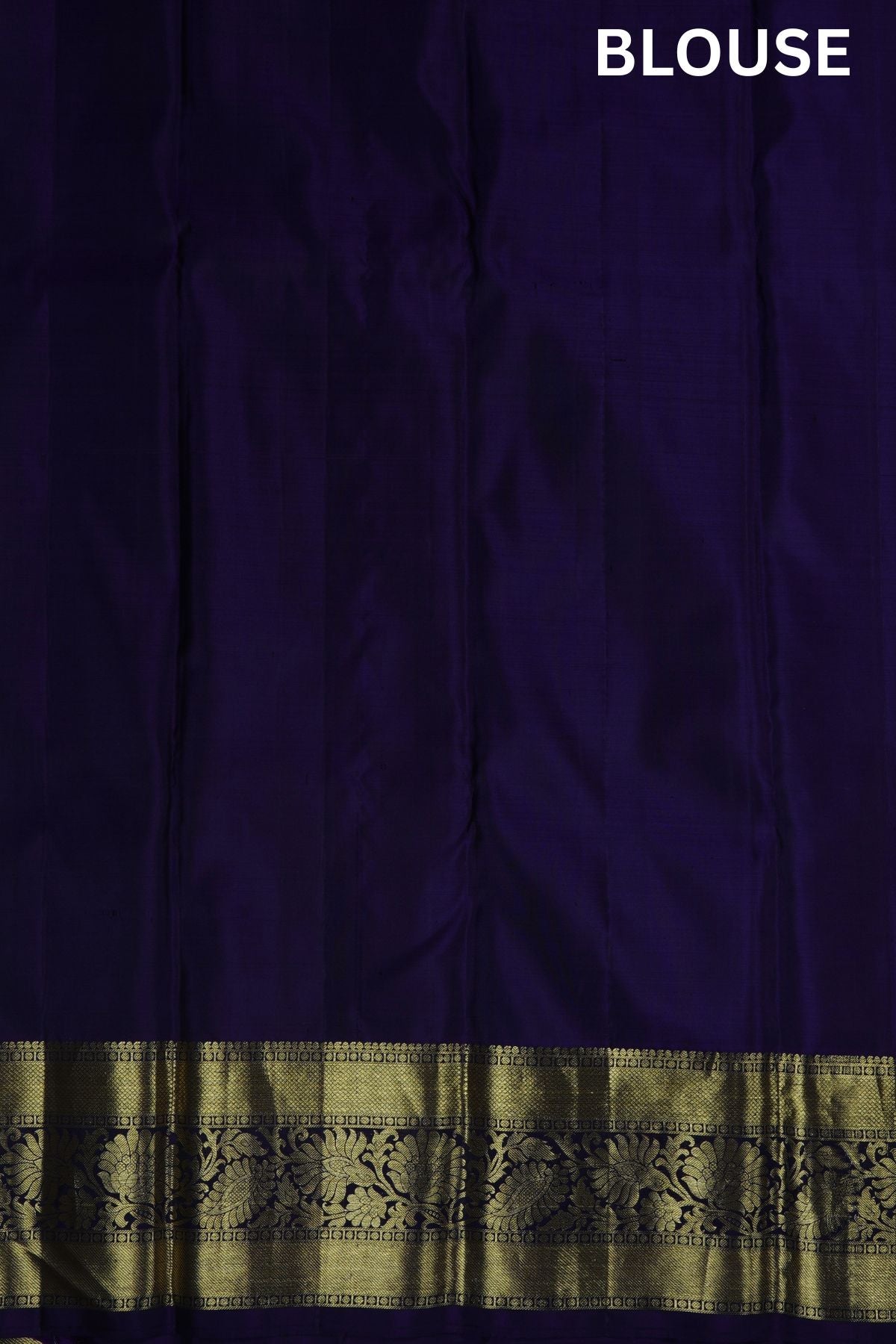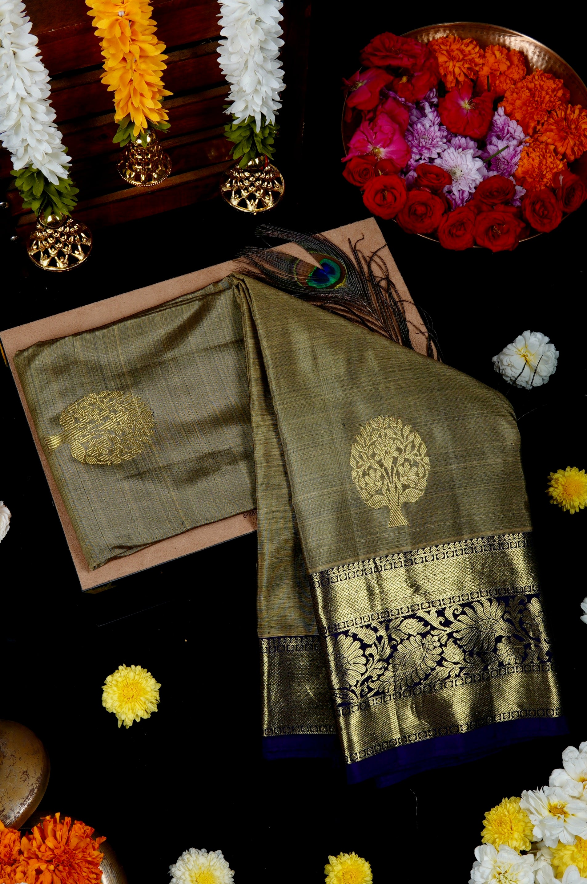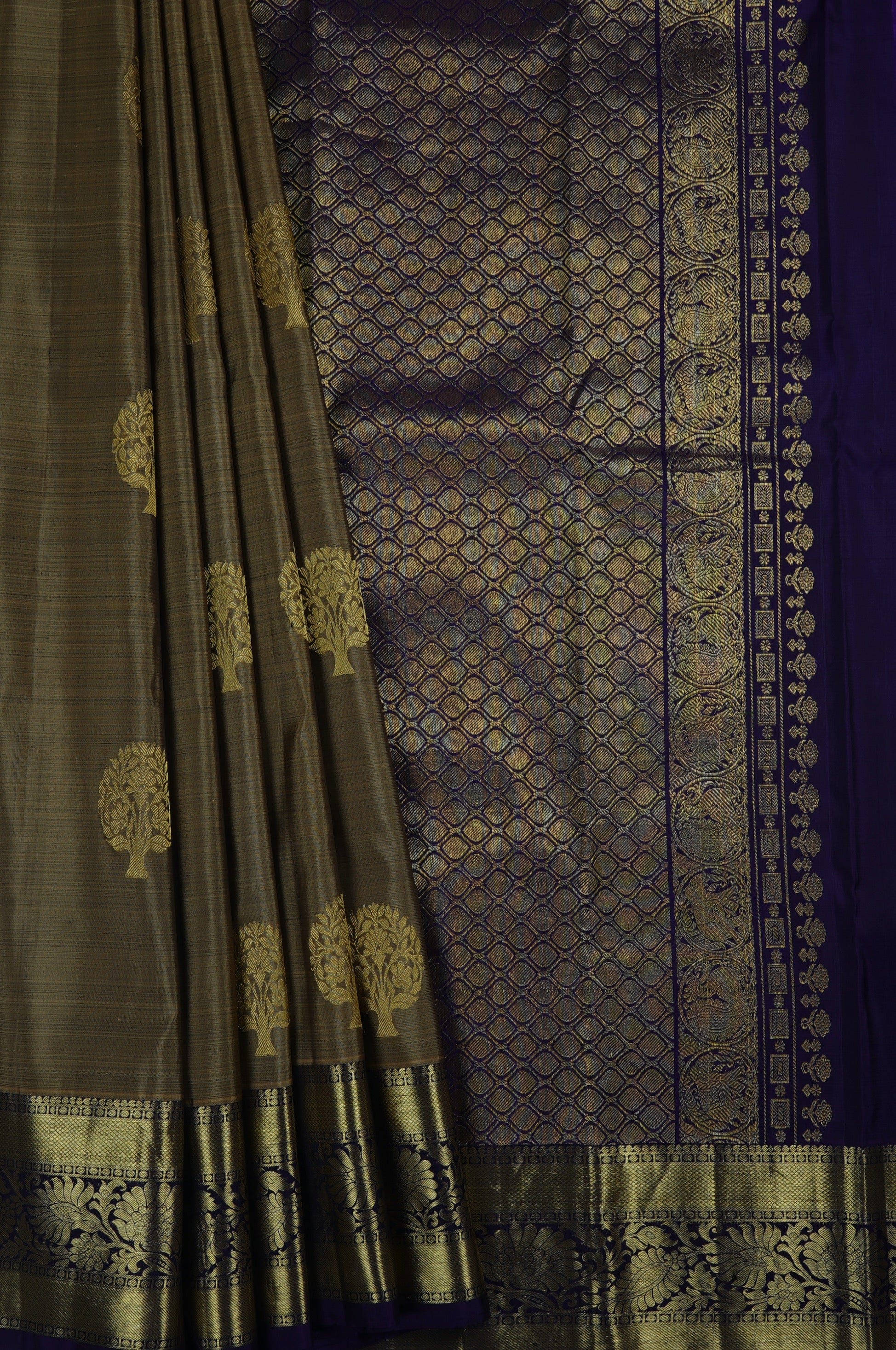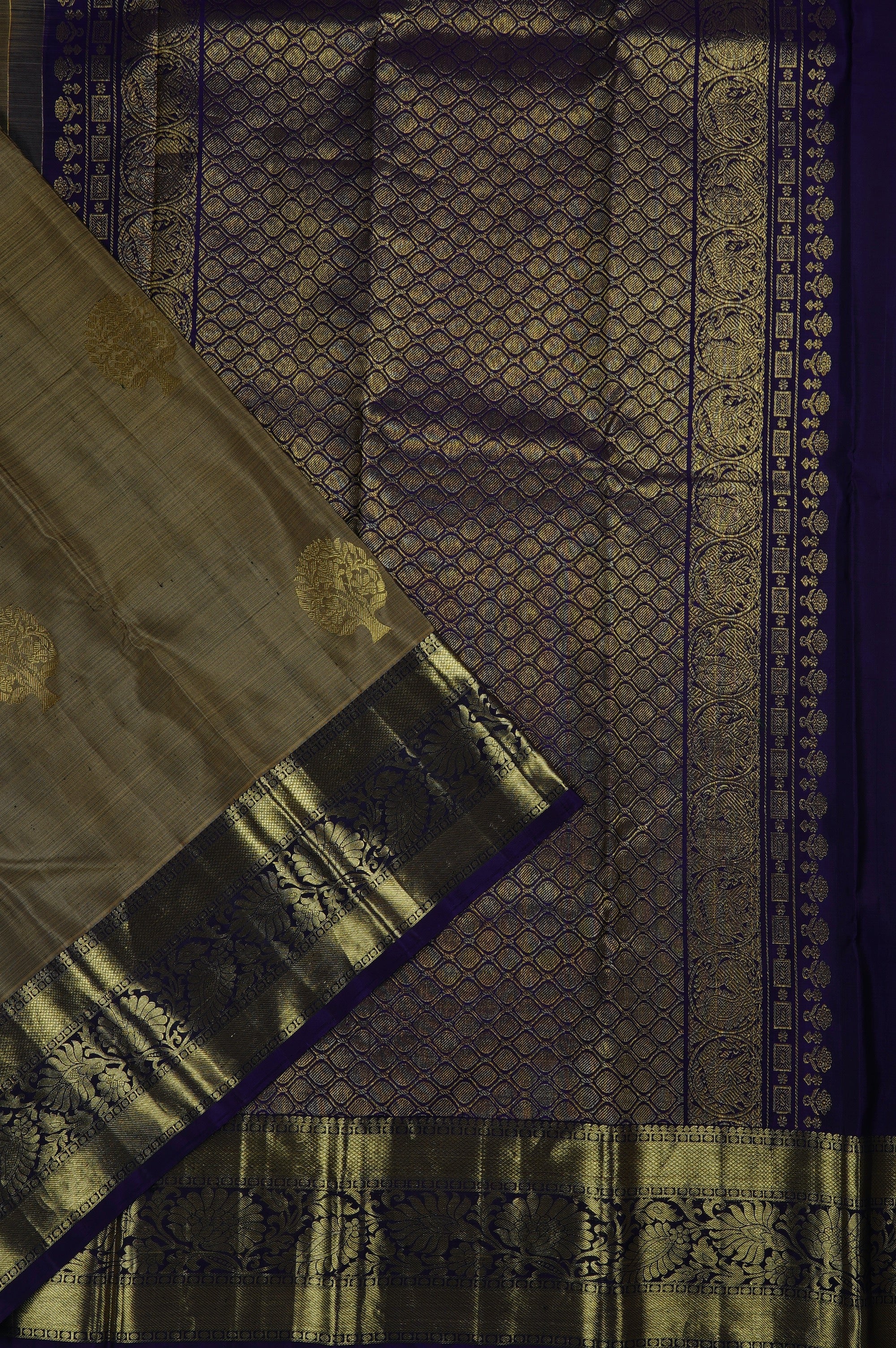 Previous NextA Lisbon brown Kanchipuram silk saree aligning with a vintage aesthetic holding small tree motifs woven throughout the body in gold zari, with a thick and elegant midnight blue border, holding a band filled with florals bordered by two bands of gold zari. The pallu has a midnight blue base starting with a wide expanse of jaal pattern, followed by a band of large circular frames holding elephant motifs woven in gold zari. The saree has a plain midnight blue blouse with the same border.