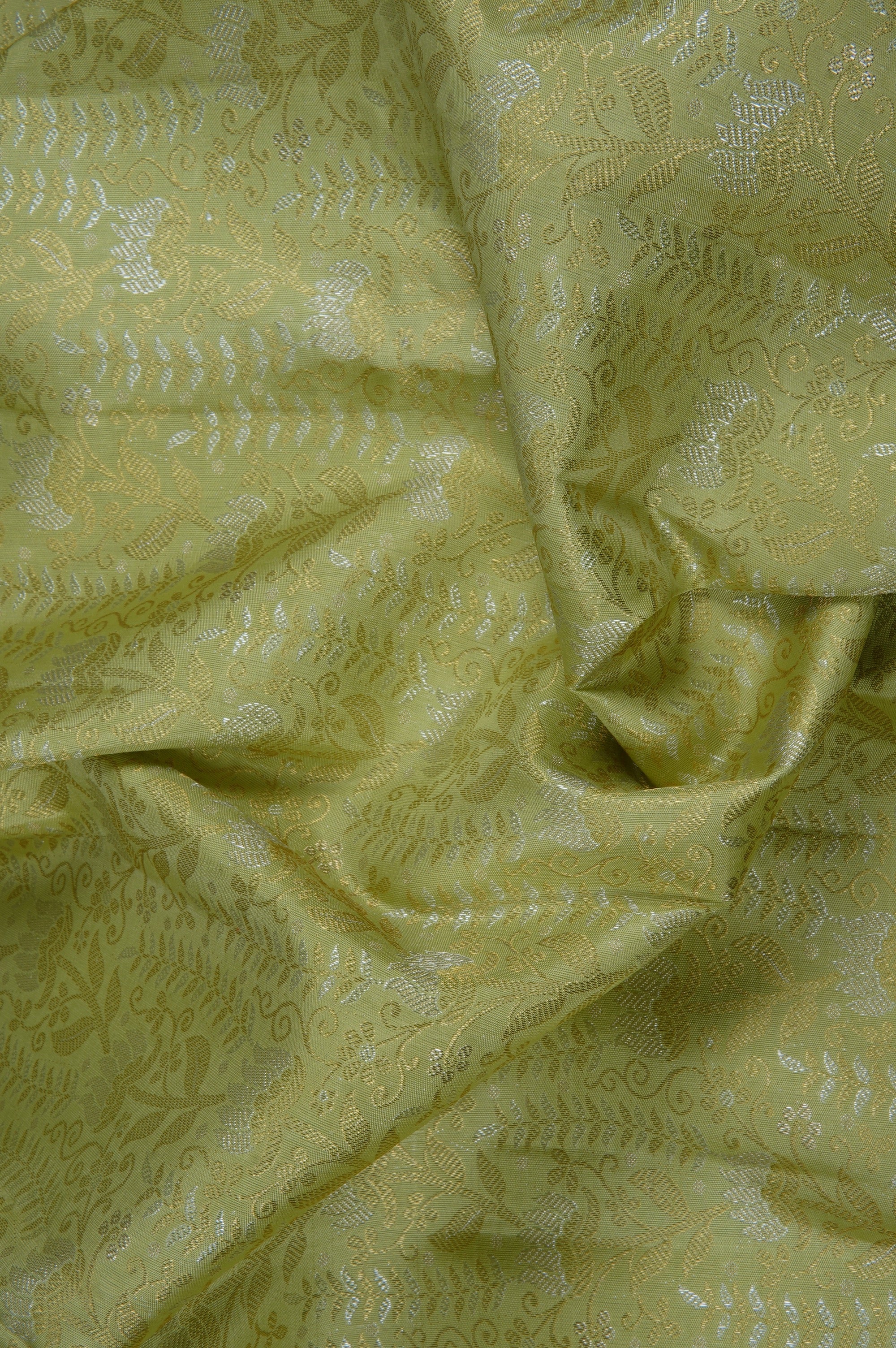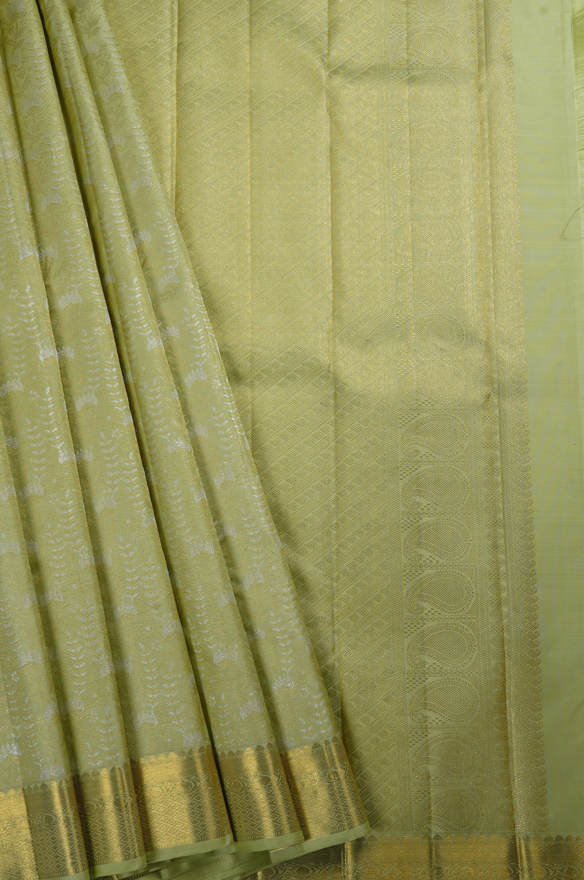 Previous NextMoss green Kanchipuram silk saree with beautiful jasmine vines and floral plants woven in gold and silver zari throughout the body, with a bold border including a band of zari and Kodi pattern, ending with a diamond grid woven in gold. The pallu starts with alternating diagonal bands of leaf motifs and gold stripes, ending with a thick band of recurring mango bhuttas woven in gold zari. The saree has a solid moss green blouse with the same border.