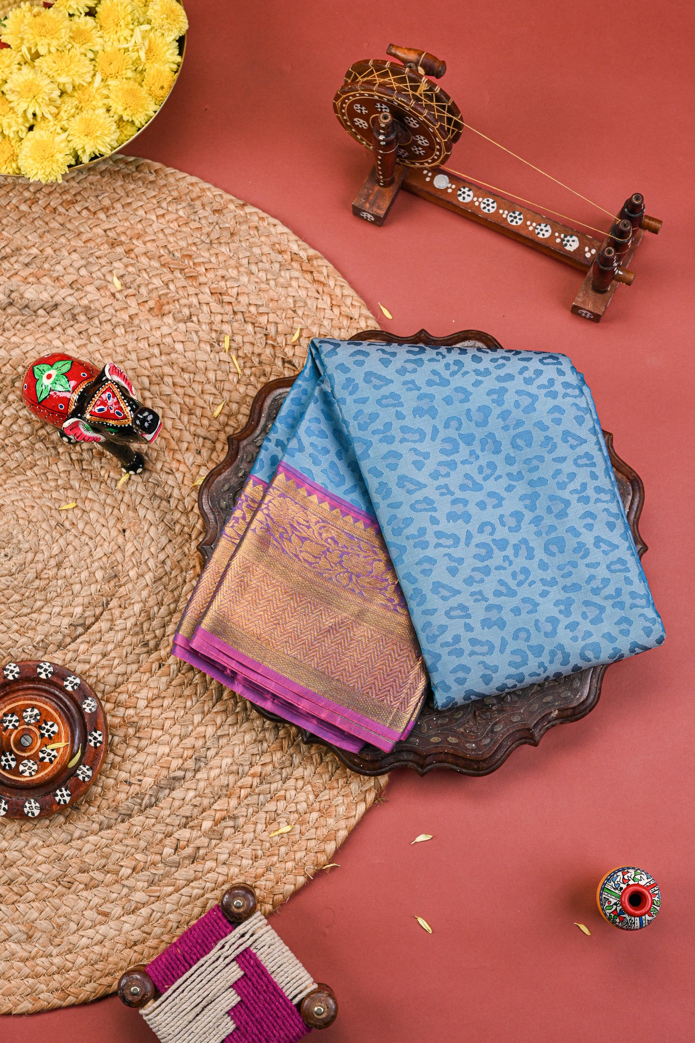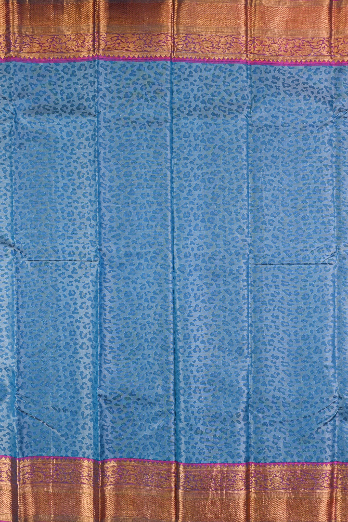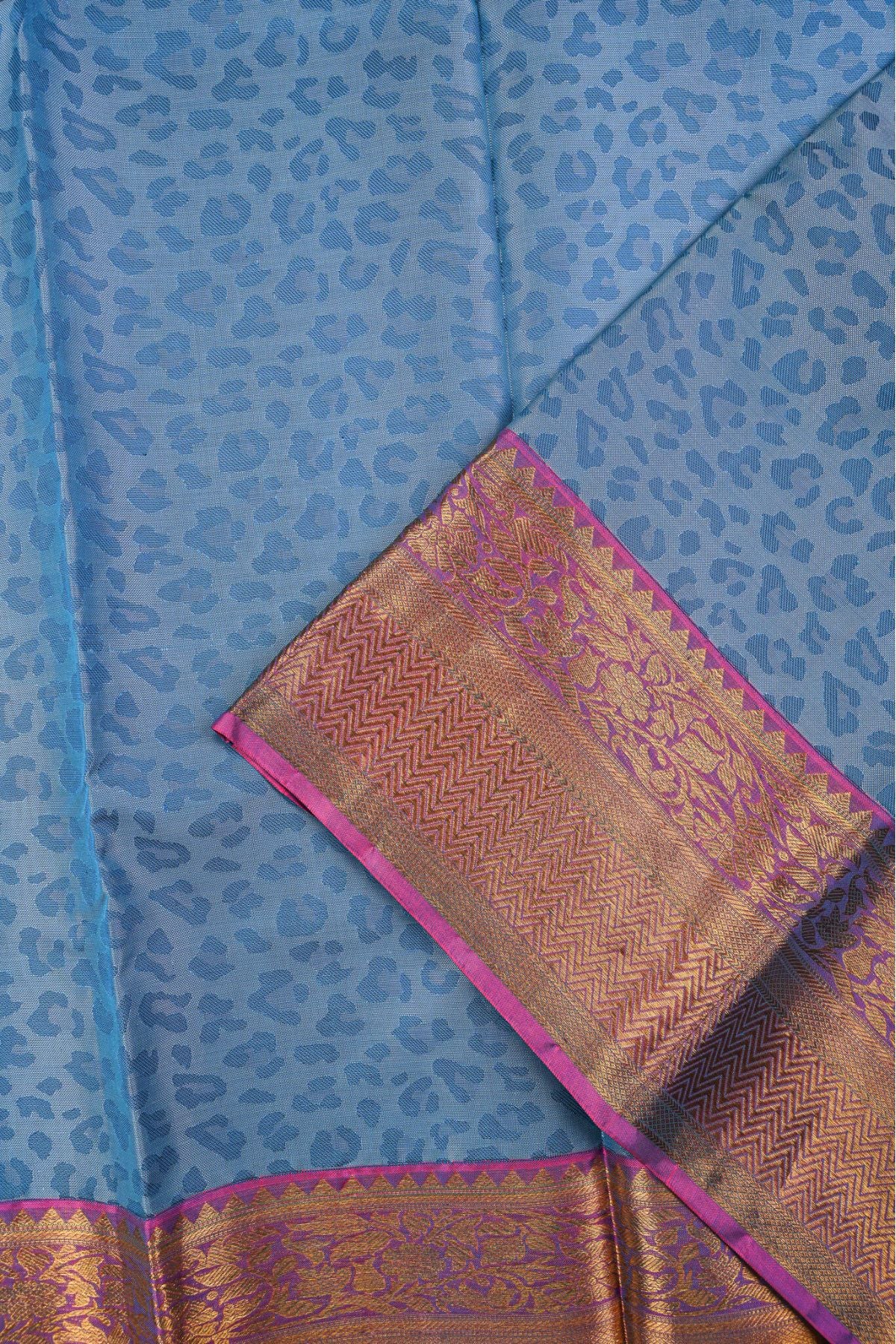 Navy blue kanchipuram silk saree with leopard inspired patterns woven across the body as self-embossed work paired with a gold zari border.