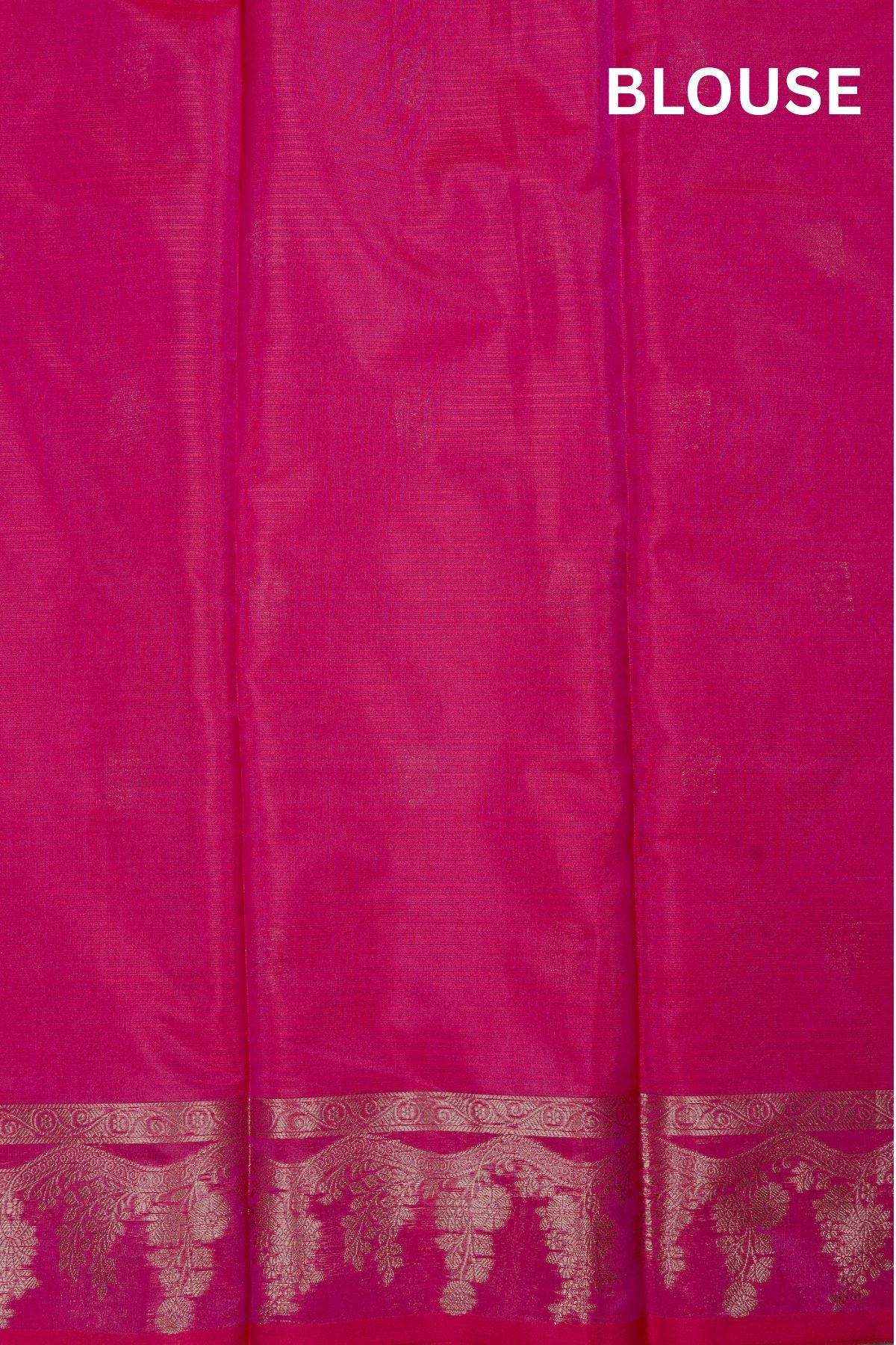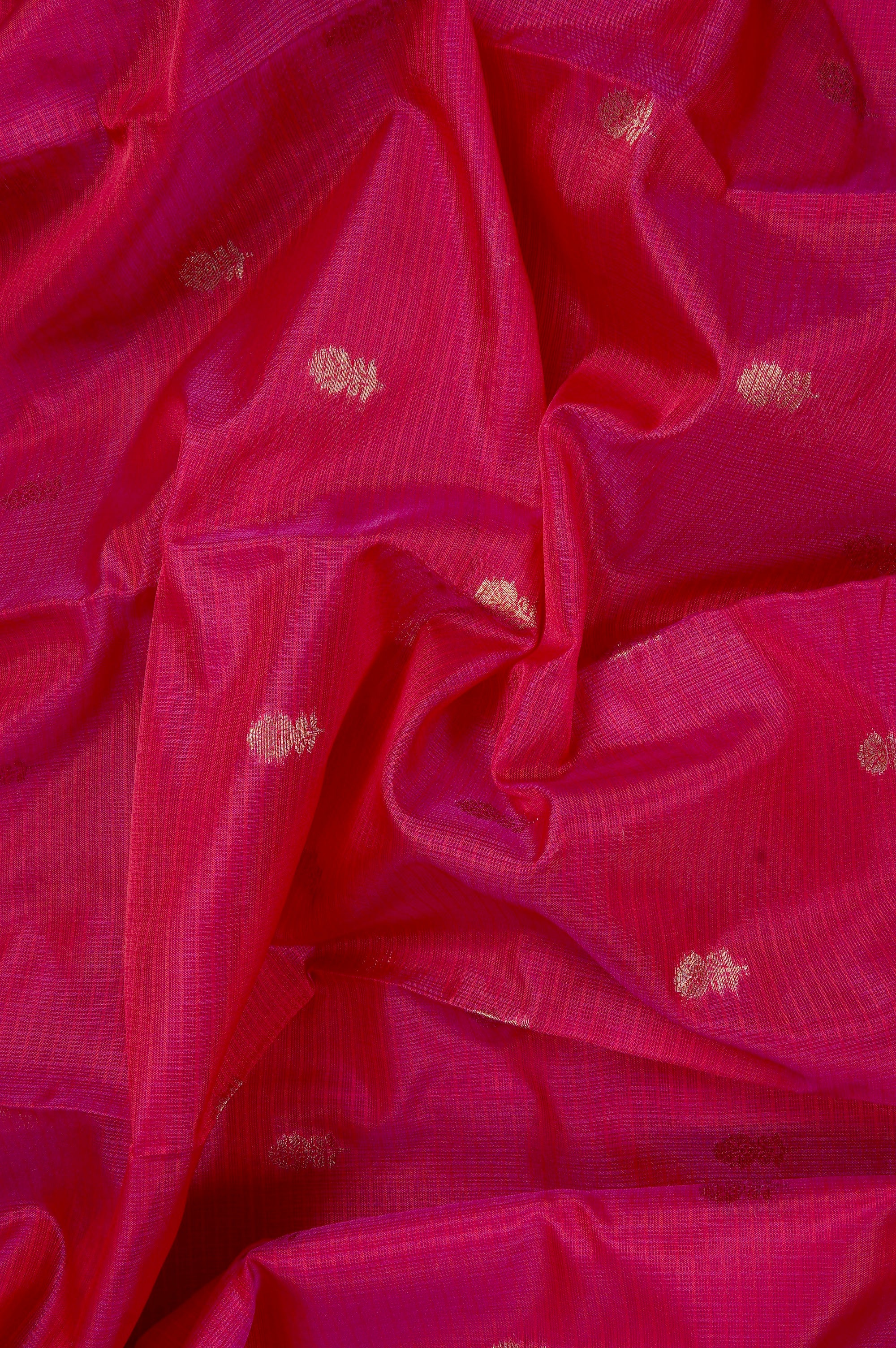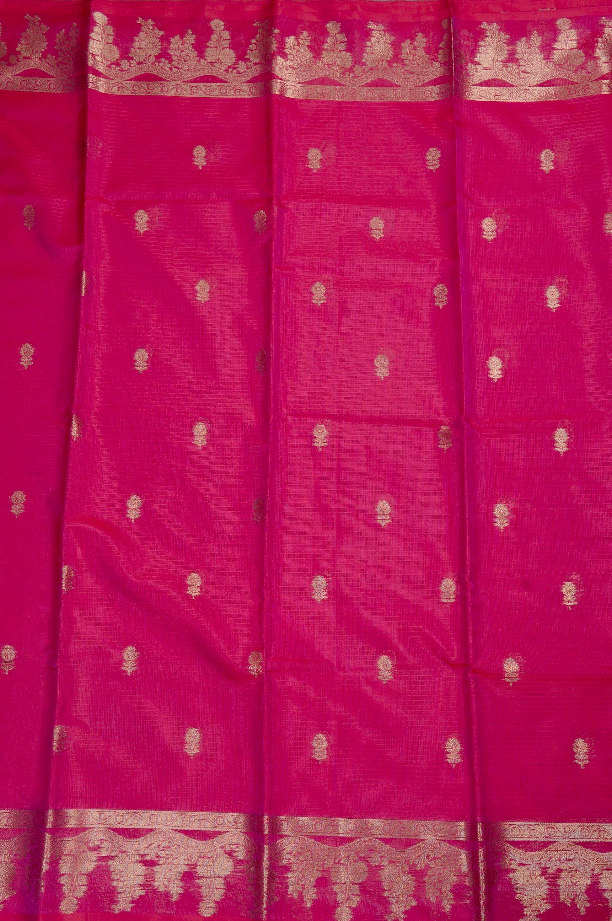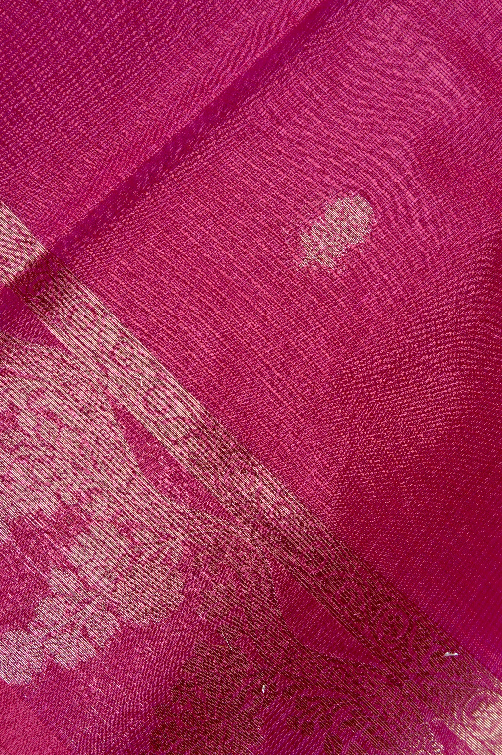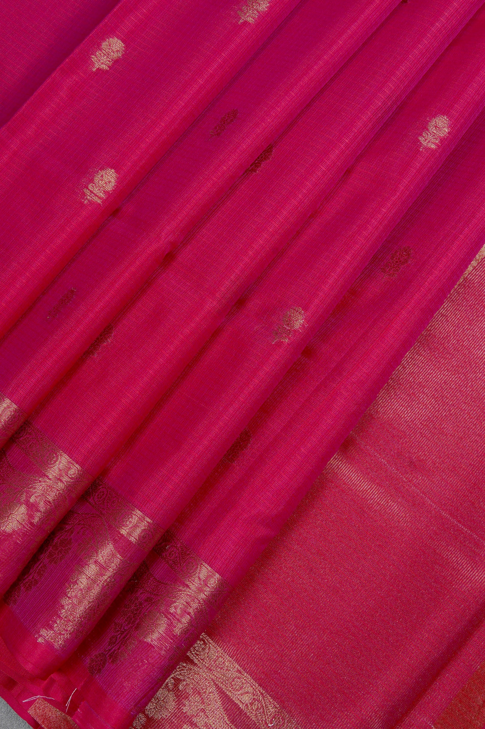 Previous NextA bold rani pink supernet saree with a body enhanced by small flower bhuttas spread along its width in gold, leading to a unique minimal border. It starts with a simple band of small motifs, giving way to a thick wave holding florals and plants, woven in gold zari. The body transitions into a traditional Seer Mundhi pallu woven in rich gold zari.