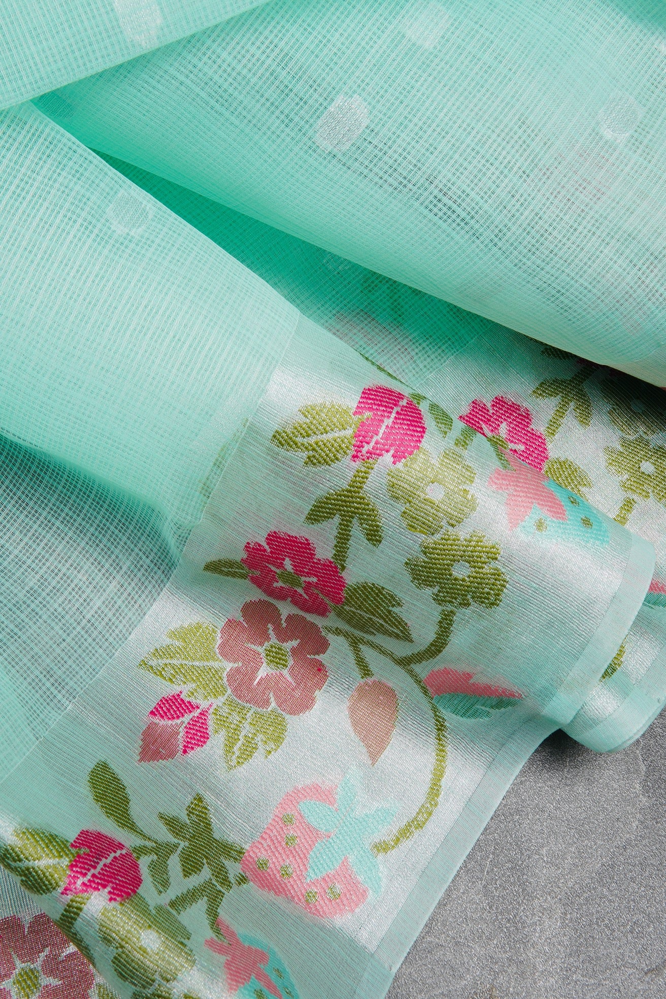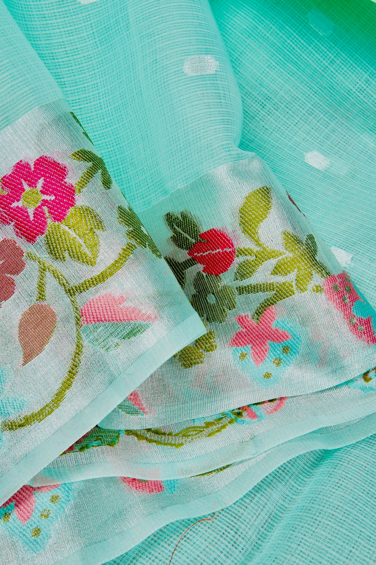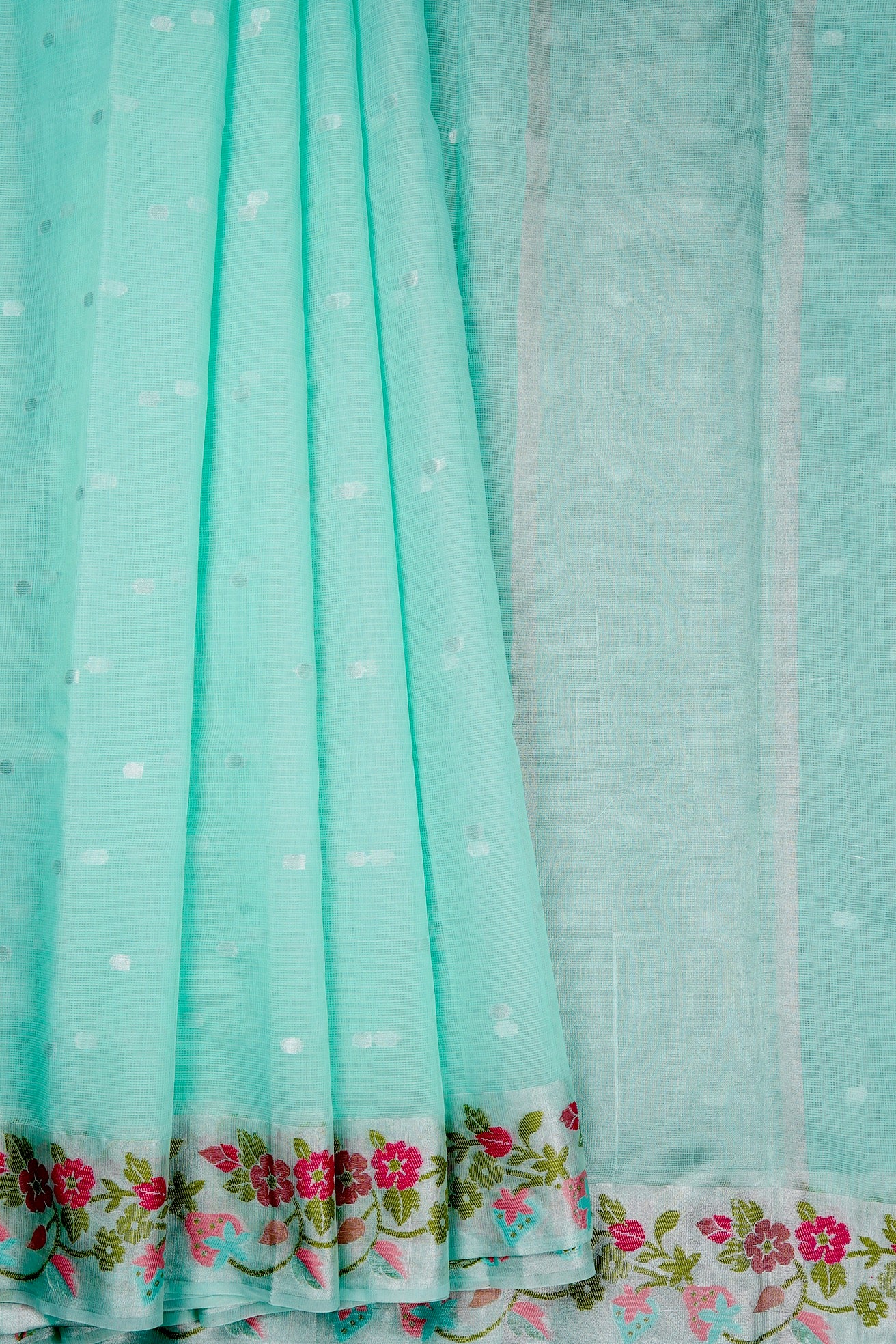 Previous NextTurquoise blue supernet saree with polka dots woven in silver zari throughout the body and a thick border with buds, leaves and floral motifs woven in green, pink and carmine. The pallu has a wide band of mild silver zari.