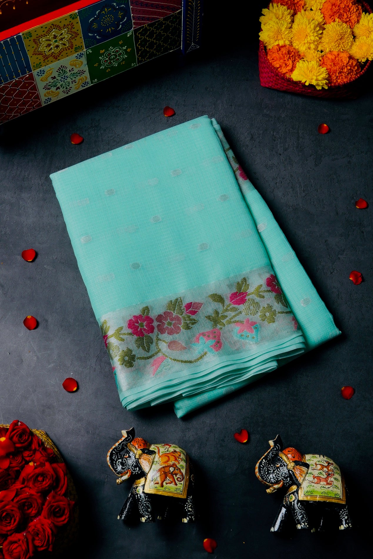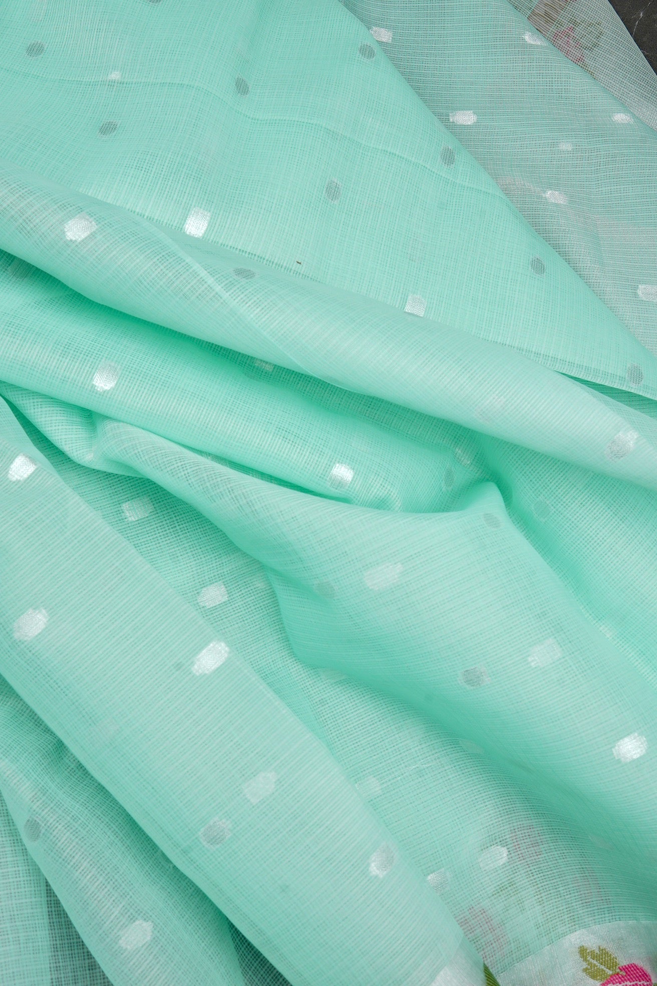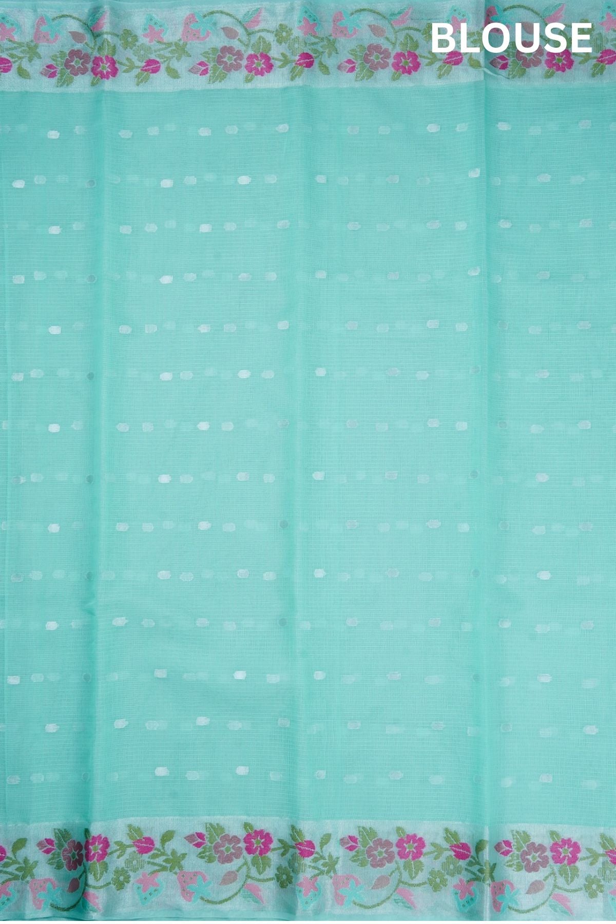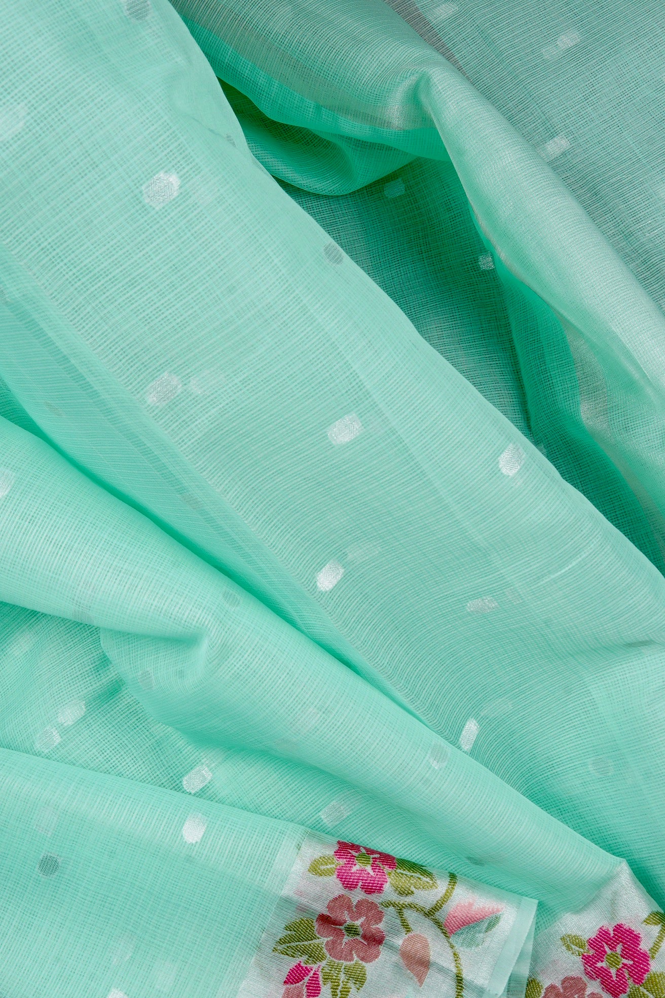 Previous NextTurquoise blue supernet saree with polka dots woven in silver zari throughout the body and a thick border with buds, leaves and floral motifs woven in green, pink and carmine. The pallu has a wide band of mild silver zari.