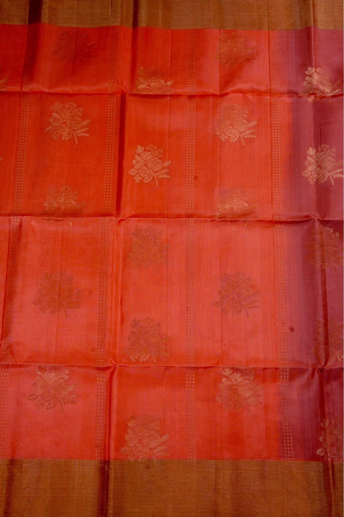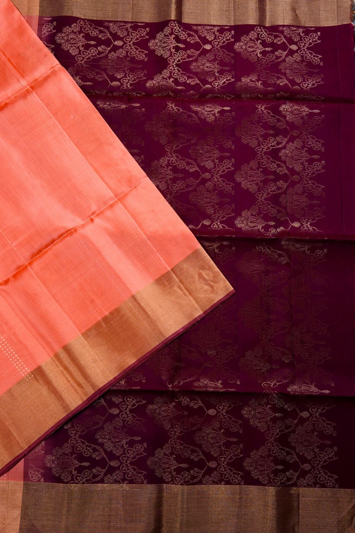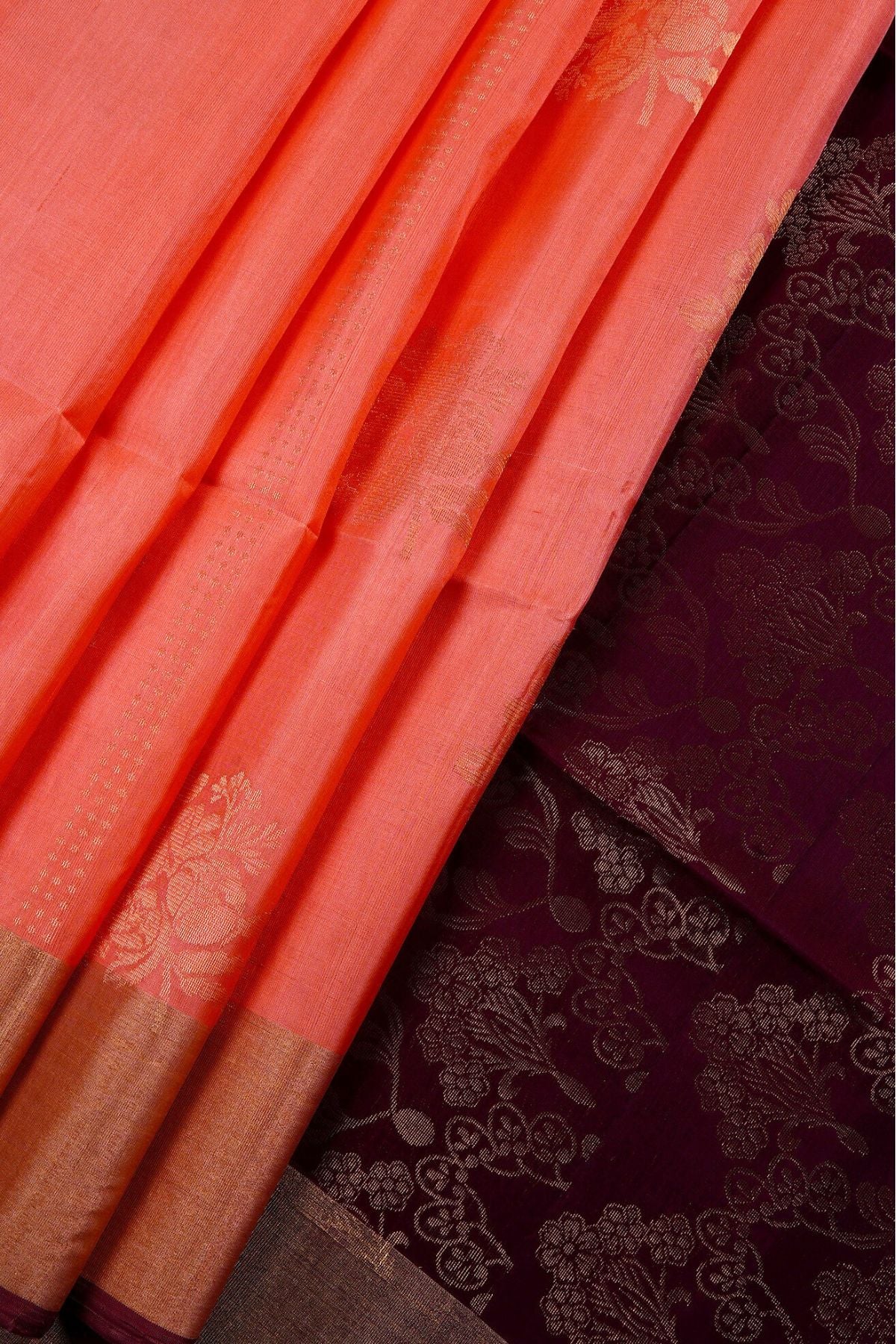 Previous NextPeach soft silk saree holding branch like motifs woven in gold zari, vertically separated by diamond motifs woven along the width in a linear pattern, ending with a simple antique gold zari border. The pallu has a dark maroon base, woven with intricately flowing flower and leaf motifs in antique gold zari. The saree has a plain dark maroon blouse with a simple gold zari border.
