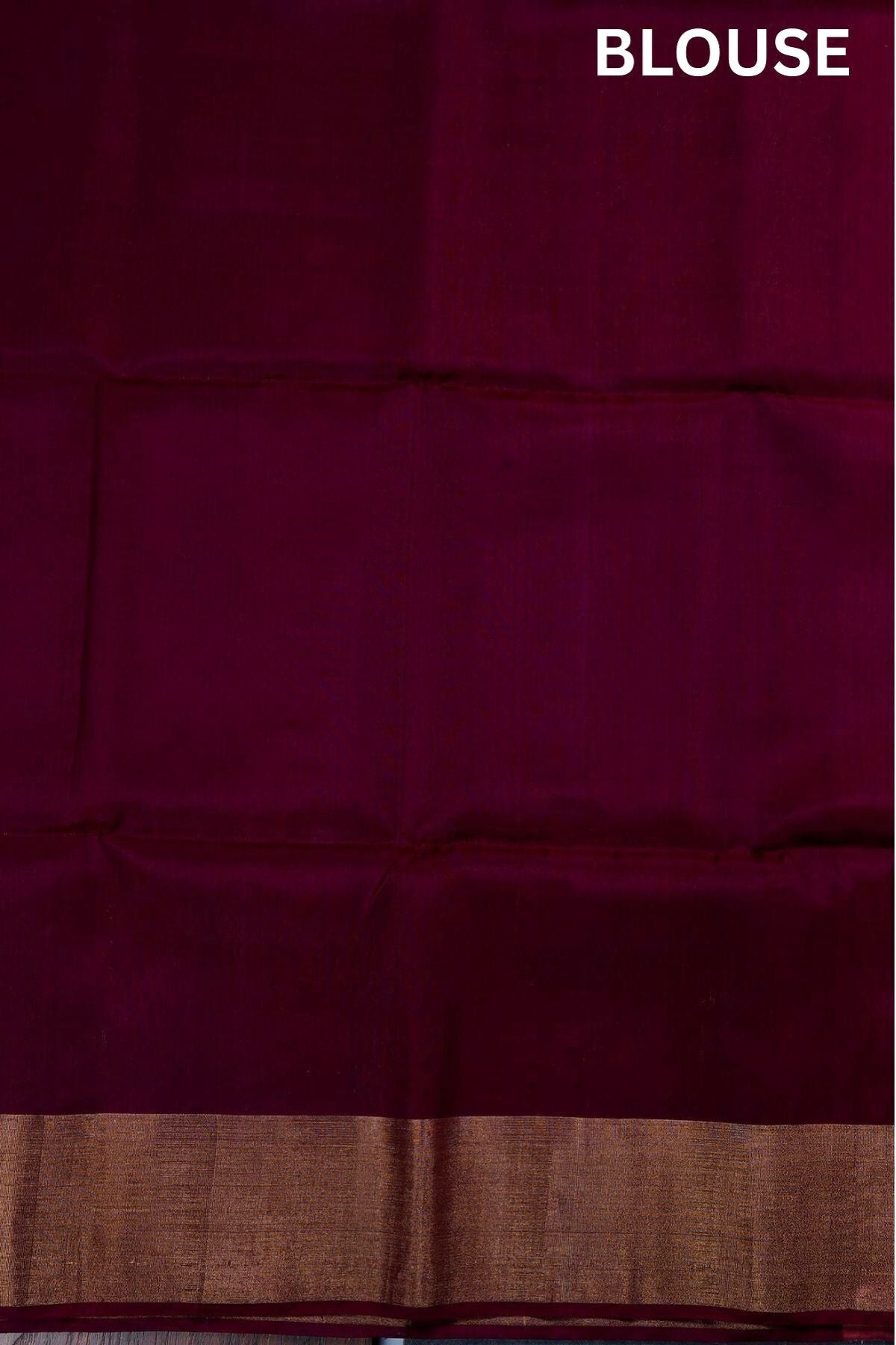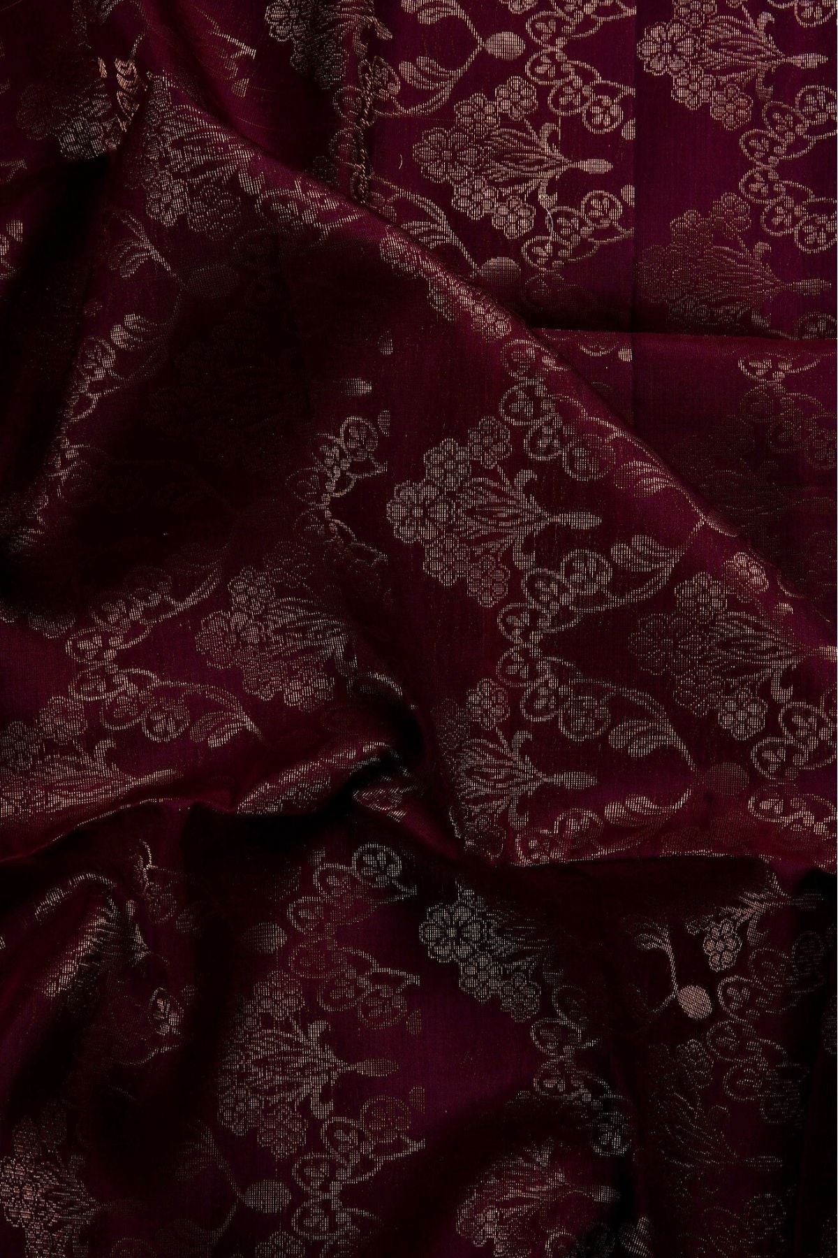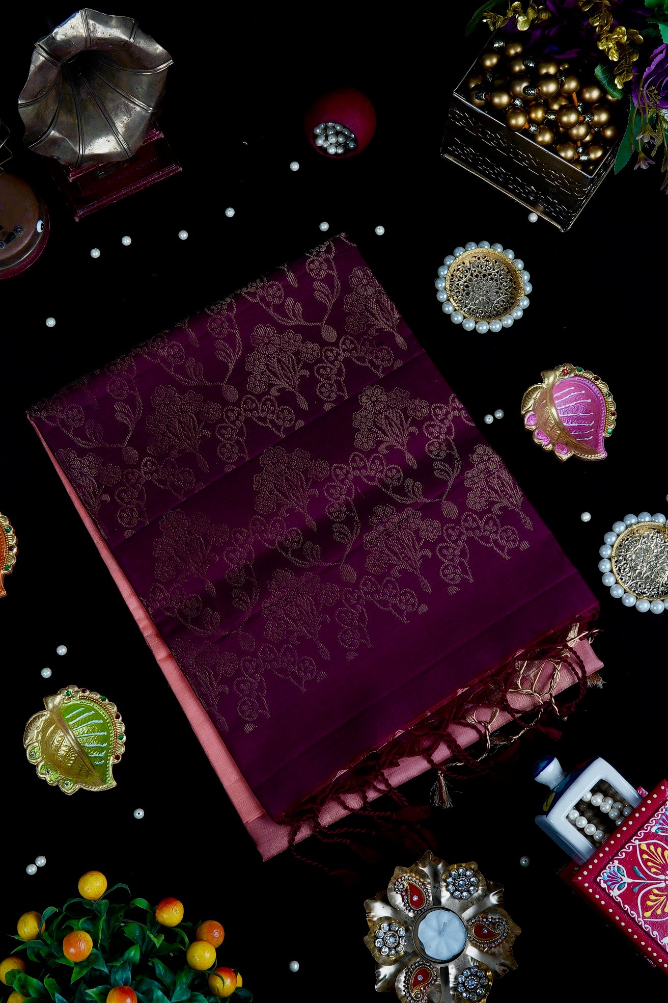 Previous NextPeach soft silk saree holding branch like motifs woven in gold zari, vertically separated by diamond motifs woven along the width in a linear pattern, ending with a simple antique gold zari border. The pallu has a dark maroon base, woven with intricately flowing flower and leaf motifs in antique gold zari. The saree has a plain dark maroon blouse with a simple gold zari border.