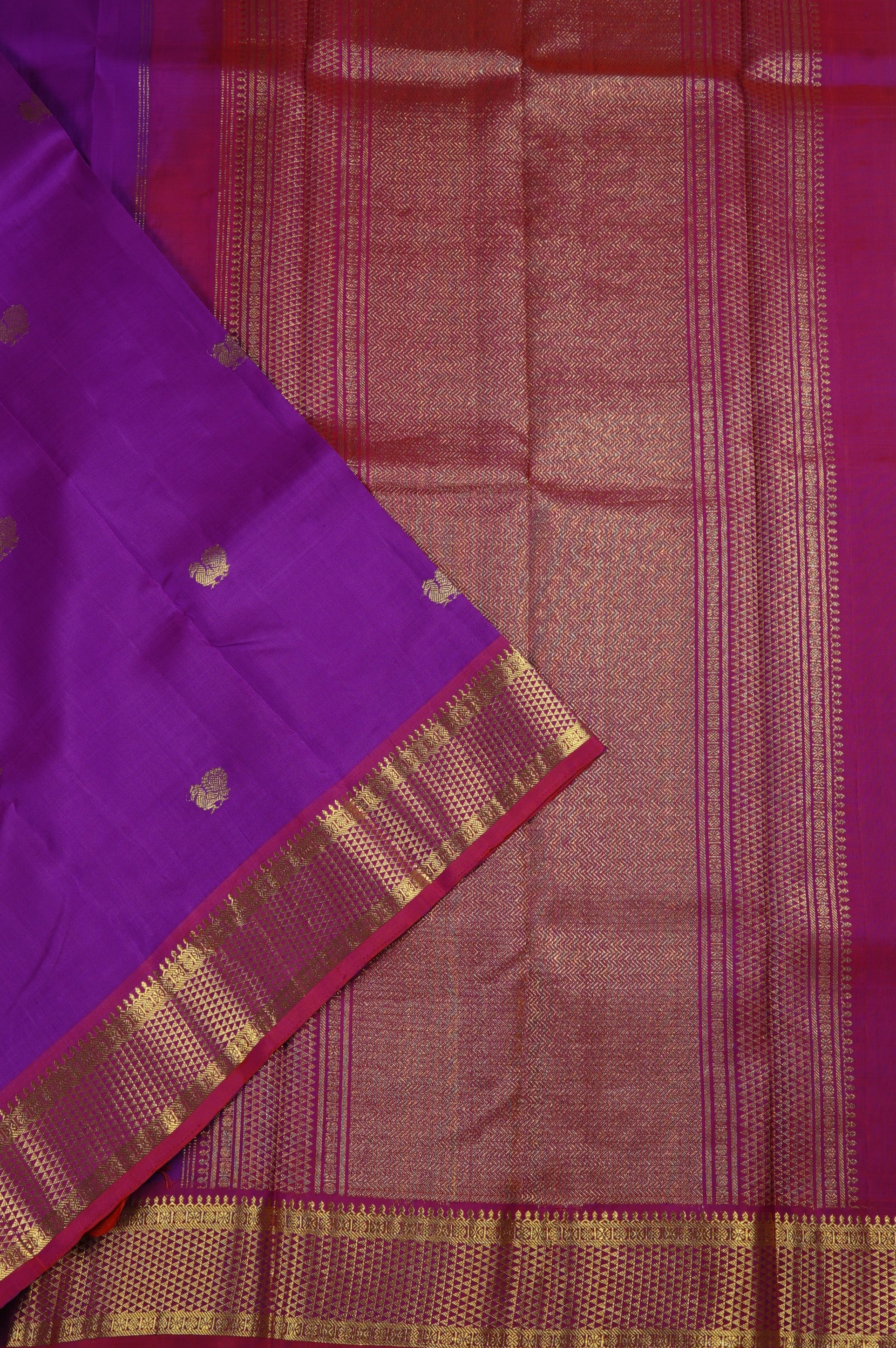 Previous NextA royal Kanchipuram vision in purple graced by small Annapakshi motifs all over the body woven in gold zari, with a carmine border filled with the traditional triangular grid pattern woven in gold zari. The pallu is an intricate expanse of dense neli patterns woven in gold zari almost hiding the base shade of carmine. The saree has a carmine blouse with the same border.