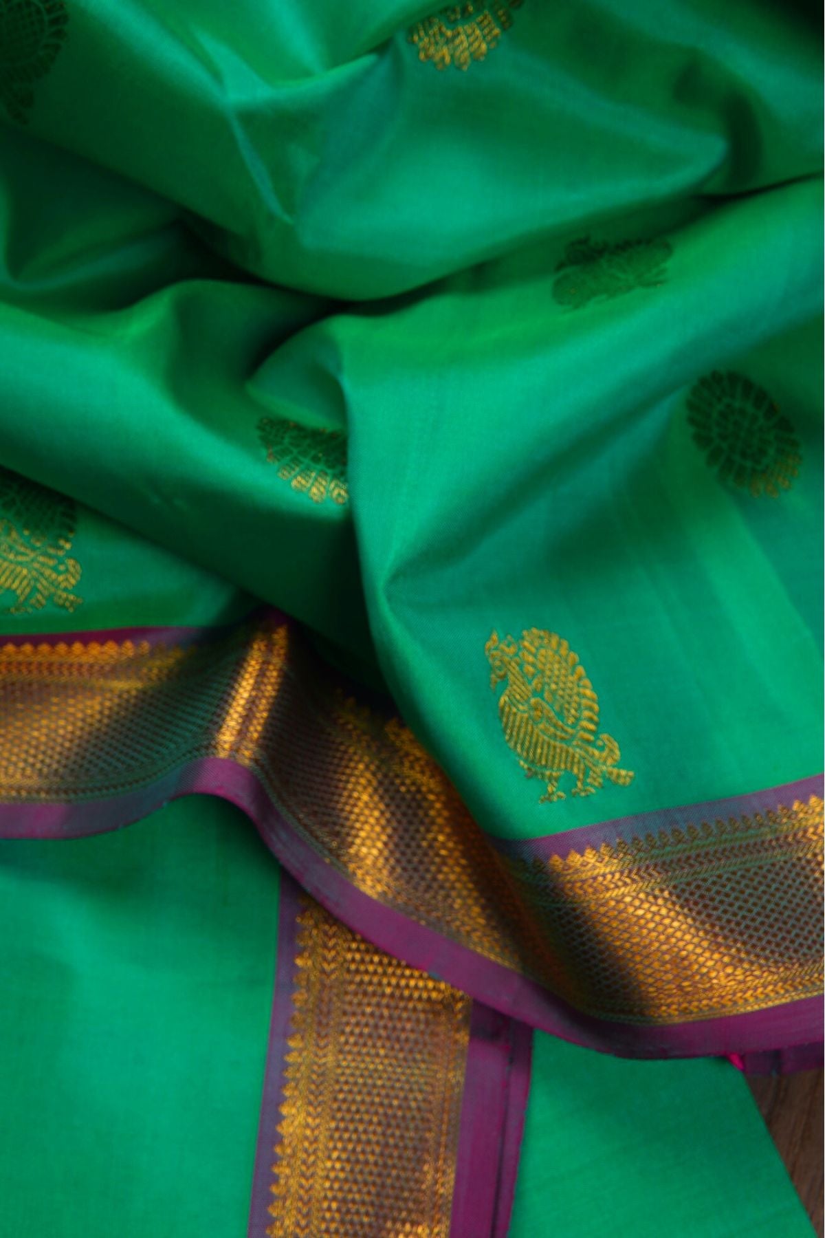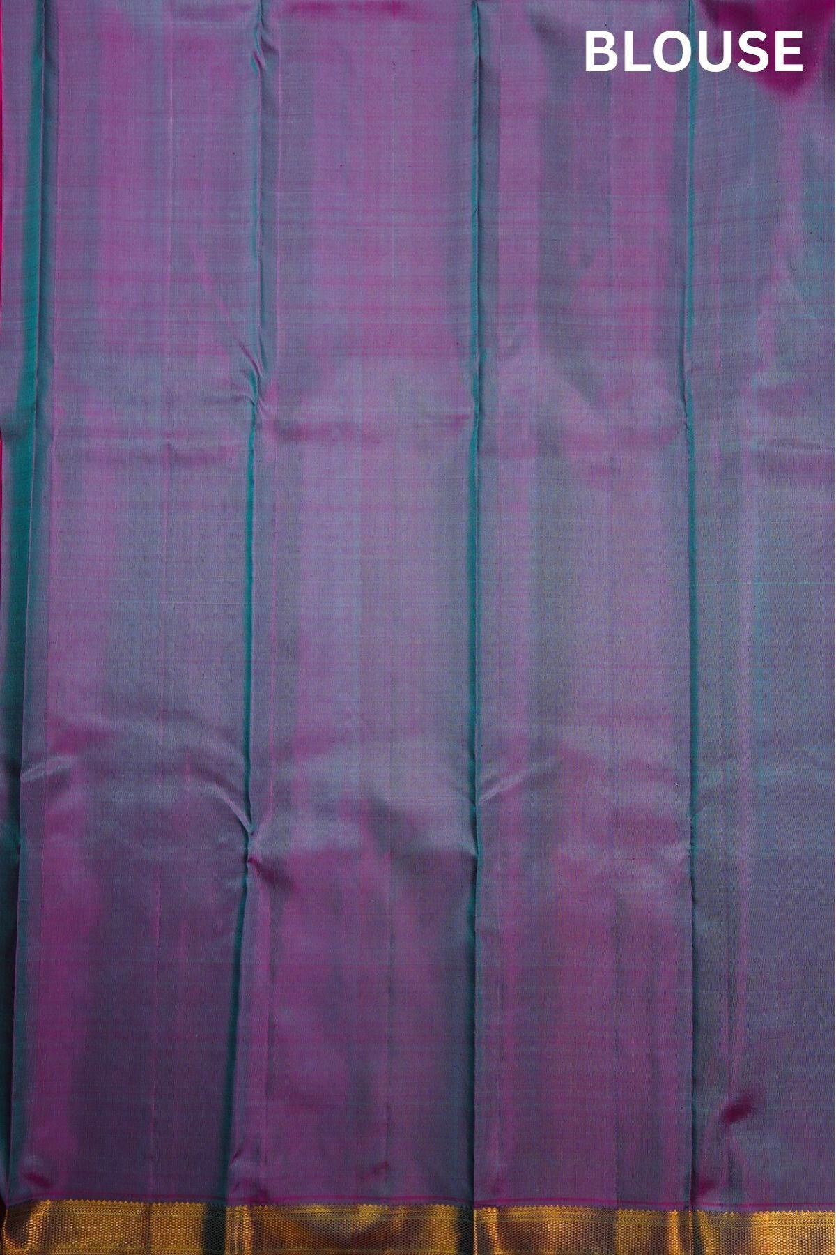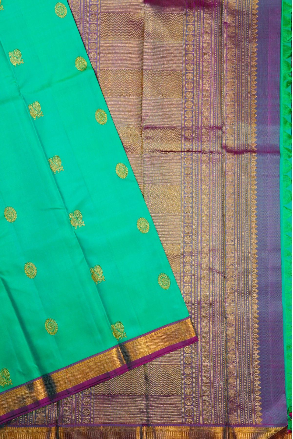 Previous NextTurquoise Kanchipuram Silk Saree with alternating chakram and peacock bhuttas woven in gold zari with a bright violet border filled with gold zari. The pallu has a dusty purple base and has a series of intricate motifs, starting with a band ofleaves, followed by elephants, peacocks and circular floral motifs. A vast area of vertical bands in gold zari covers the pallu with the same series of bands repeating after. The saree has a plain dual toned dusty purple blouse with the same border.