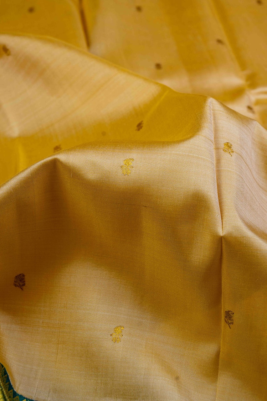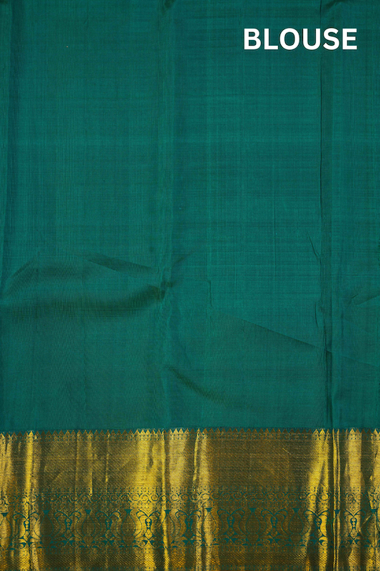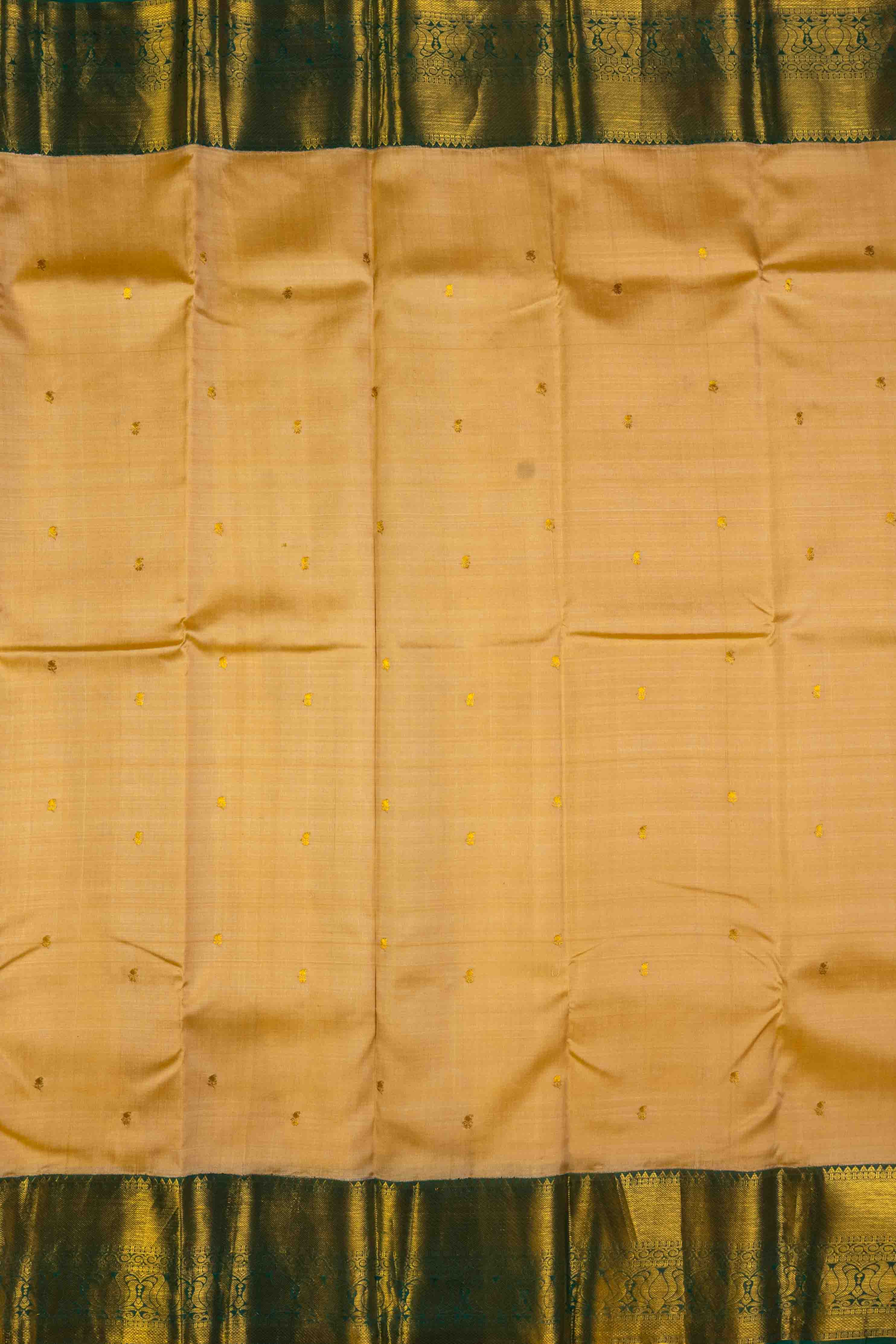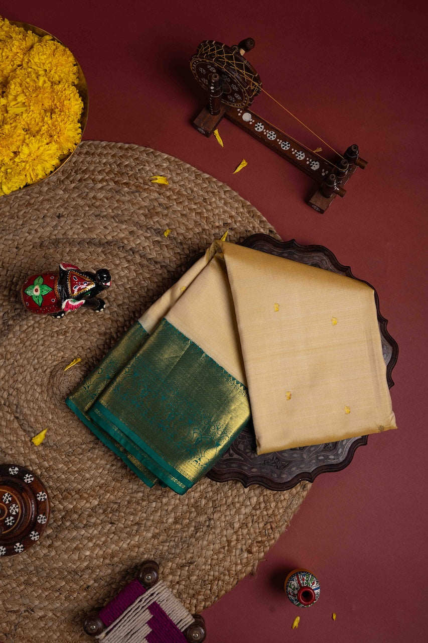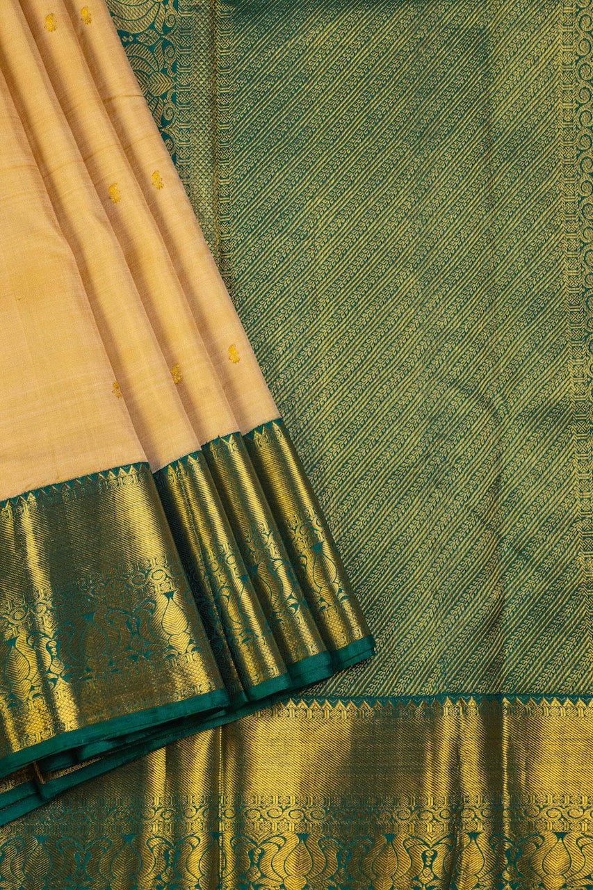 Previous NextCream kanchipuram silk saree woven with a contrast green border.