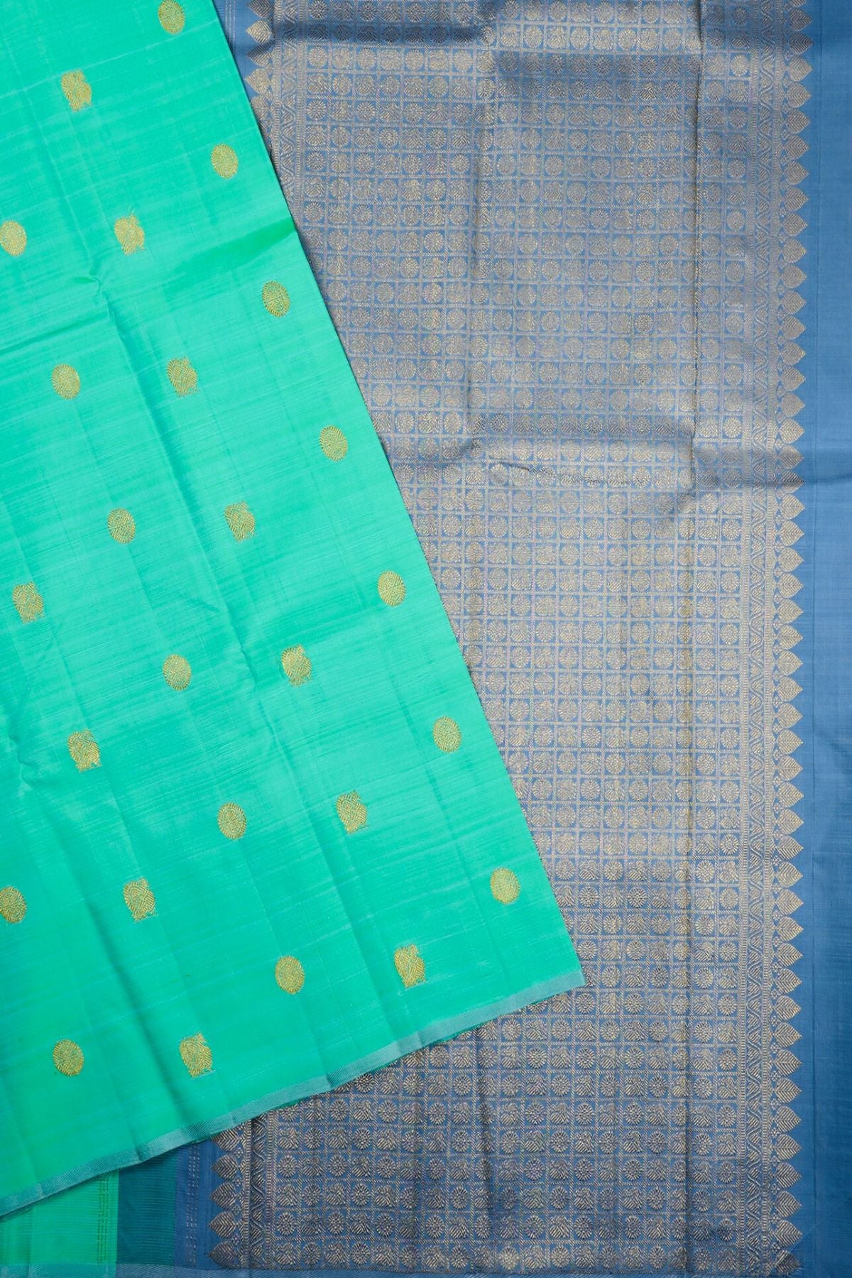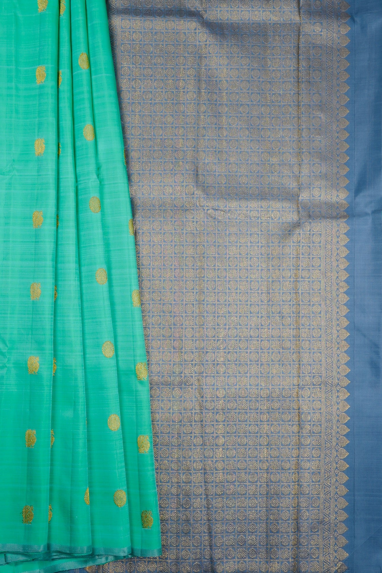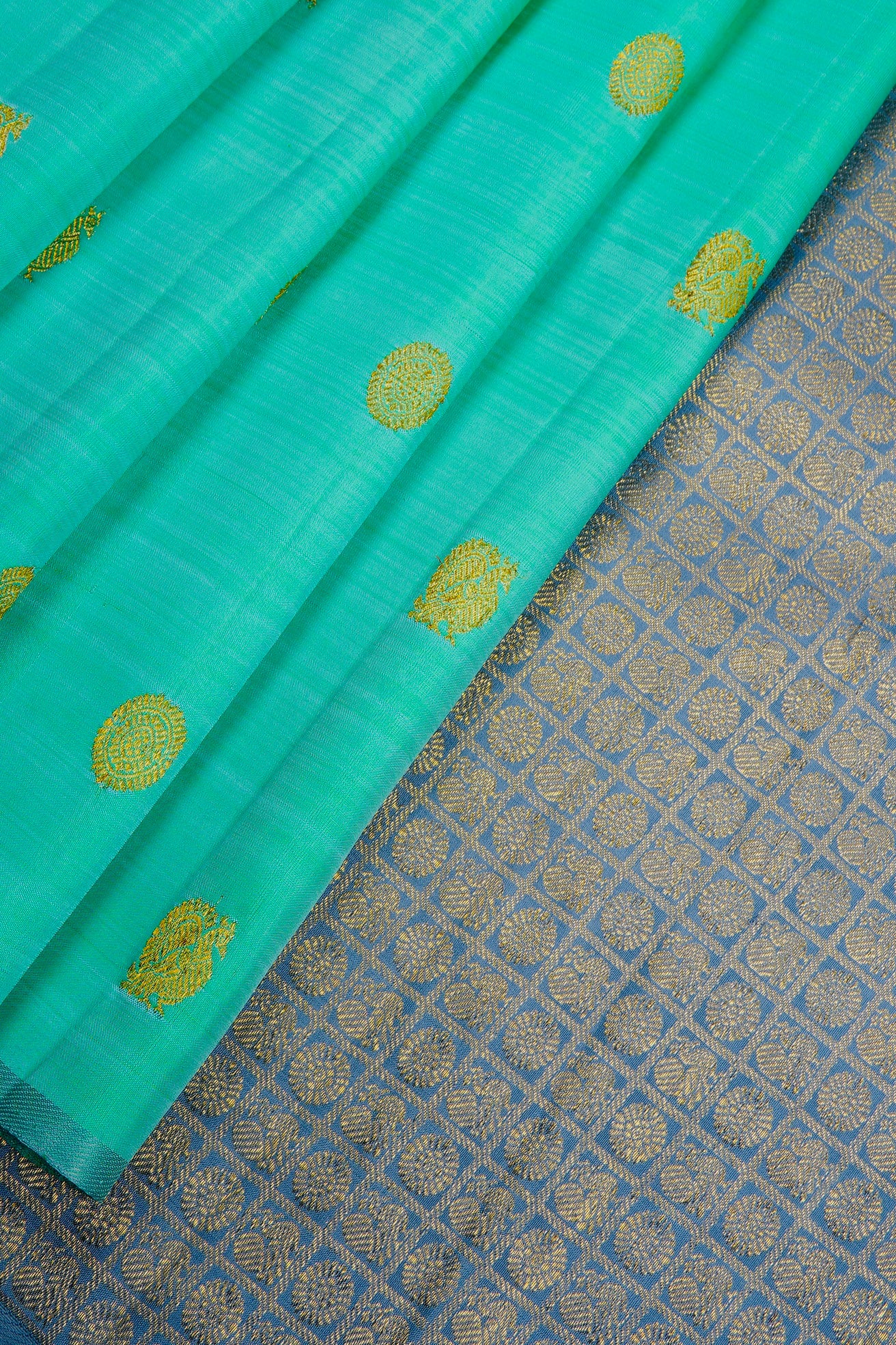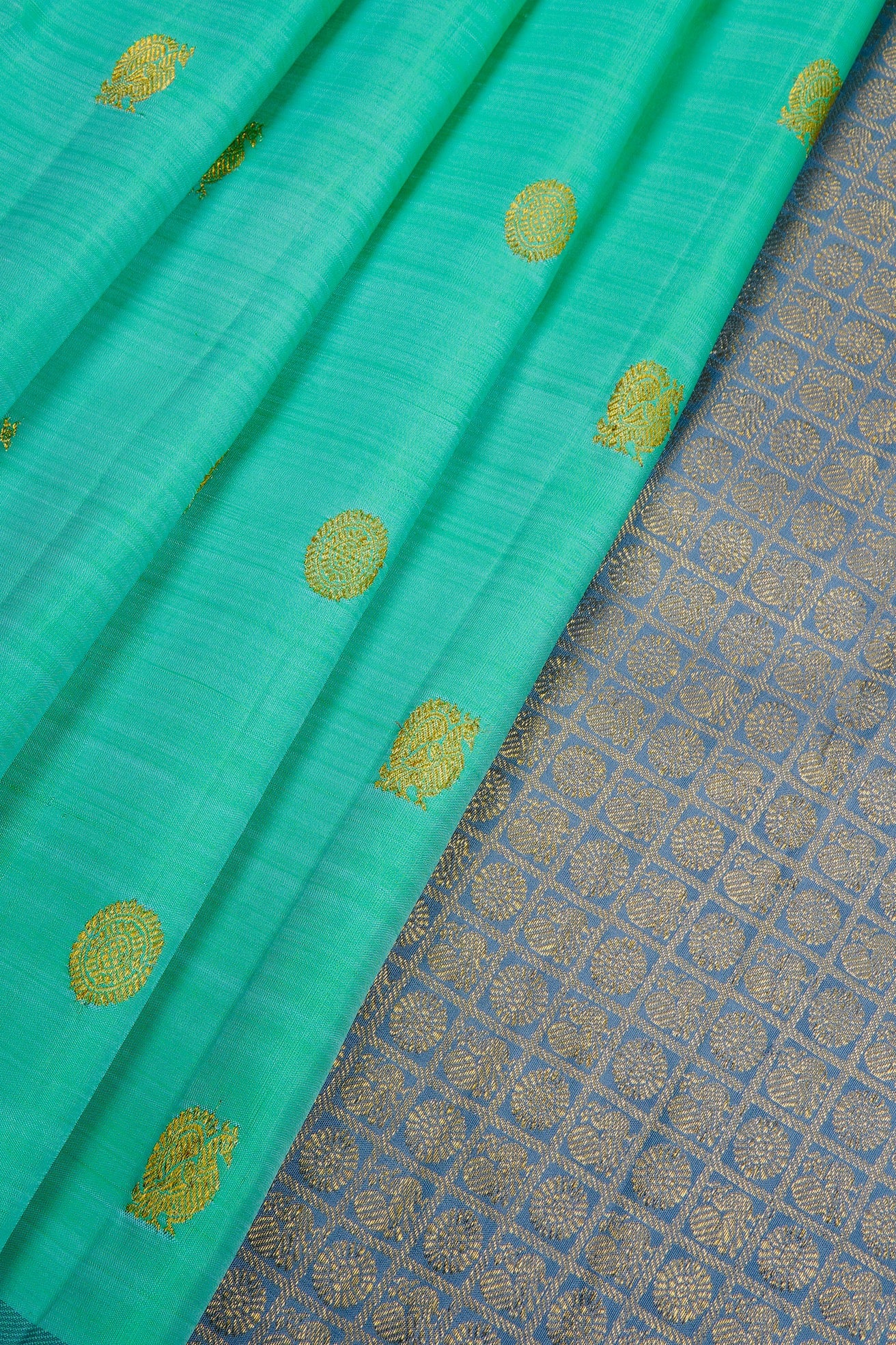 Previous NextCyan Kanchipuram Silk Saree with alternating chakram and peacock bhuttas woven in golden zari throughout the body. The pallu has a dusty blue base with the same bhuttas woven smaller within grids in golden zari. The saree has a plain dusty blue blouse.
