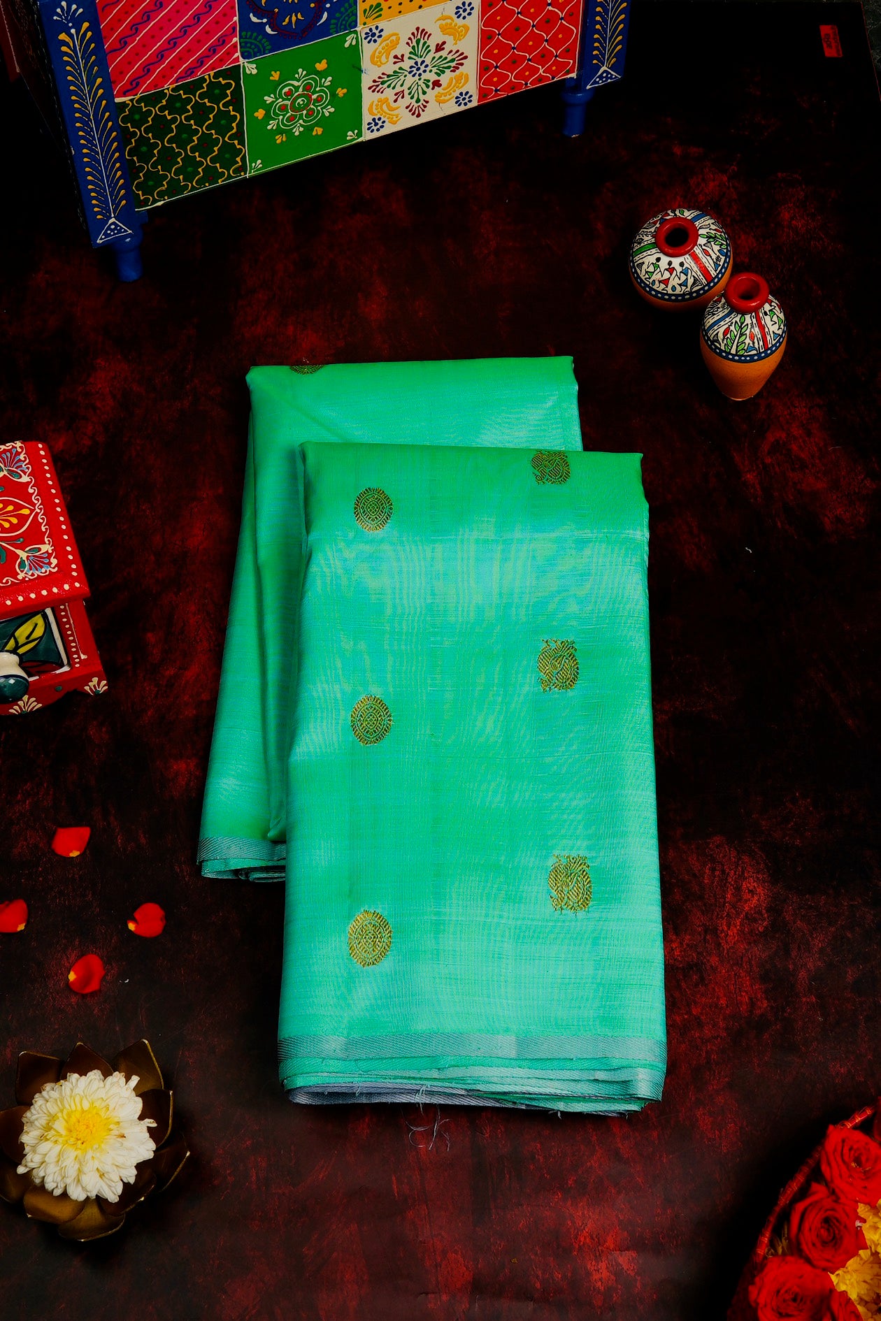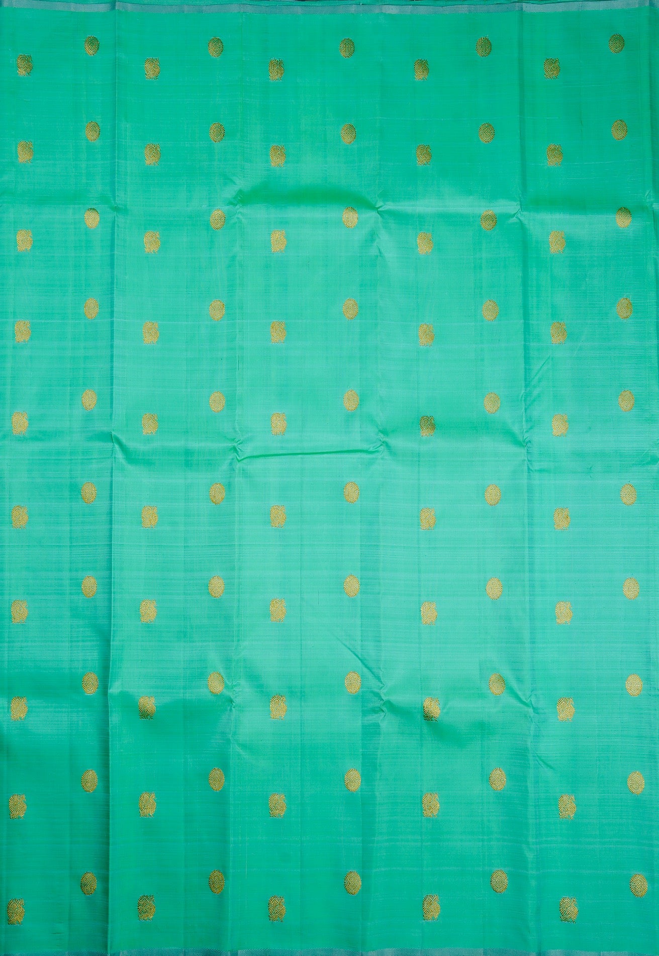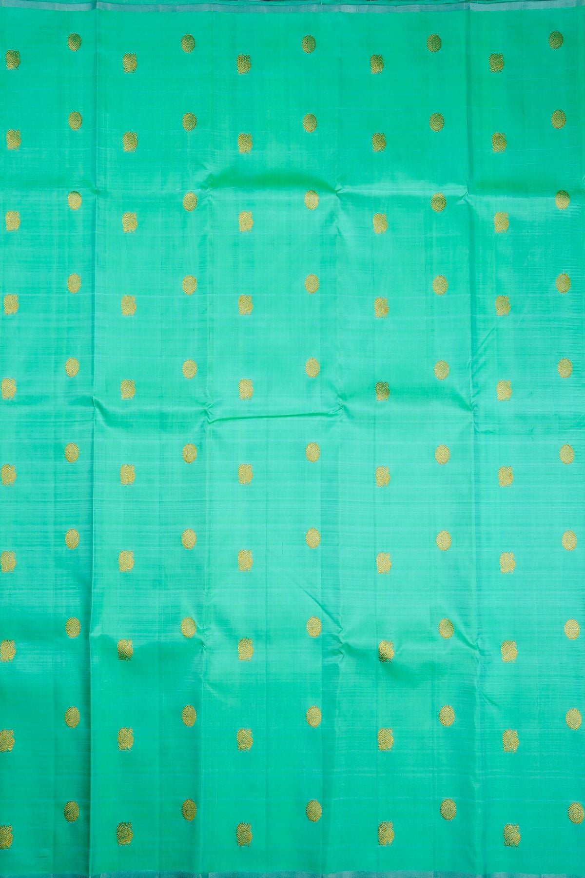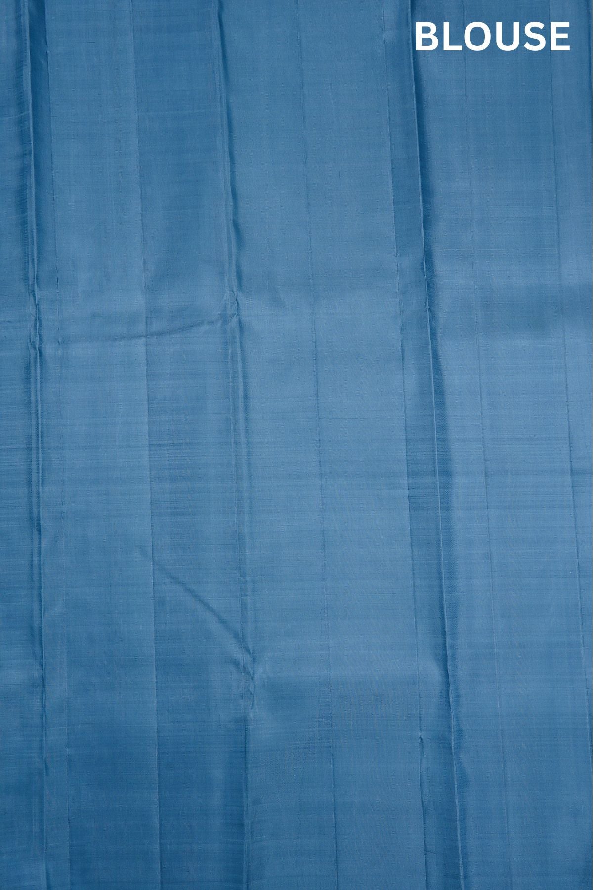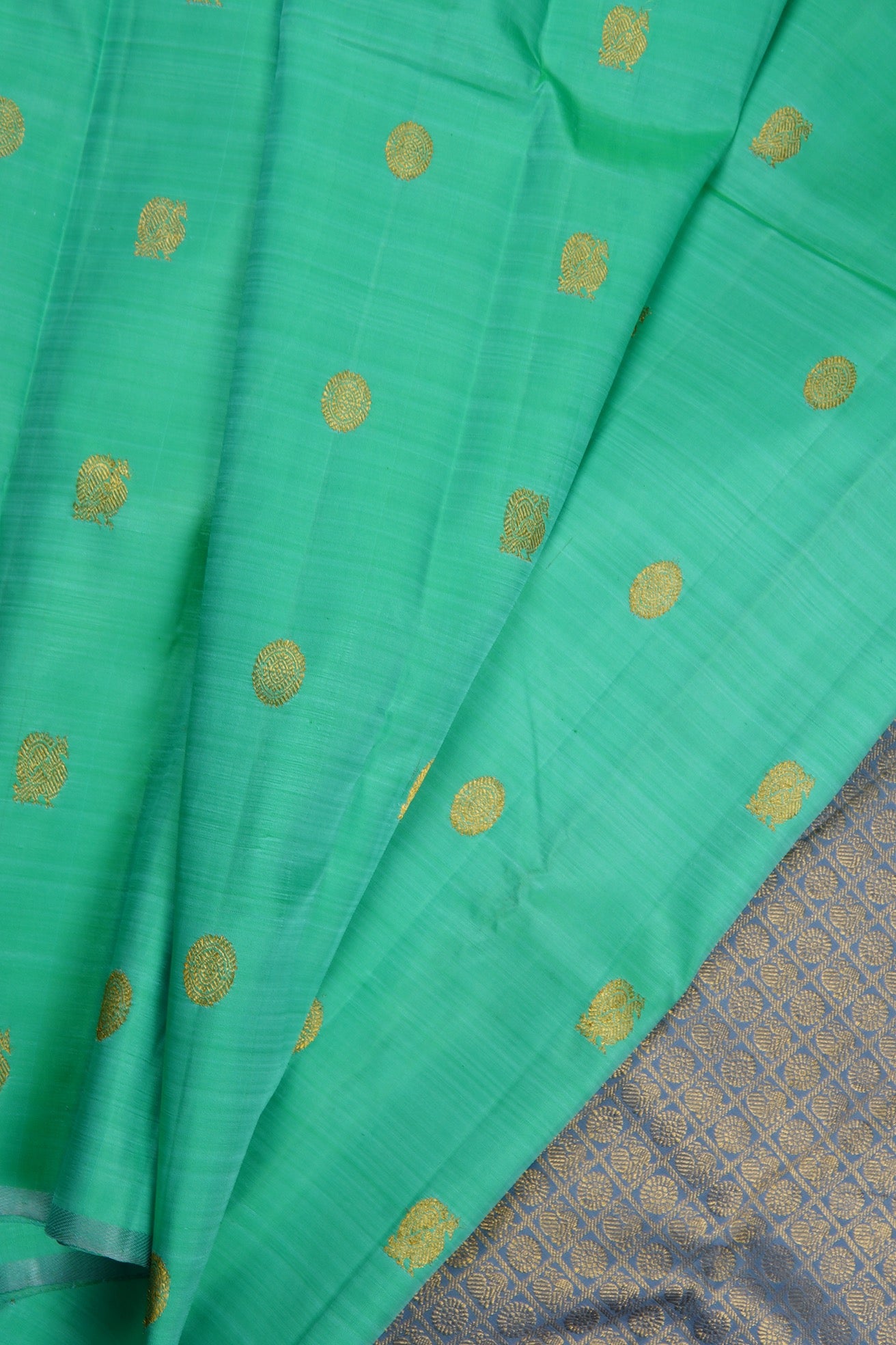 Previous NextCyan Kanchipuram Silk Saree with alternating chakram and peacock bhuttas woven in golden zari throughout the body. The pallu has a dusty blue base with the same bhuttas woven smaller within grids in golden zari. The saree has a plain dusty blue blouse.