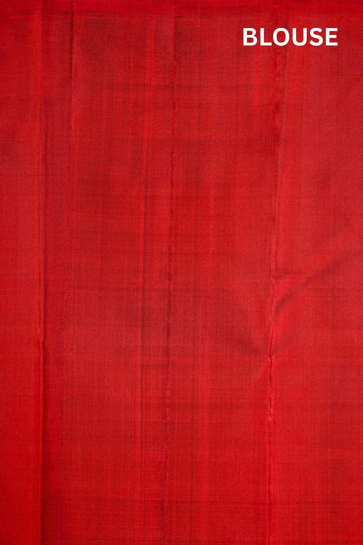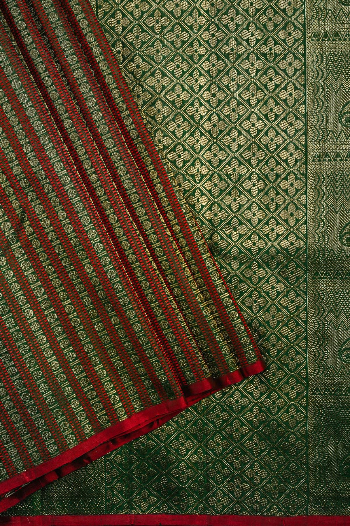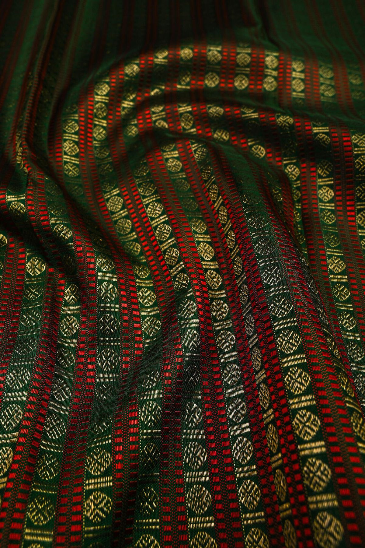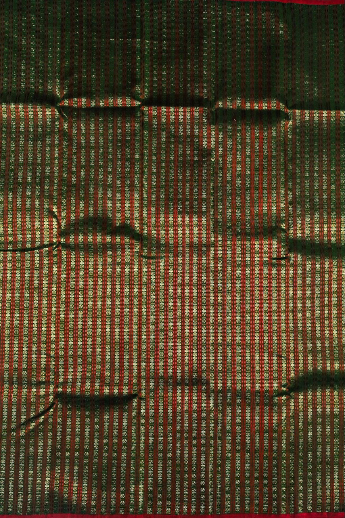 Previous NextDark green and red kanchipuram silk saree with golden coin buttas punctuated by stripes in red threads. The Green pallu carries floral jaali patterns in gold zari, paired with a plain red blouse.