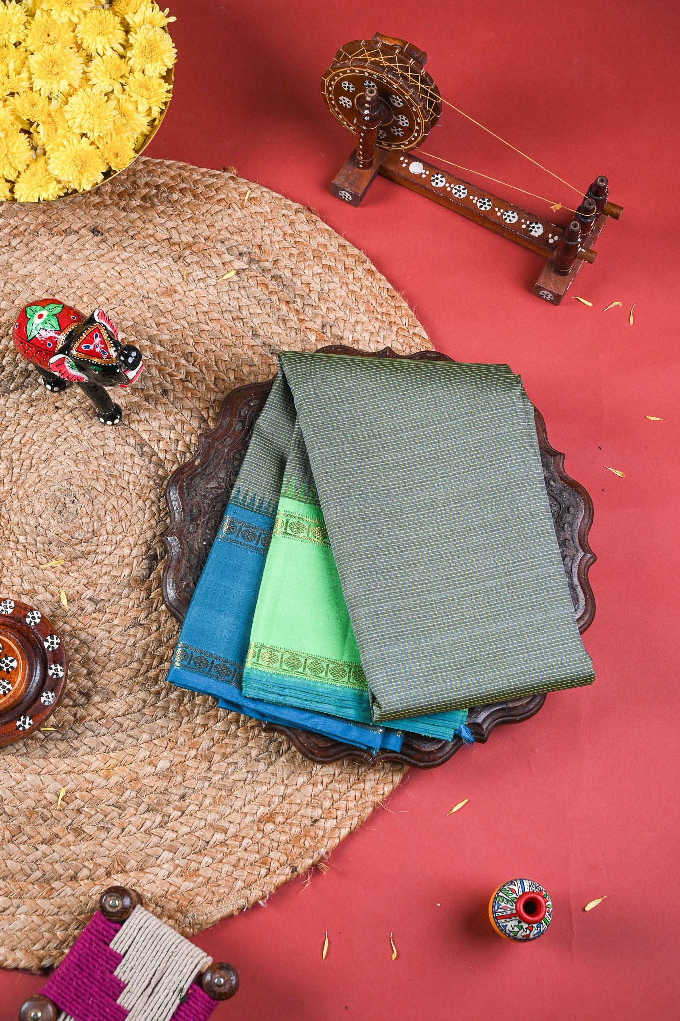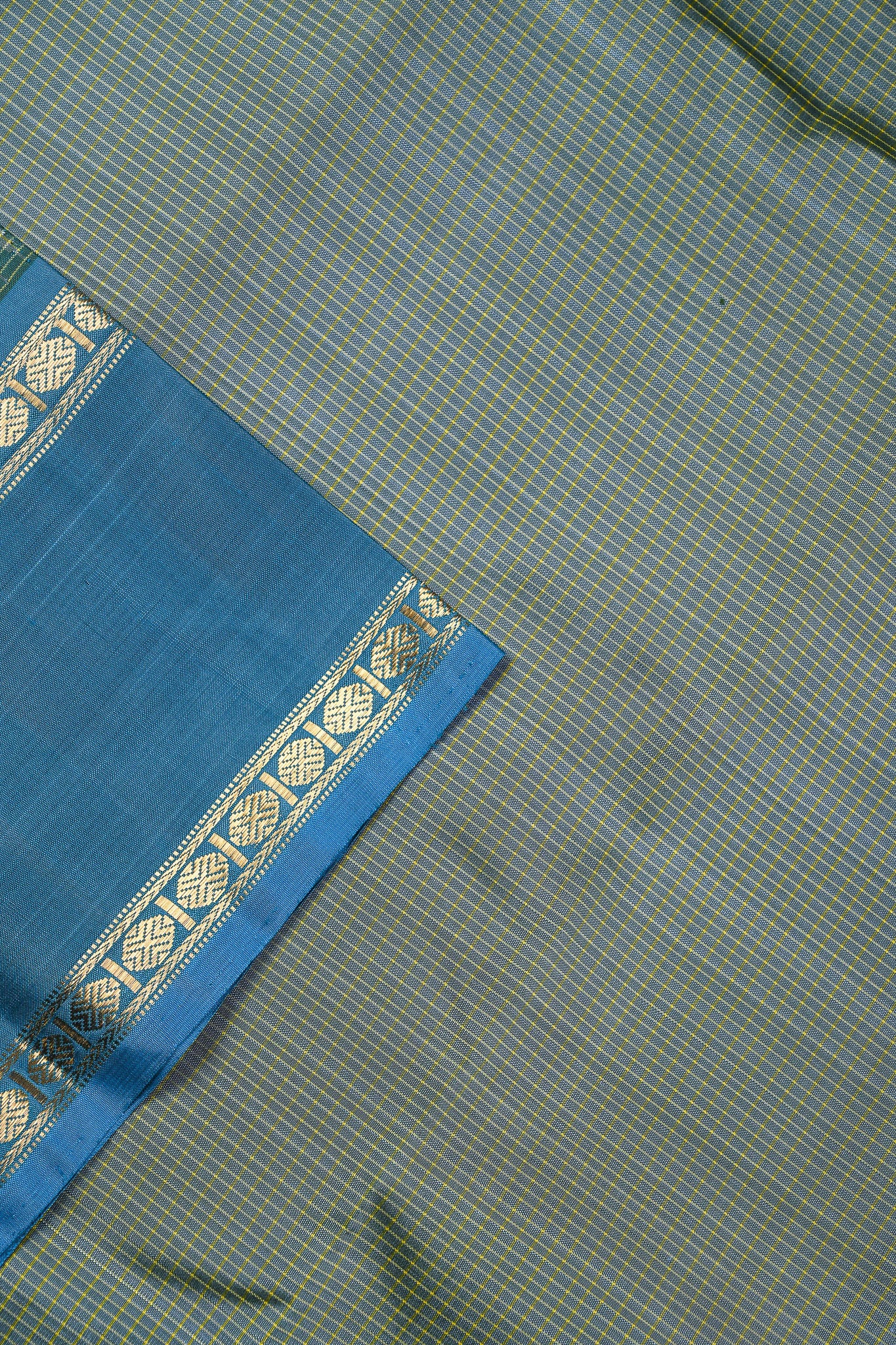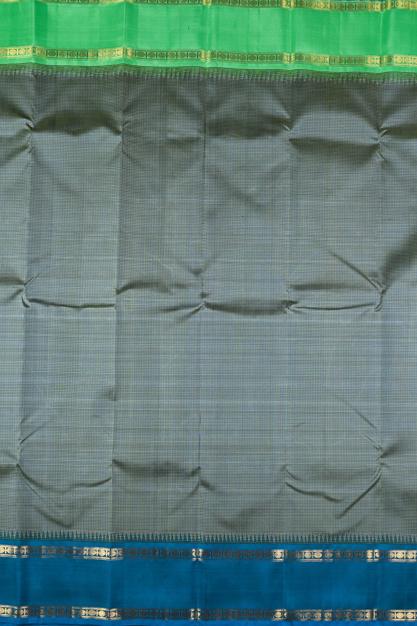 Previous NextGrey kanchipuram silk saree with a Ganga-Jamuna border in parrot green and navy blue. The body carries self-embossed checks.