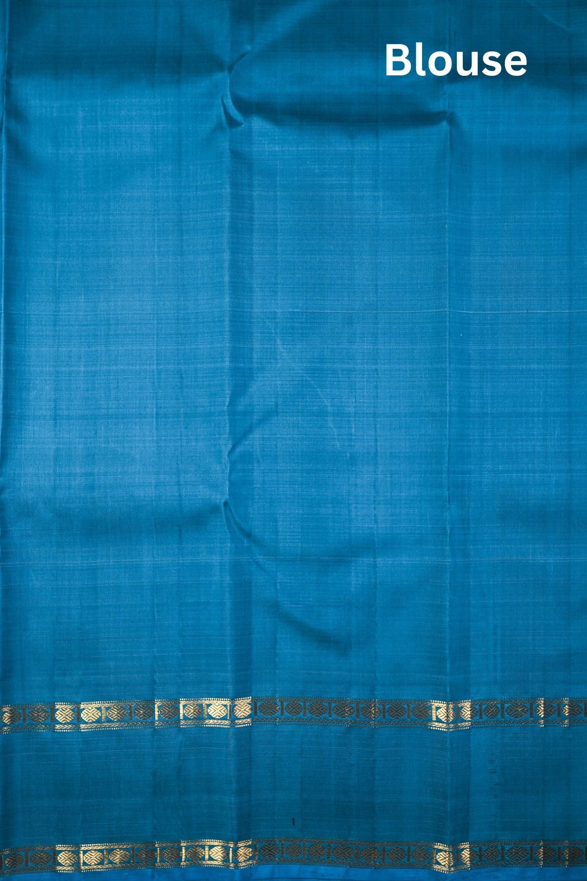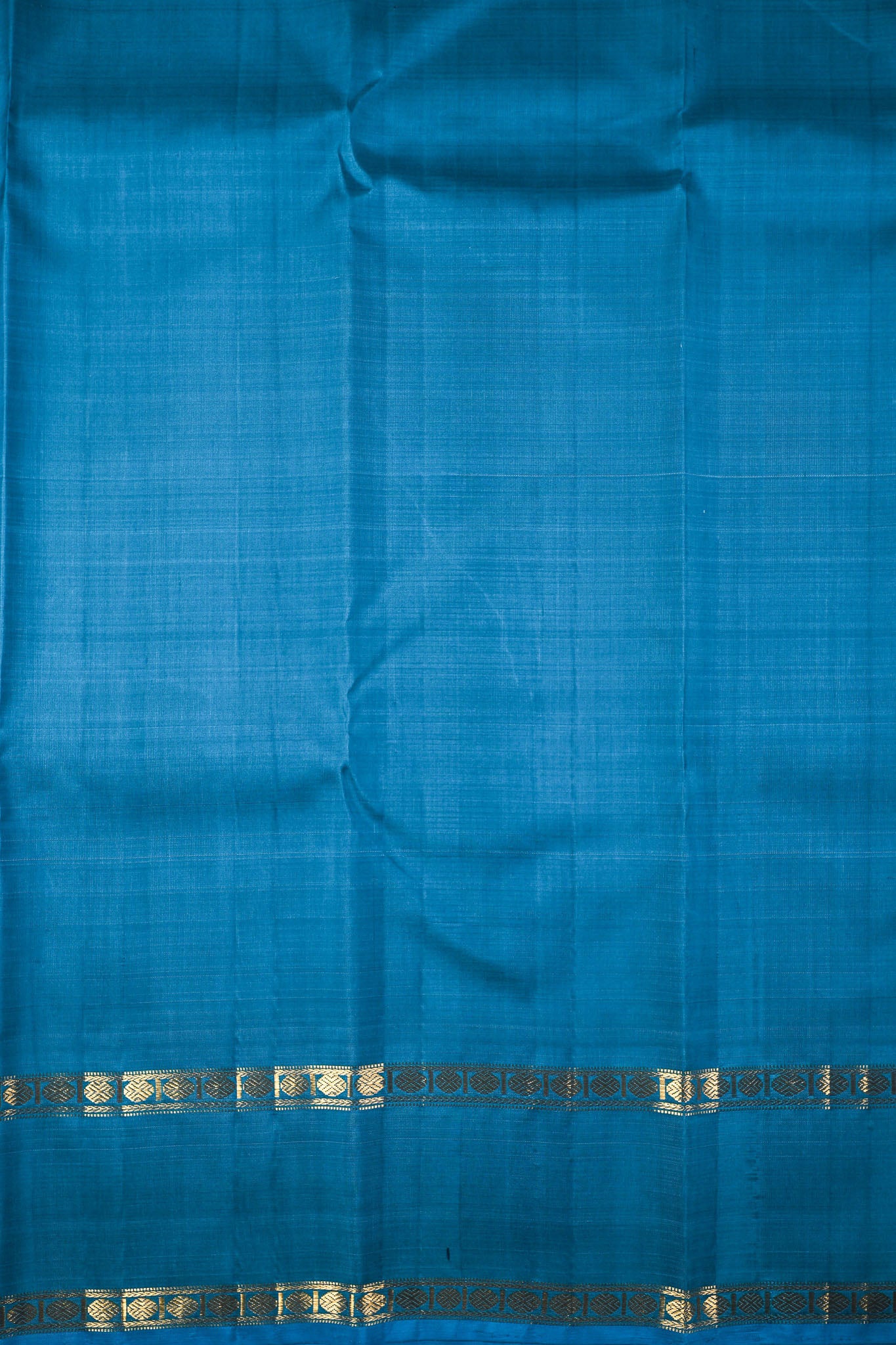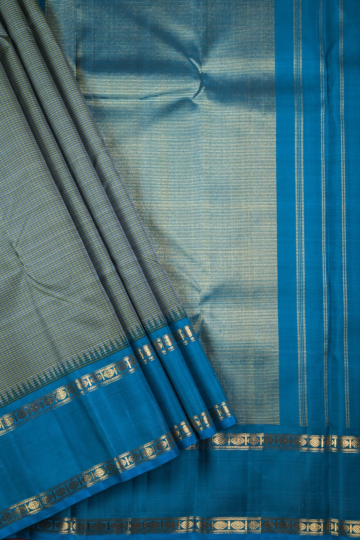 Previous NextGrey kanchipuram silk saree with a Ganga-Jamuna border in parrot green and navy blue. The body carries self-embossed checks.