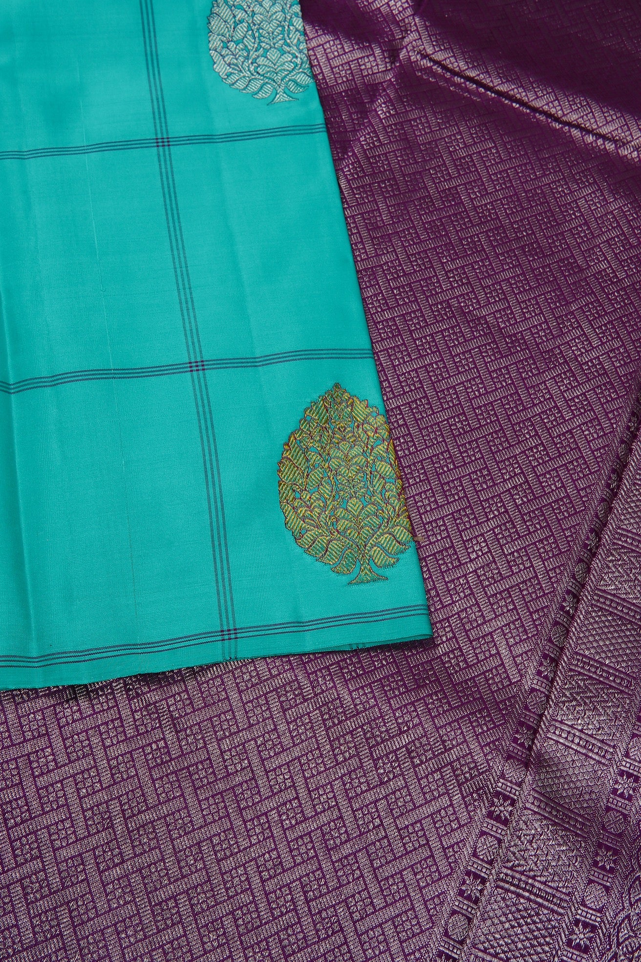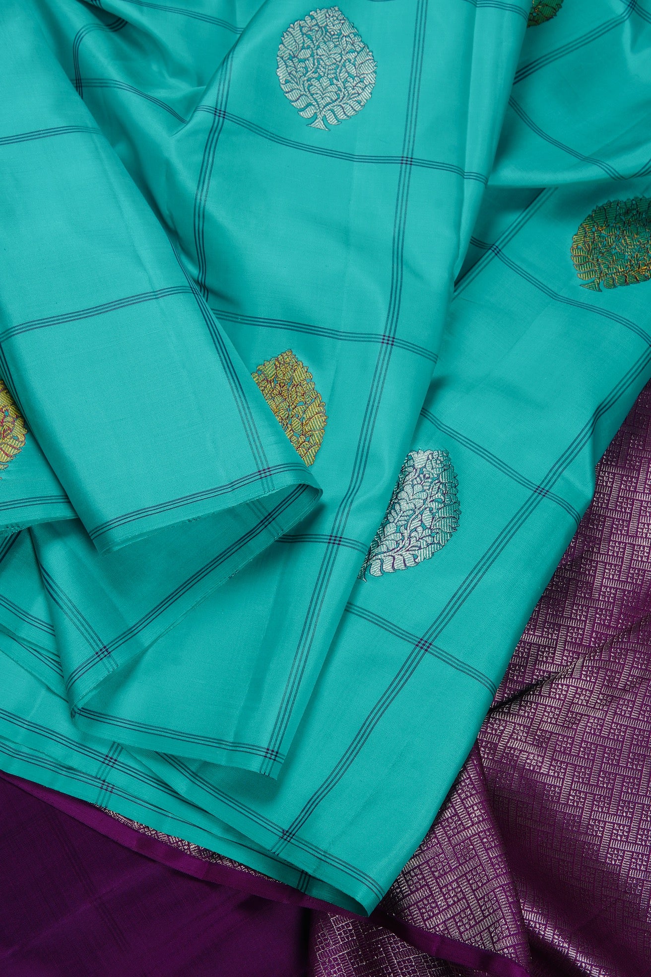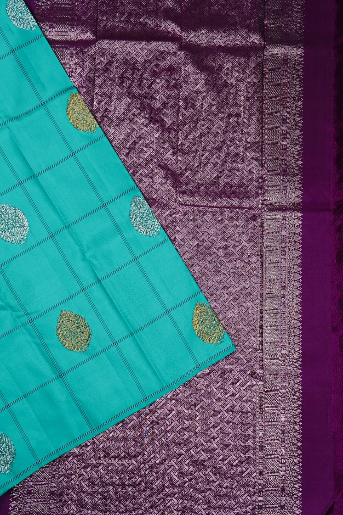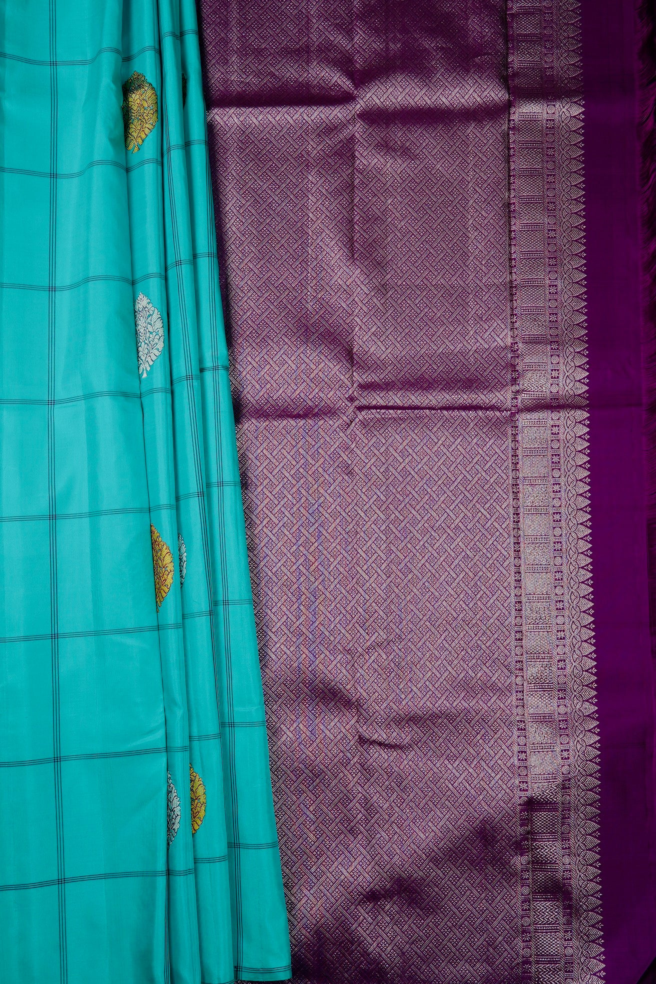 Previous NextLight blue Kanchipuram Silk Saree with checks woven in pruple threads, bordering thilakam bhuttas intricately stylised by floral patterns woven alternatively with gold and silver zari with purple outlines. The pallu has a dark purple base with a wide expanse of stripes interlocking patterns woven in silver zari followed by a band vertical widths and bands of circle and floral bhuttas woven in silver zari. The saree has a solid purple blouse.