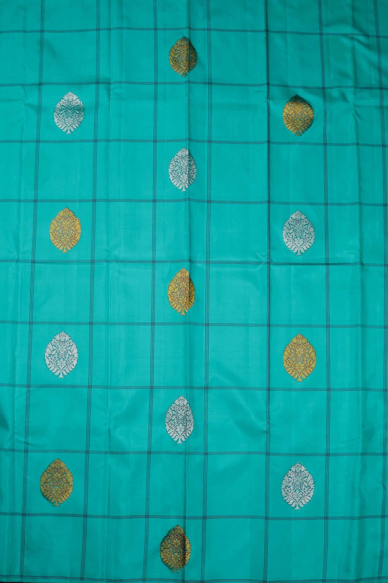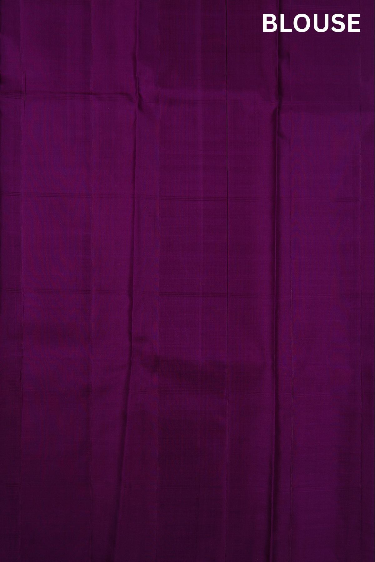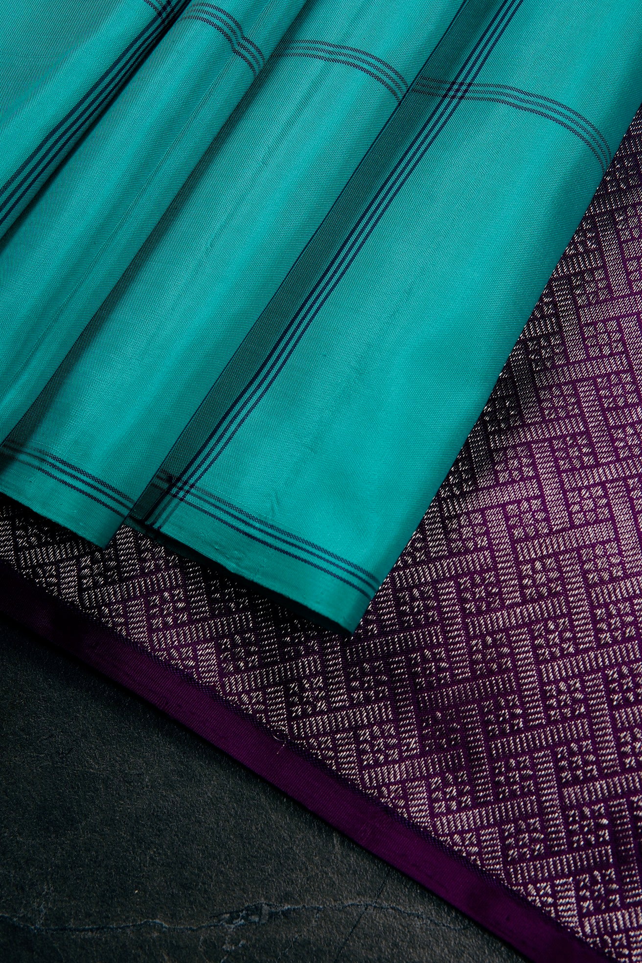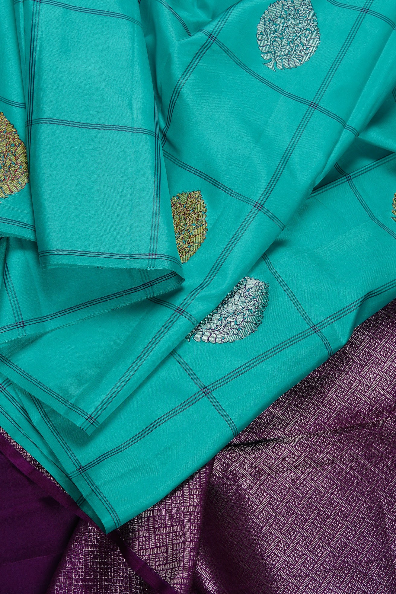 Previous NextLight blue Kanchipuram Silk Saree with checks woven in pruple threads, bordering thilakam bhuttas intricately stylised by floral patterns woven alternatively with gold and silver zari with purple outlines. The pallu has a dark purple base with a wide expanse of stripes interlocking patterns woven in silver zari followed by a band vertical widths and bands of circle and floral bhuttas woven in silver zari. The saree has a solid purple blouse.