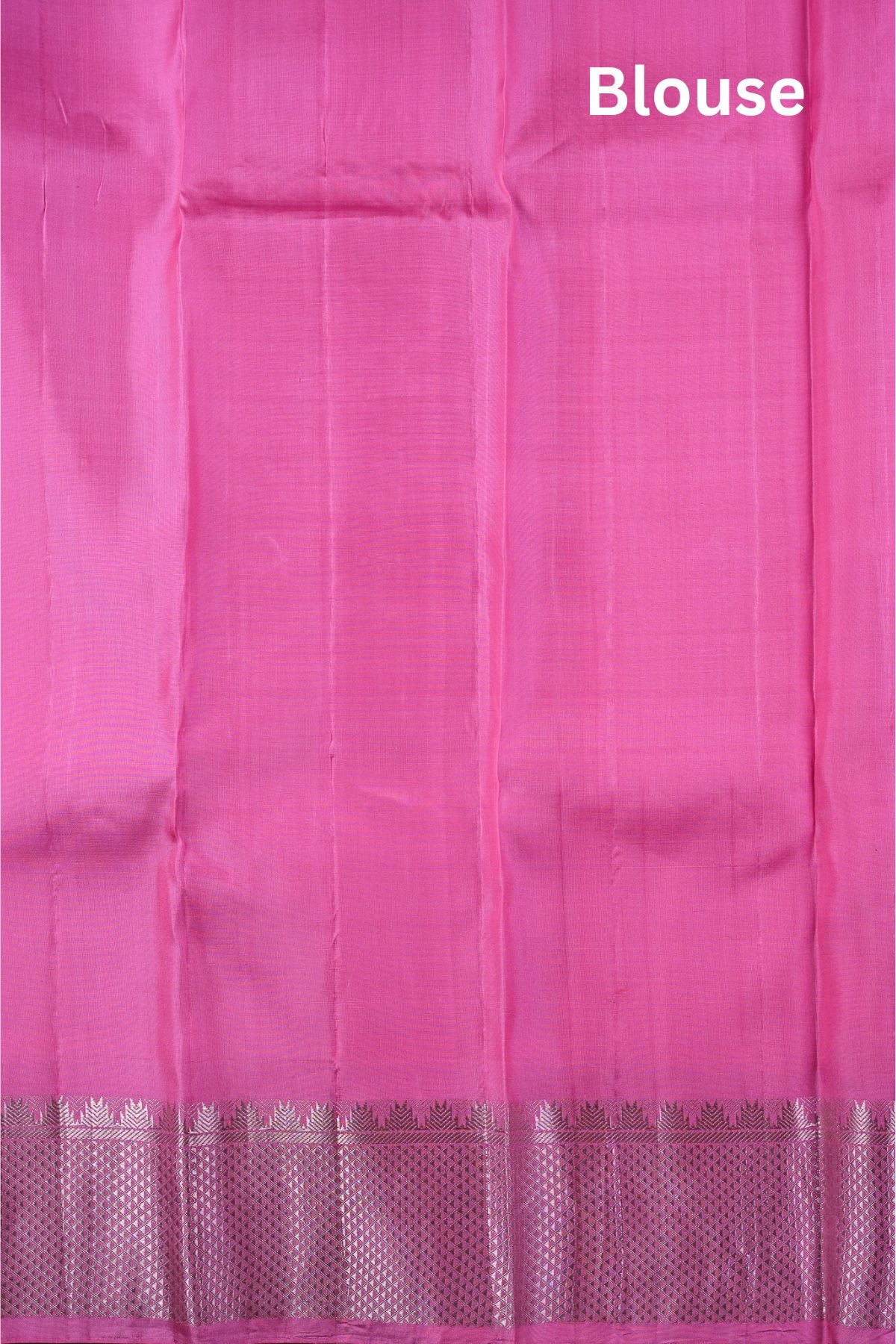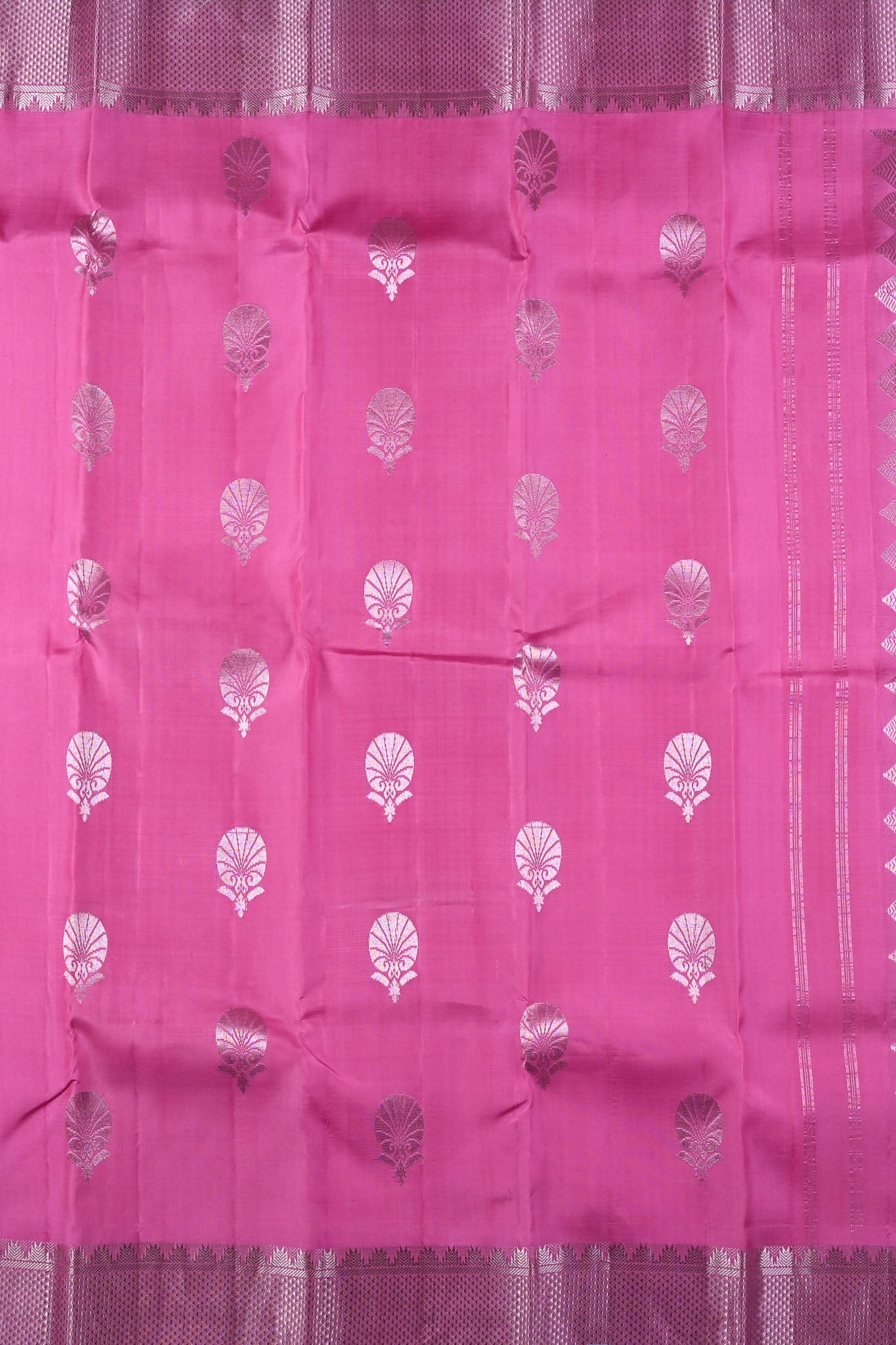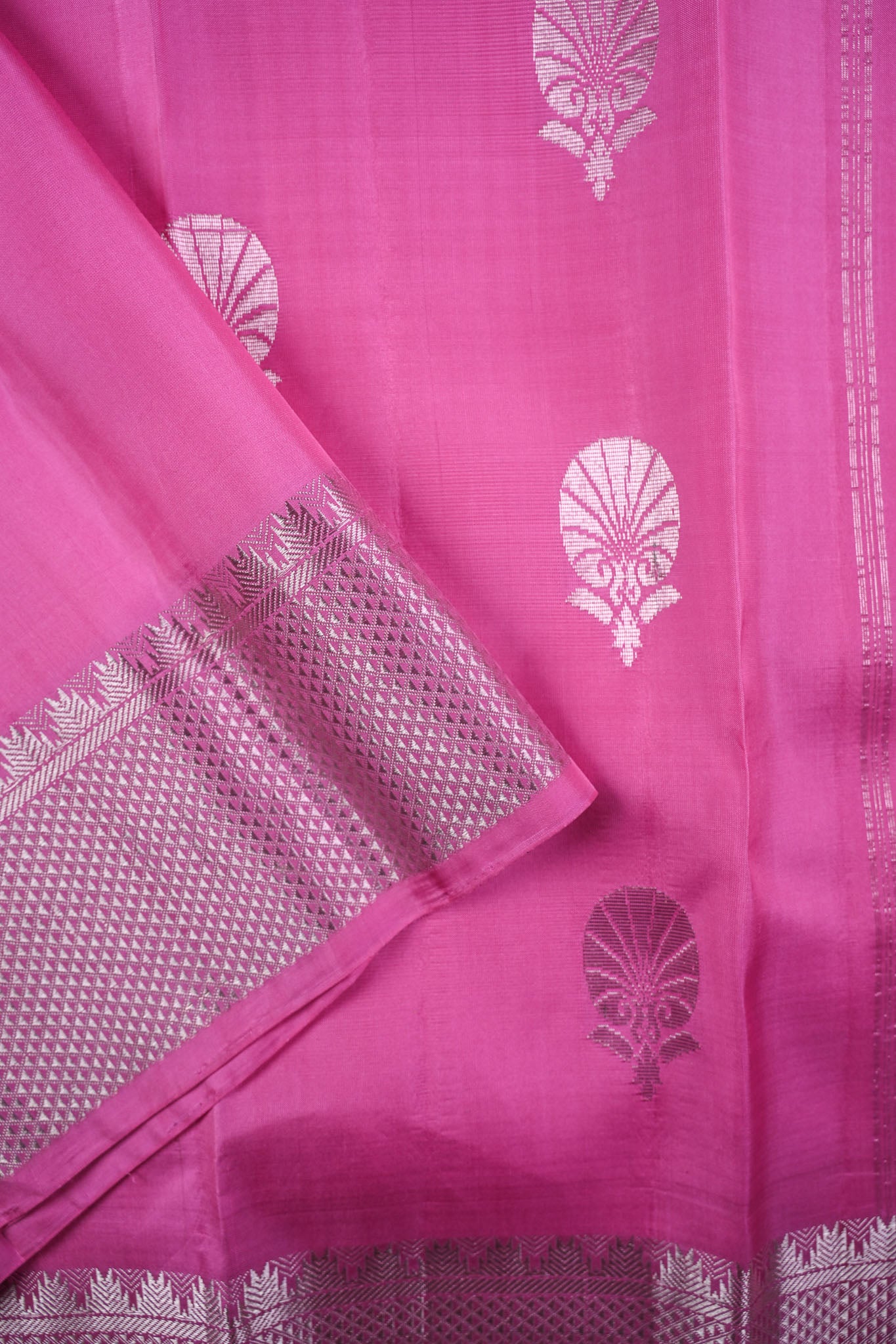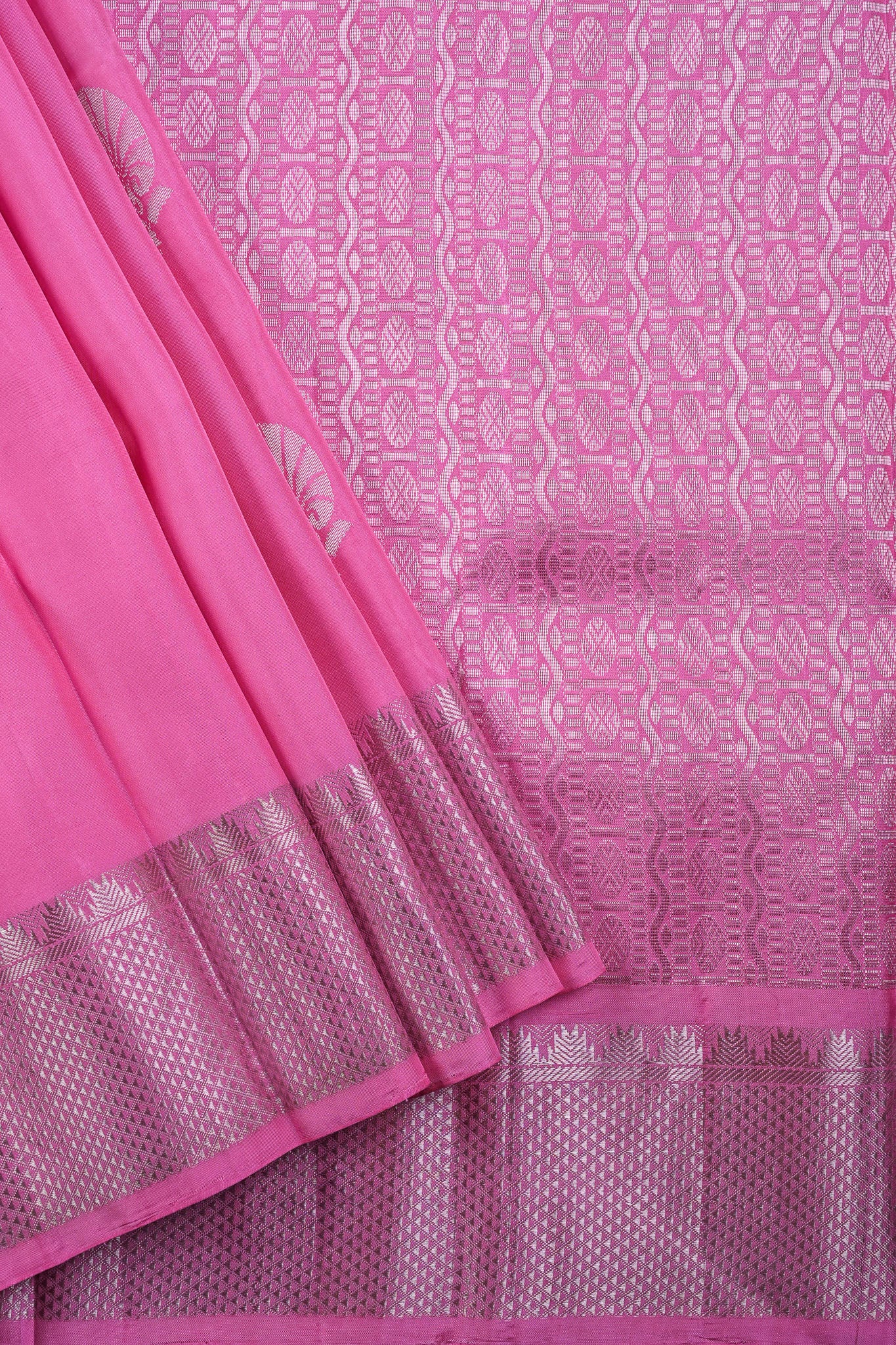 Previous NextLight pink kanchipuram silk saree with a "self" border in silver zari. The body carries stylized floral bhuttas in silver zari.