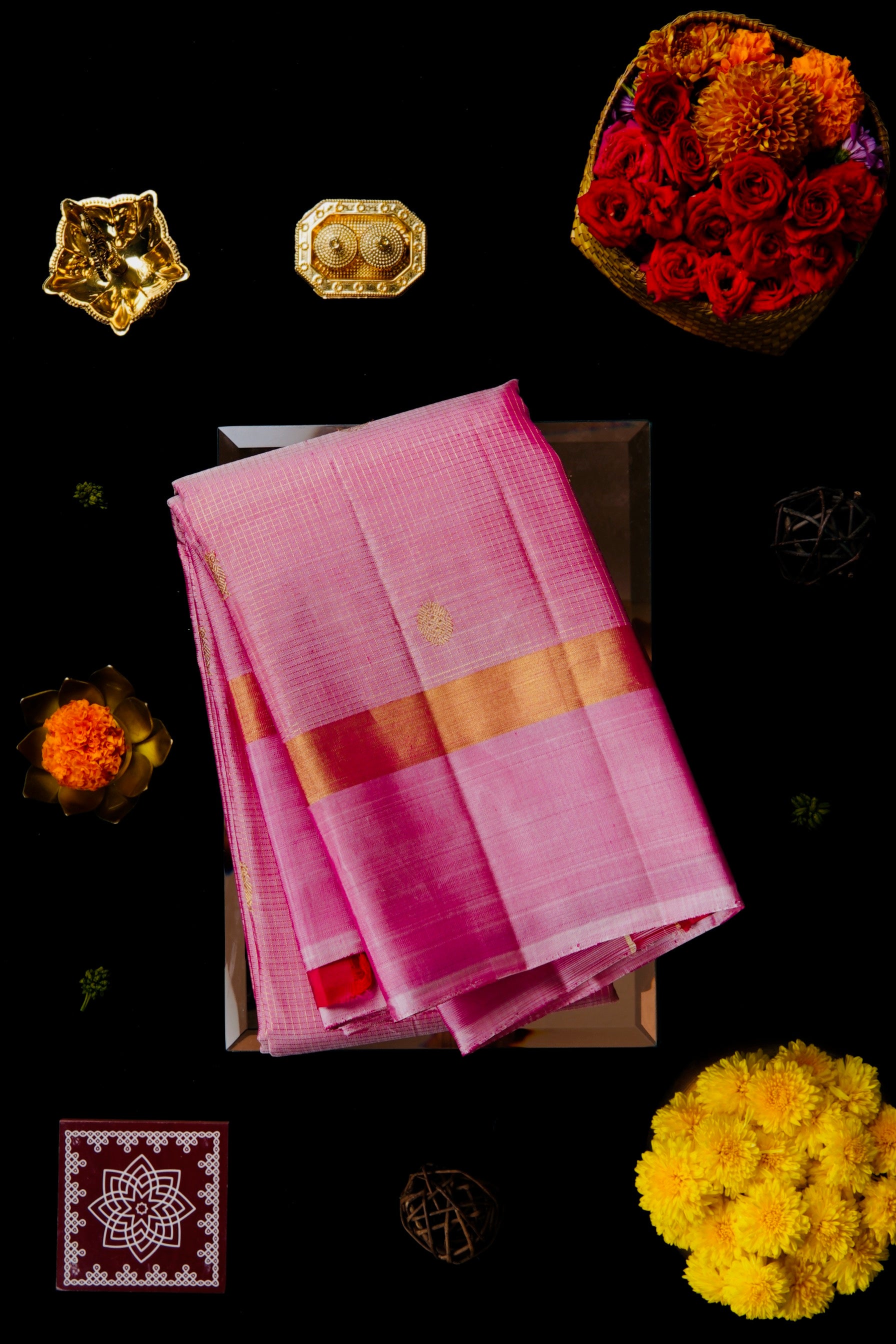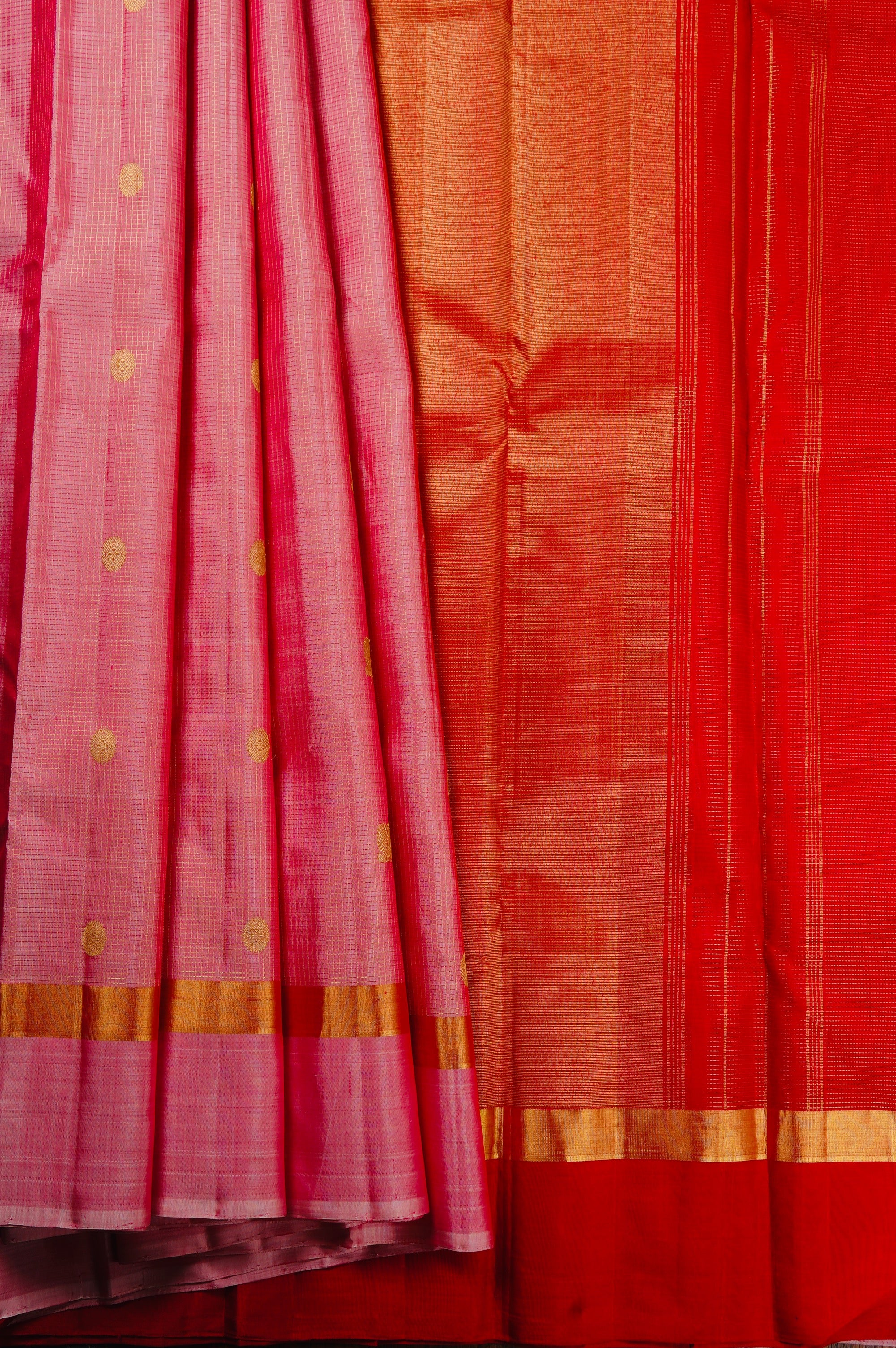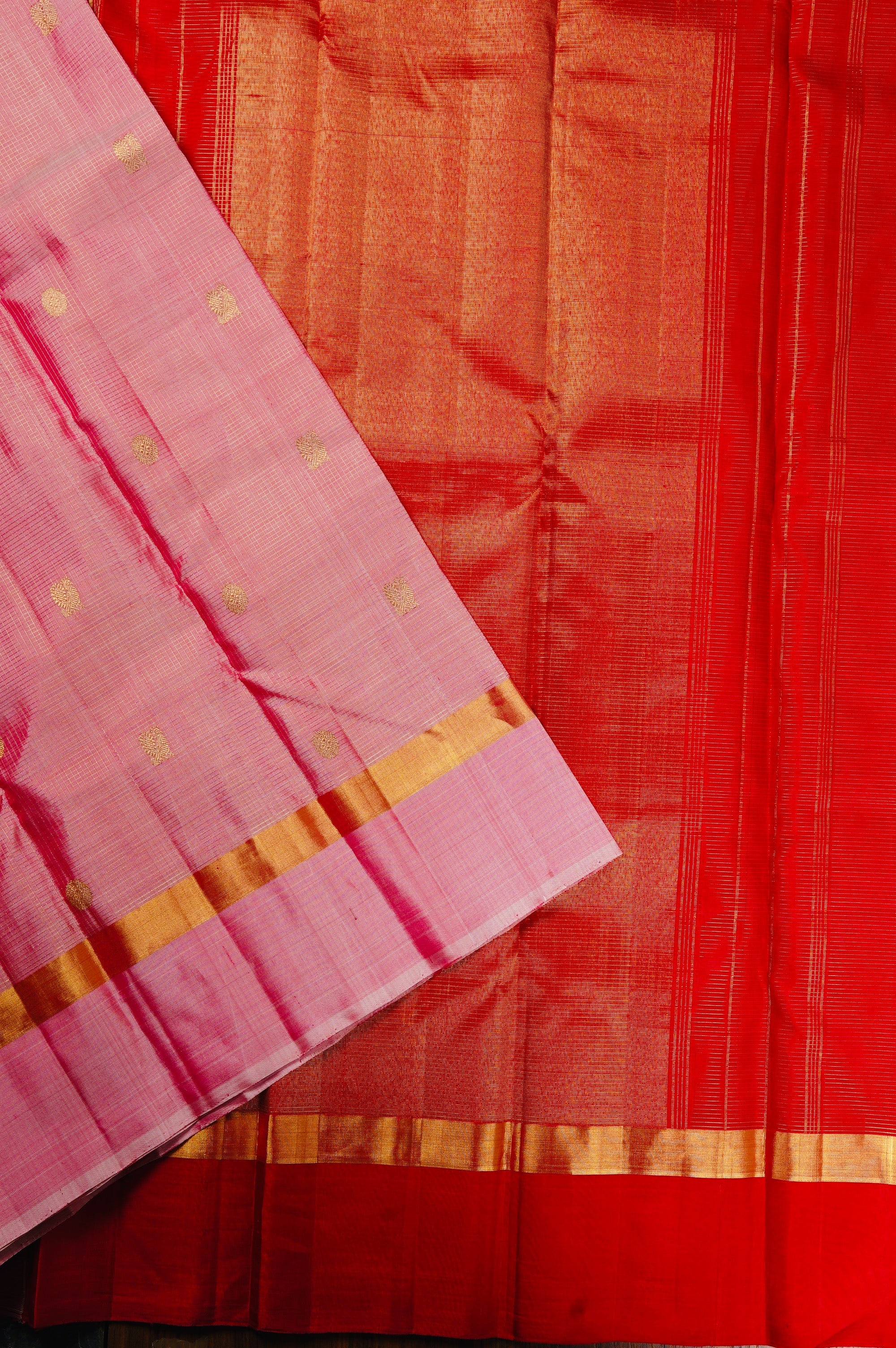 NextLight pink kanchipuram silk saree with very small gold zari checks and peacock and circle bhuttas woven throughout the body in gold zari. The border is a thin band of gold zari followed by a plain light pink space. The pallu has a bright red base with a band of red and gold undertones followed by thin lines of gold zari forming grids with the horizontal lines. The saree has a bright red blouse with thin horizontal gold zari lines and the same border.