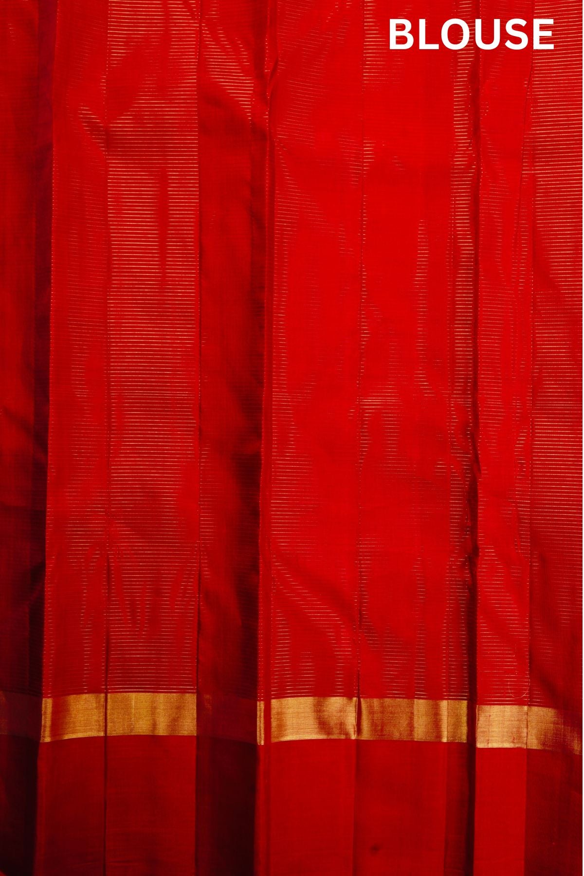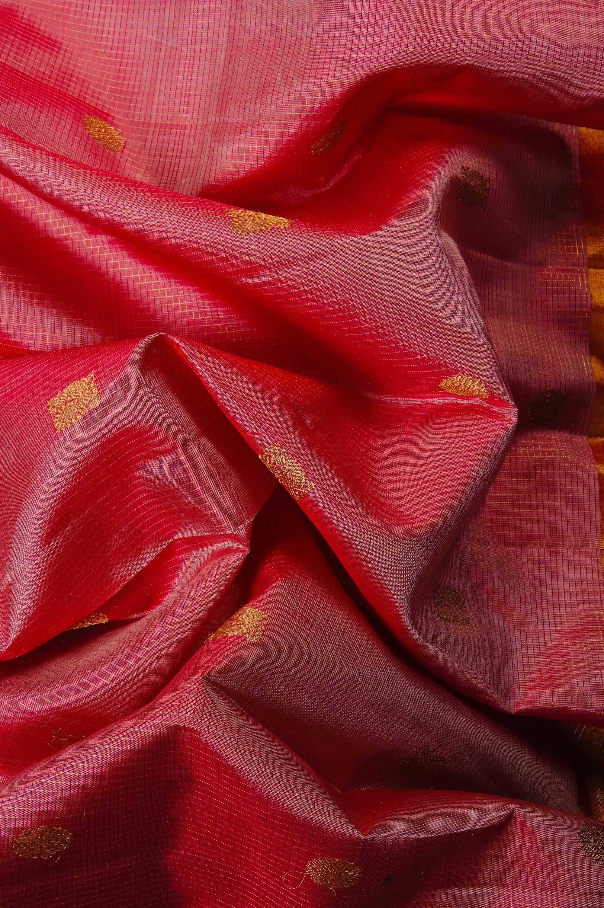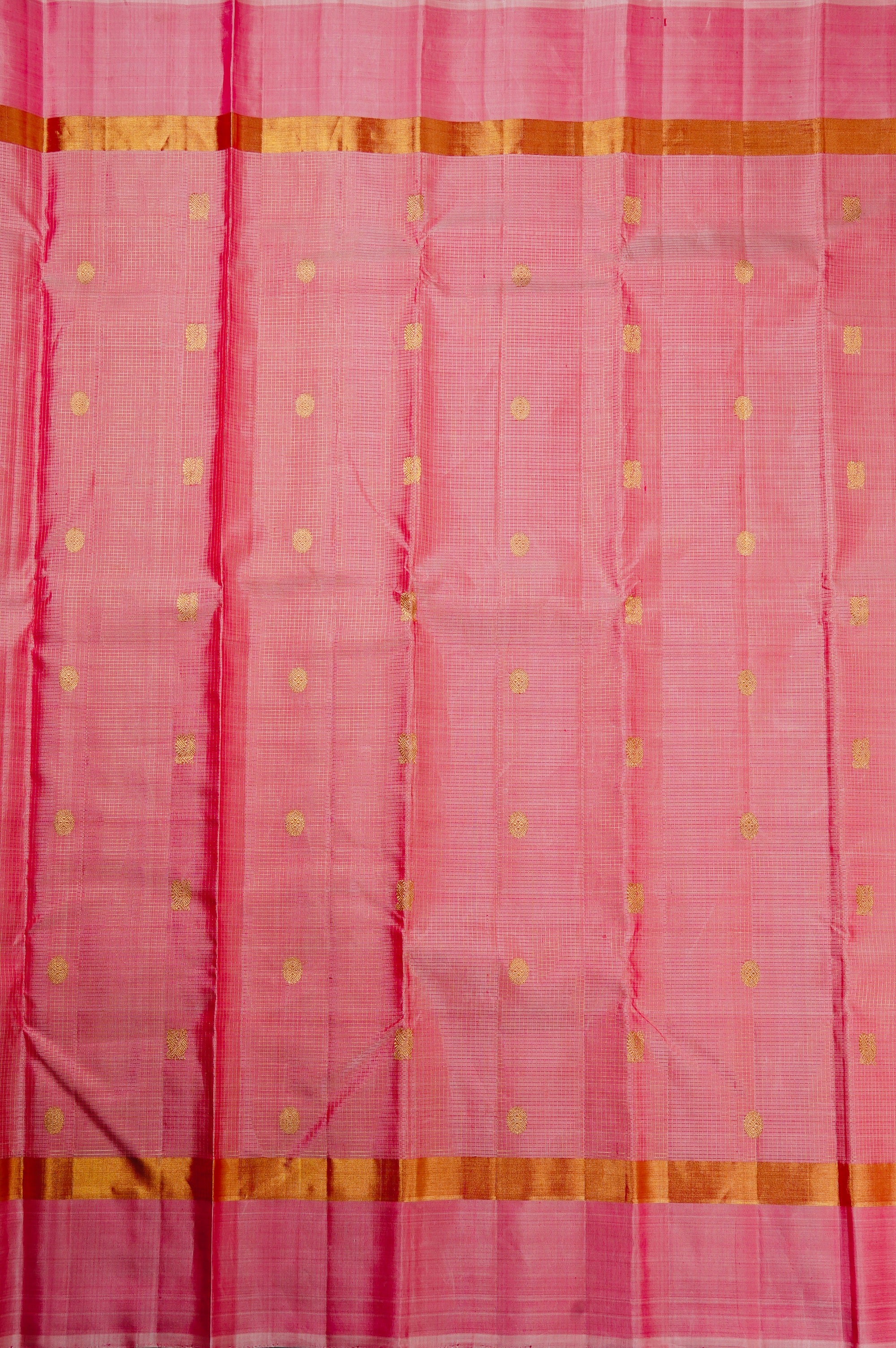 NextLight pink kanchipuram silk saree with very small gold zari checks and peacock and circle bhuttas woven throughout the body in gold zari. The border is a thin band of gold zari followed by a plain light pink space. The pallu has a bright red base with a band of red and gold undertones followed by thin lines of gold zari forming grids with the horizontal lines. The saree has a bright red blouse with thin horizontal gold zari lines and the same border.