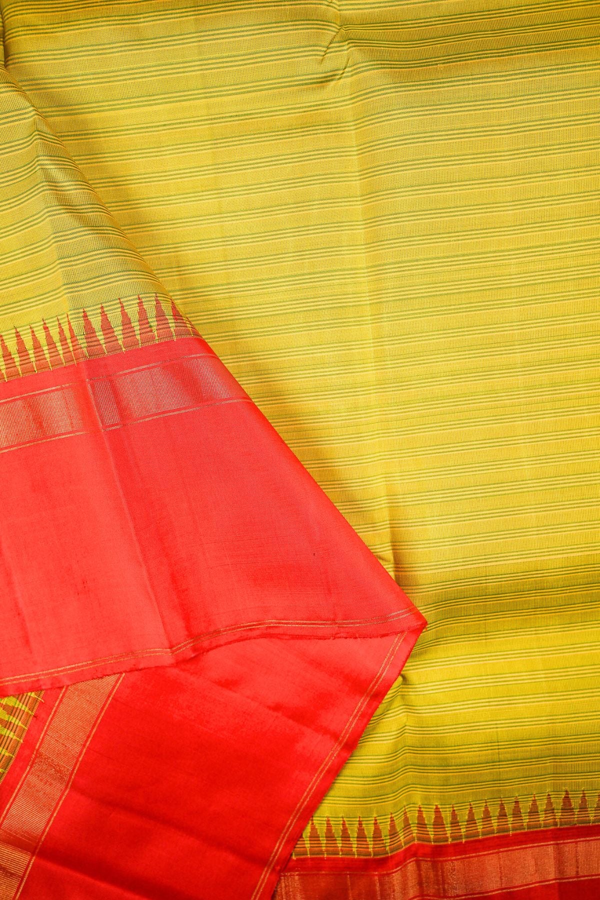 Previous NextLime green kanchipuram silk saree with self-embossed stripes woven across the body, paired with a contrast pink Temple-rek border.