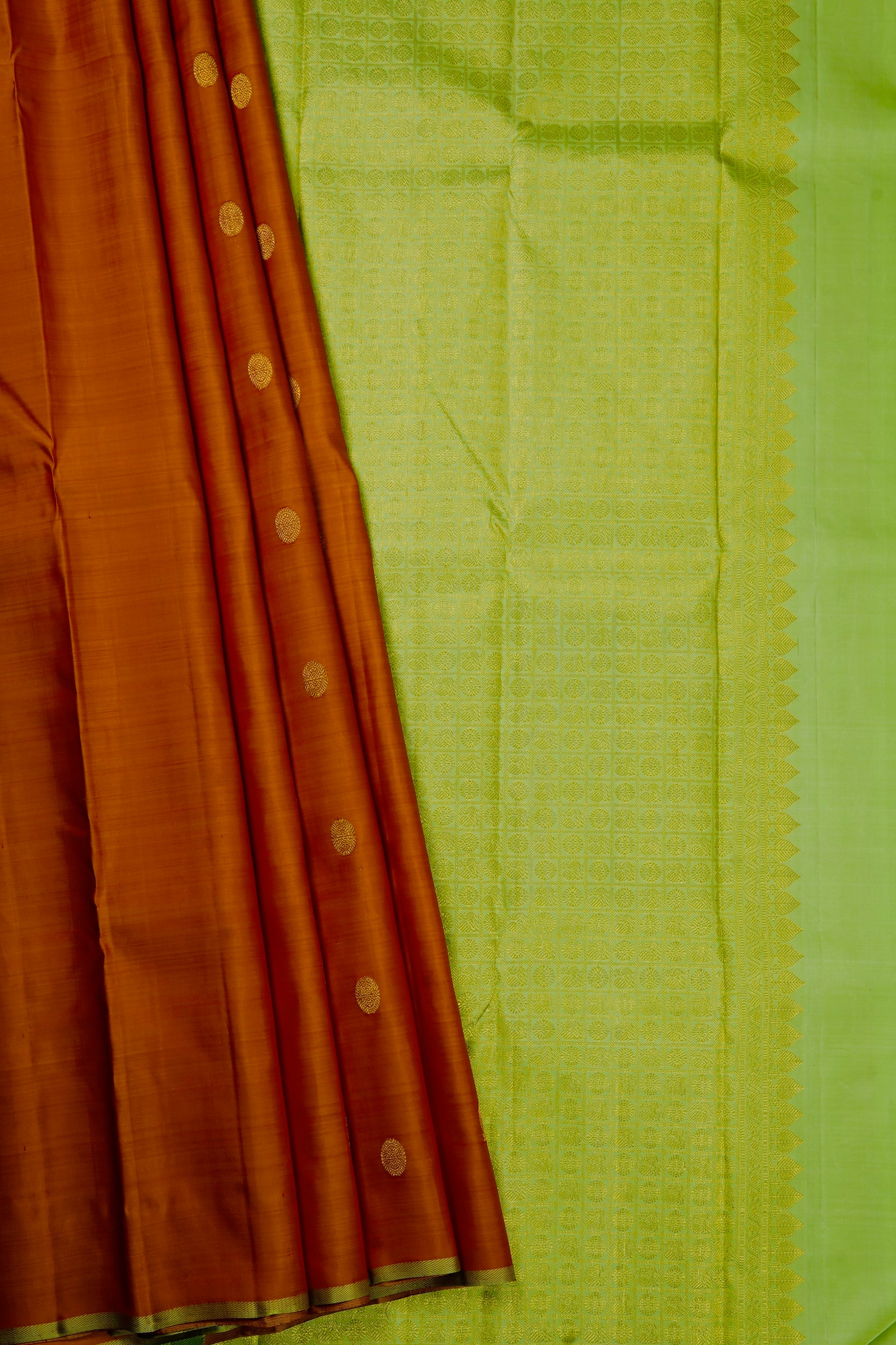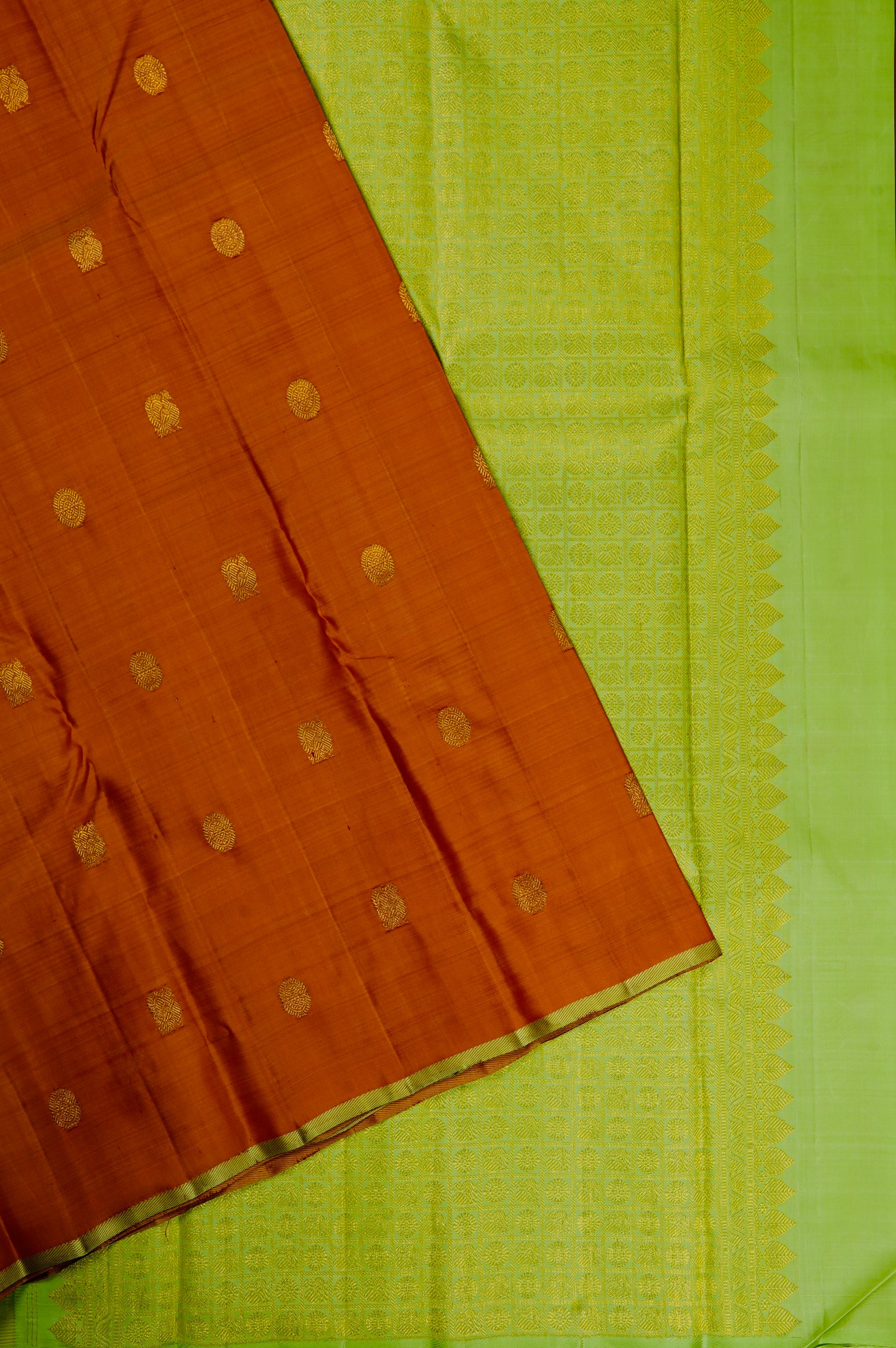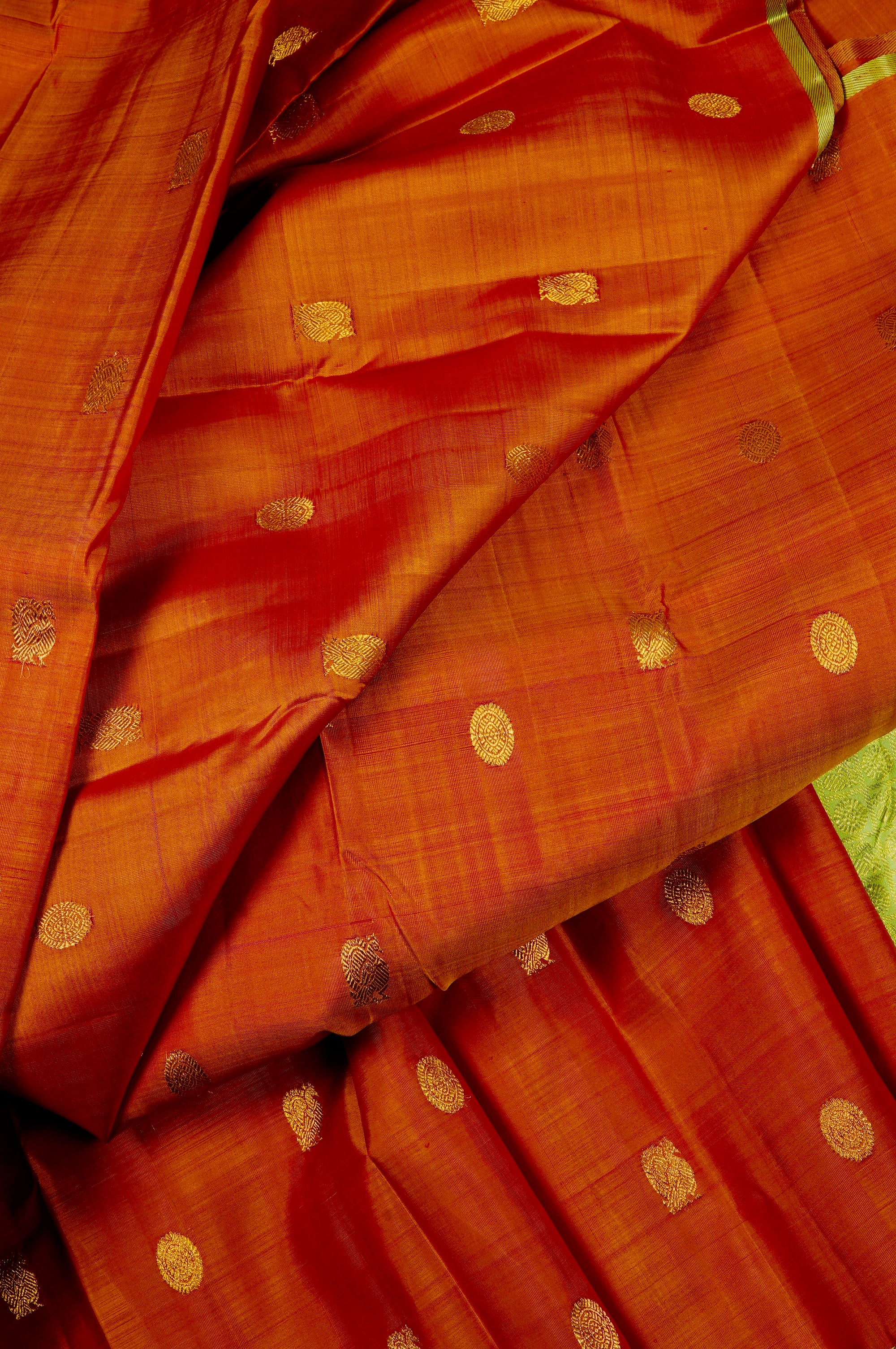 Previous NextOchre half and zari saree with intricate circular and peacock bhuttas woven in gold zari with a thin green border. The pallu has a light mint green base with a wide grid enclosing circular and peacock bhuttas followed by a band of waves and leaves woven in gold zari. The saree has a plain light mint blouse.