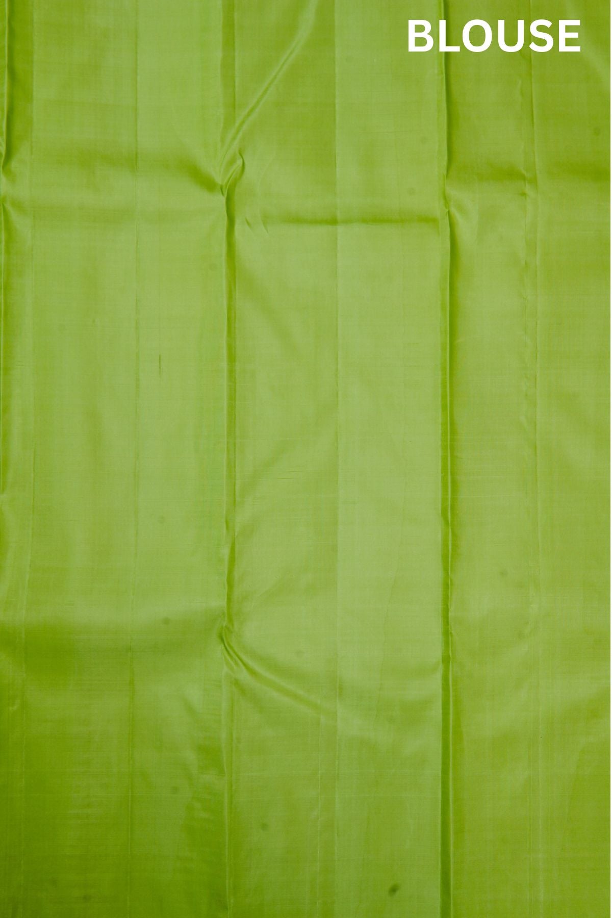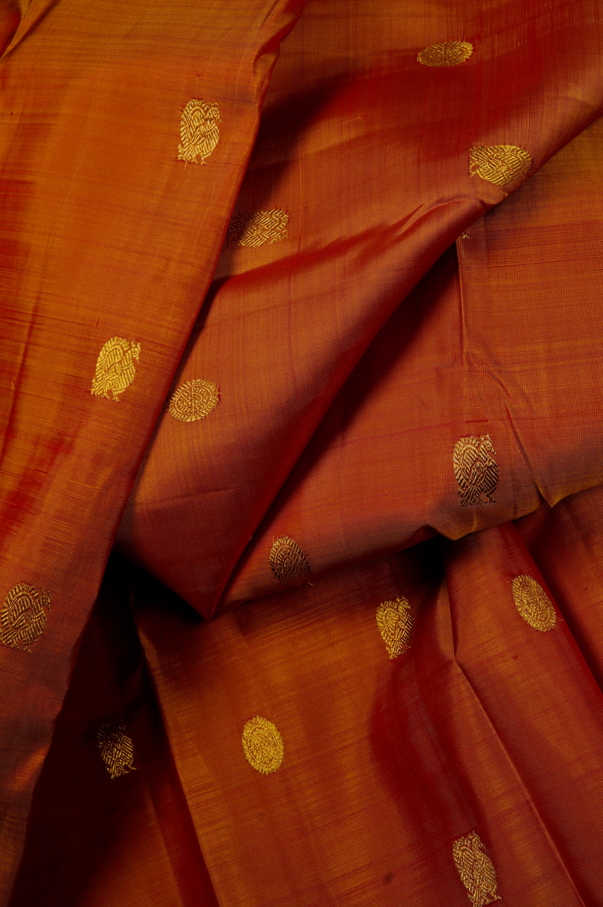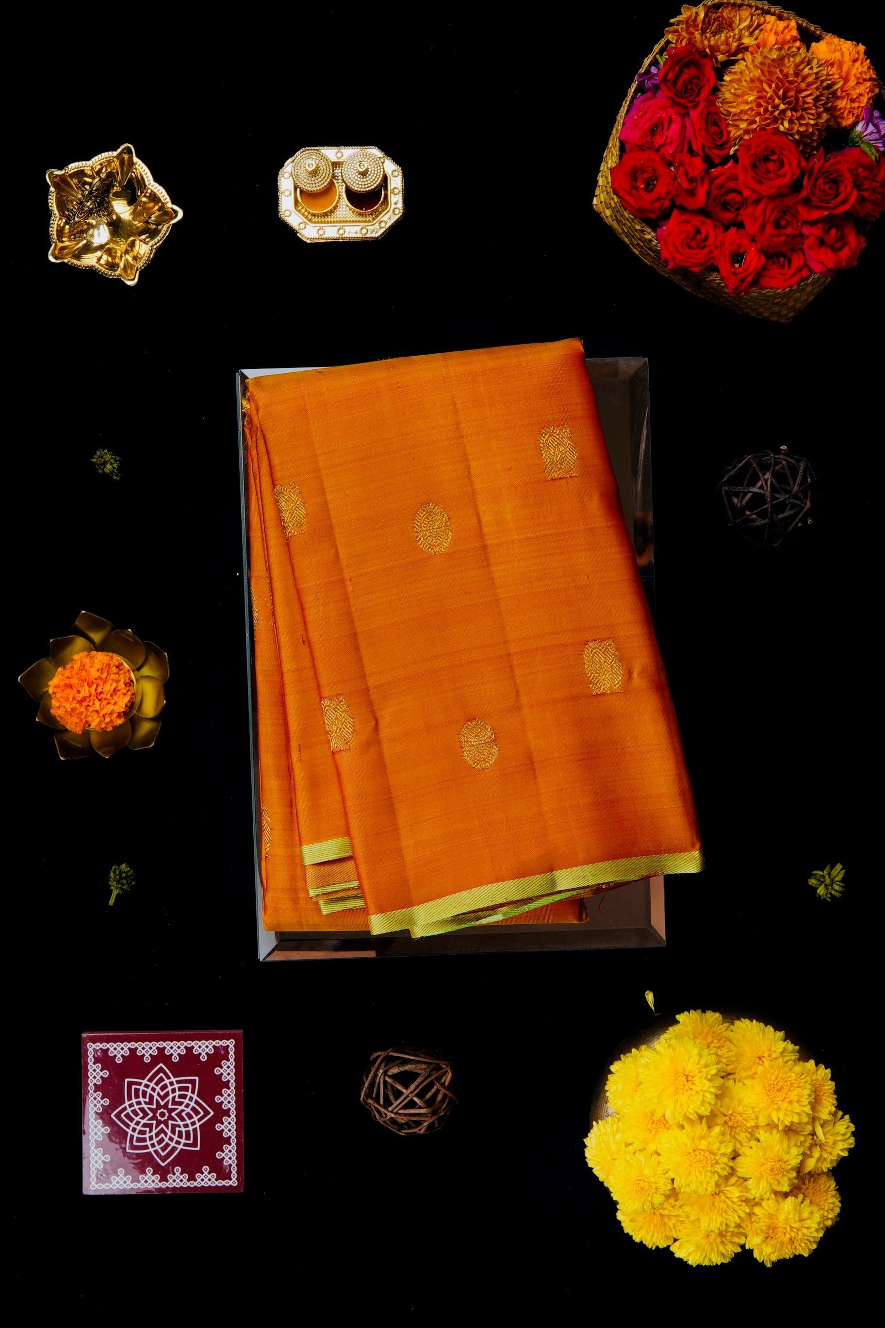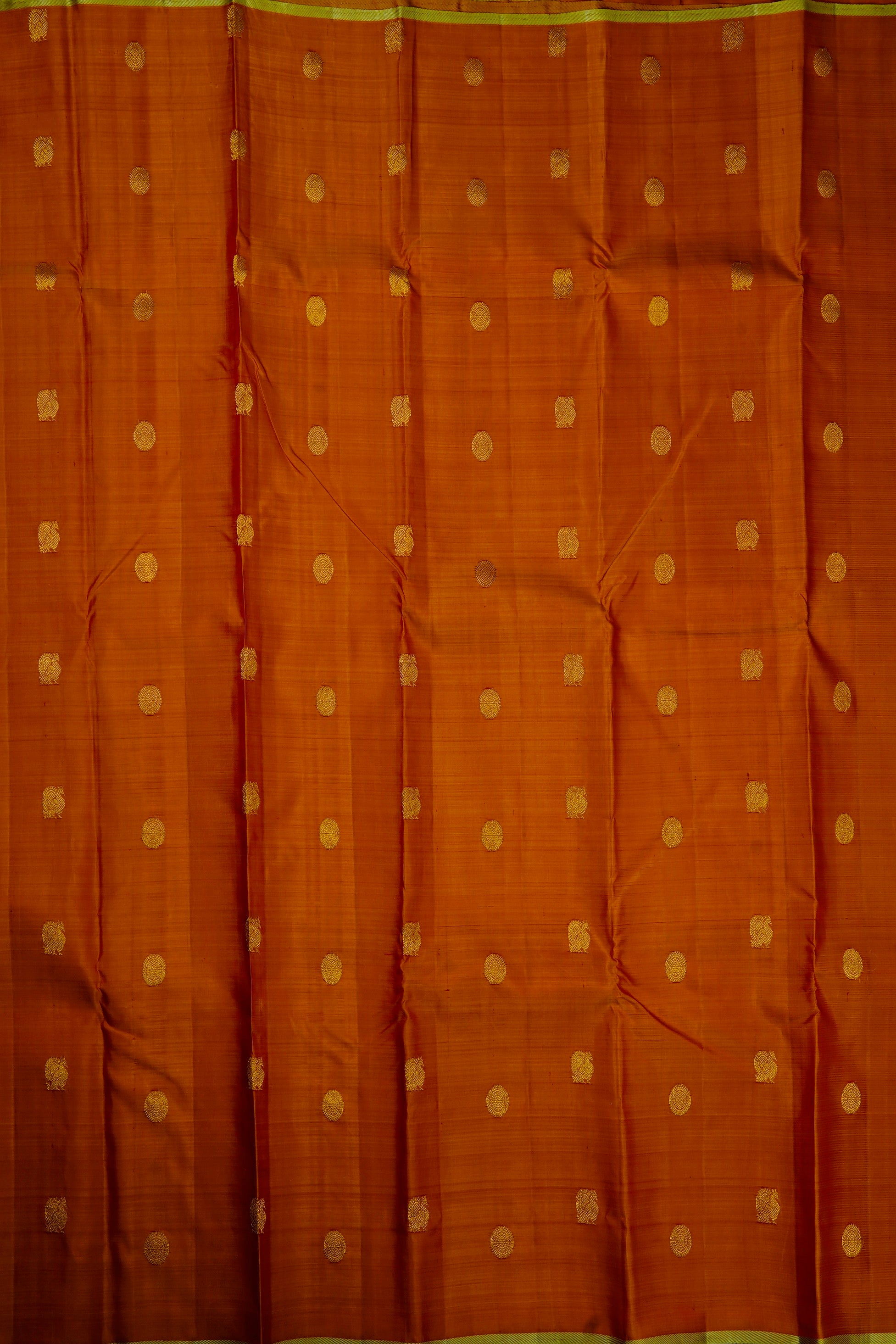 Previous NextOchre half and zari saree with intricate circular and peacock bhuttas woven in gold zari with a thin green border. The pallu has a light mint green base with a wide grid enclosing circular and peacock bhuttas followed by a band of waves and leaves woven in gold zari. The saree has a plain light mint blouse.