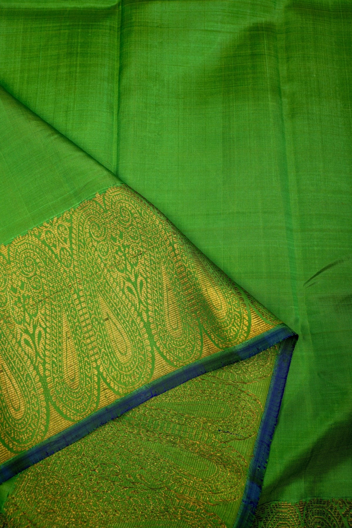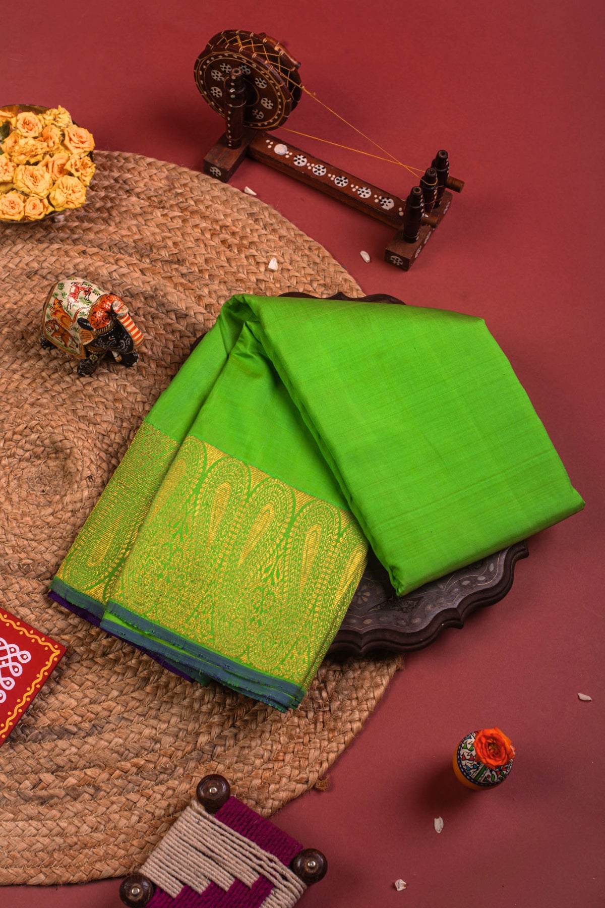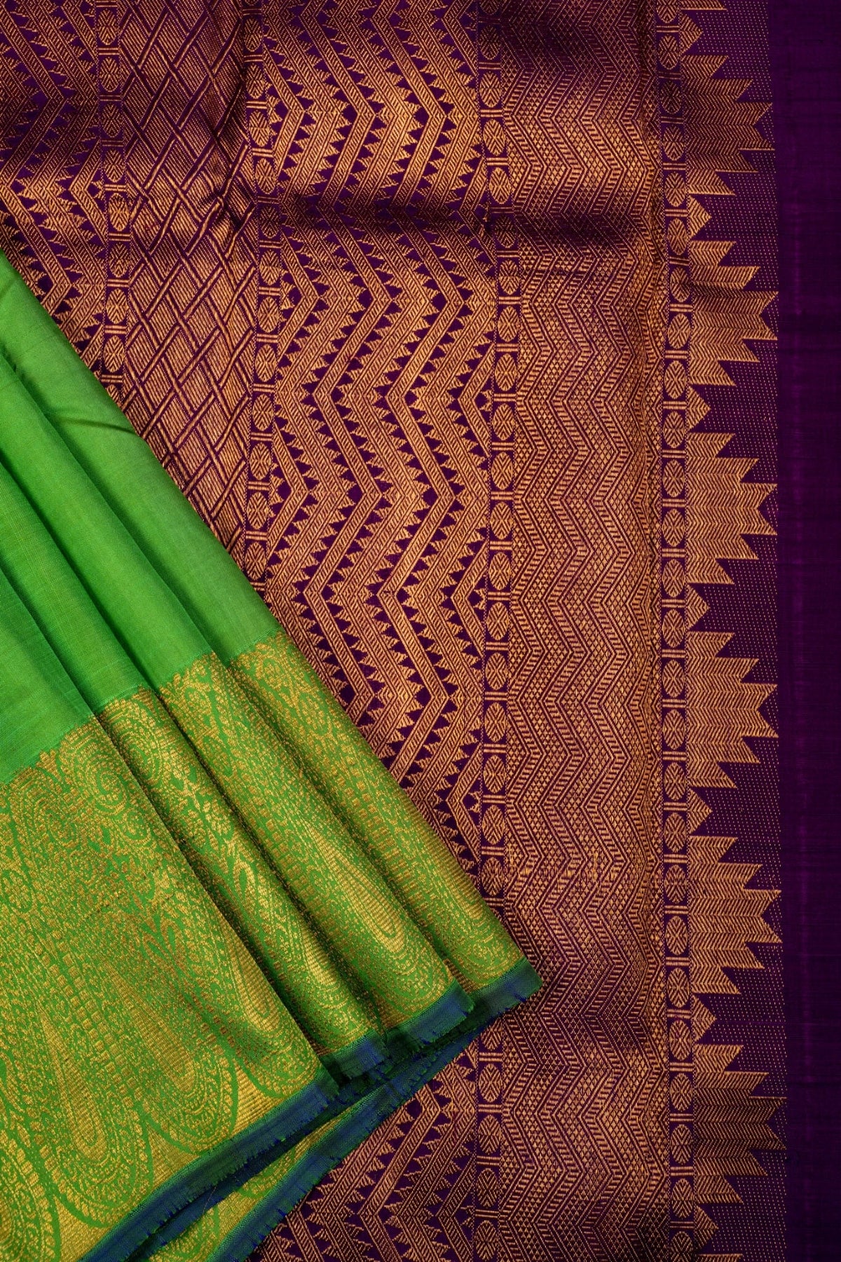 Previous NextParrot green kanchipuram silk saree with a "self" border in gold zari. Paired with a striking purple pallu.