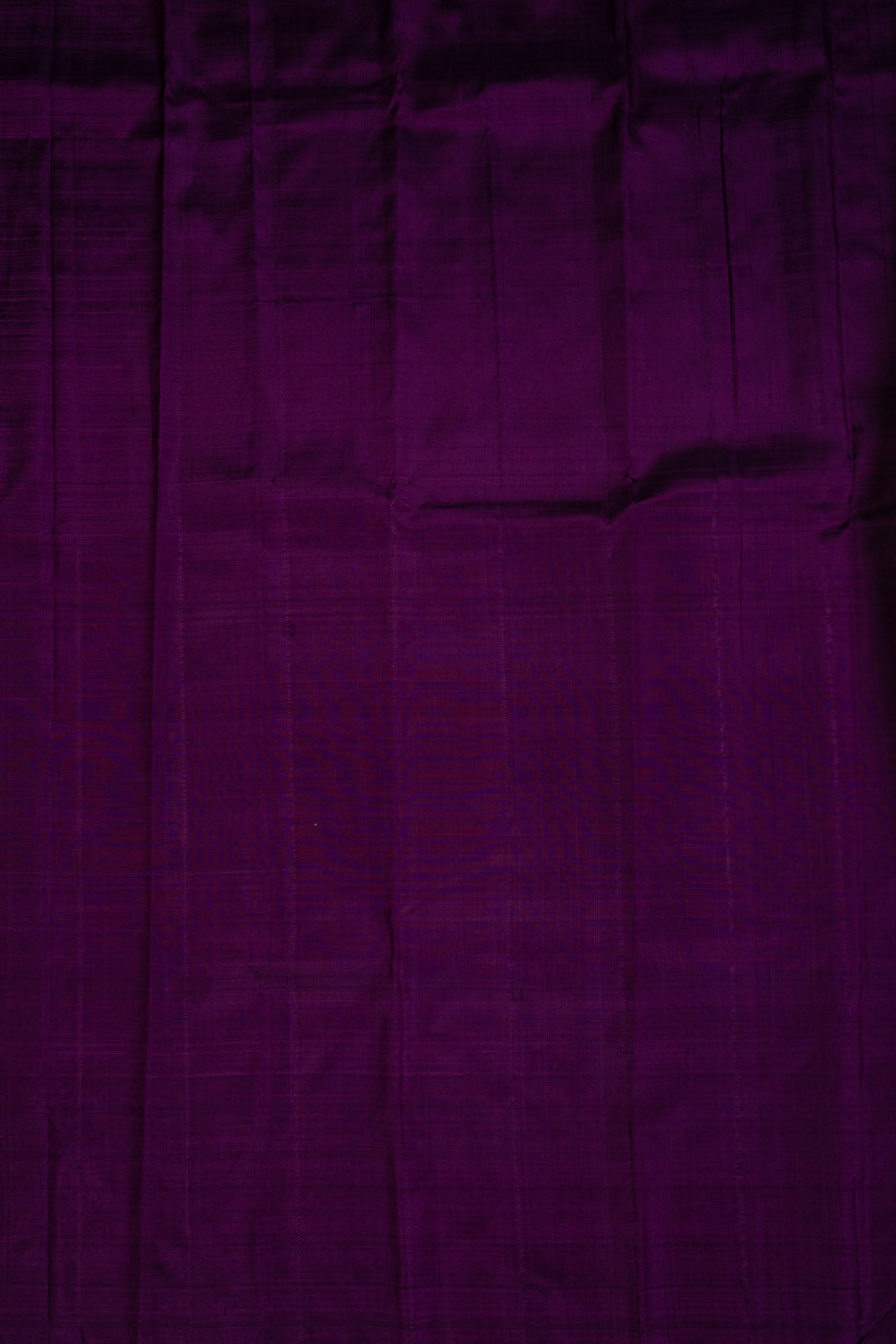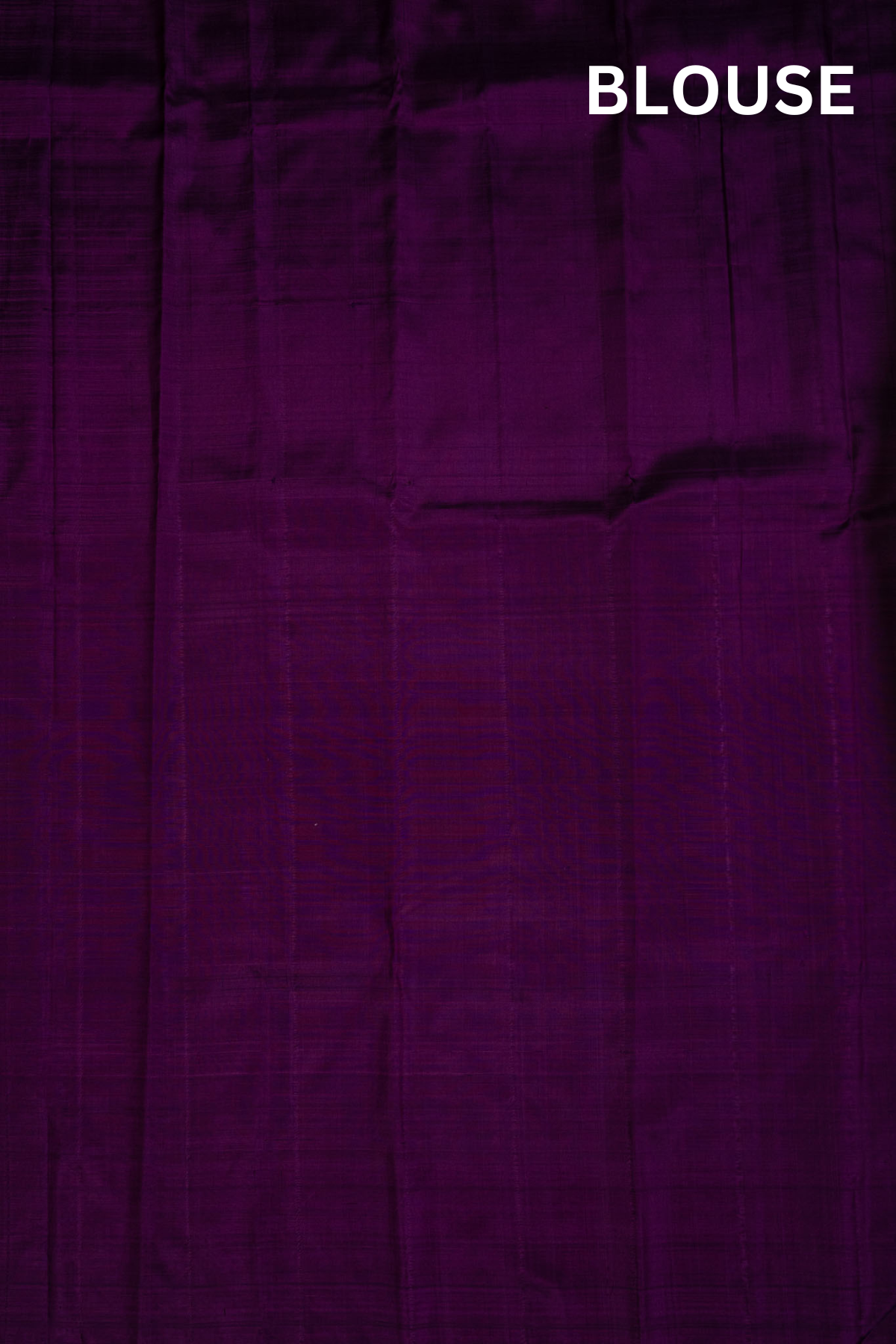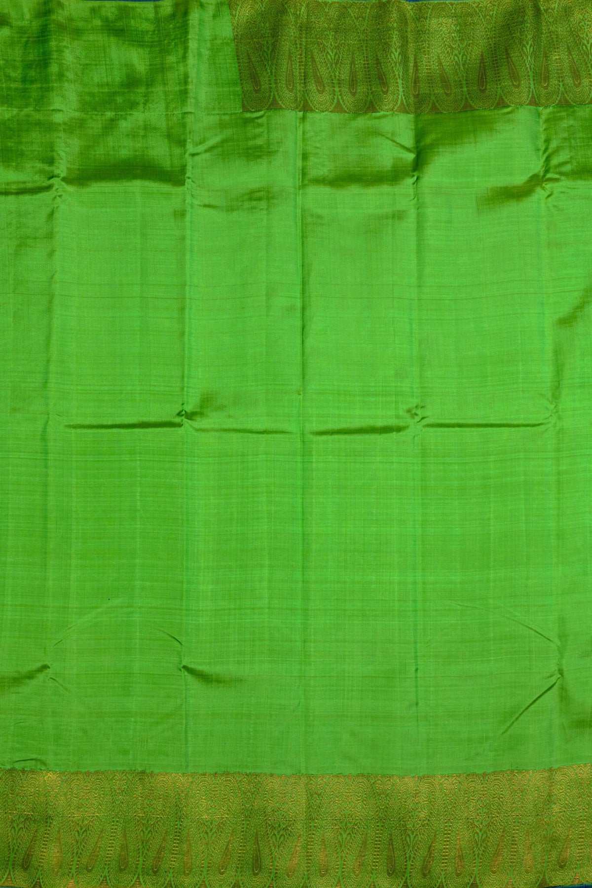 Previous NextParrot green kanchipuram silk saree with a "self" border in gold zari. Paired with a striking purple pallu.