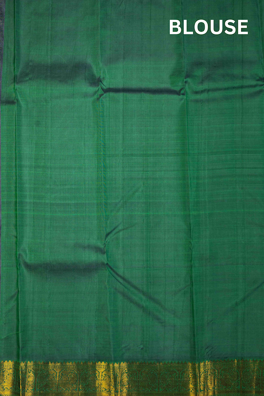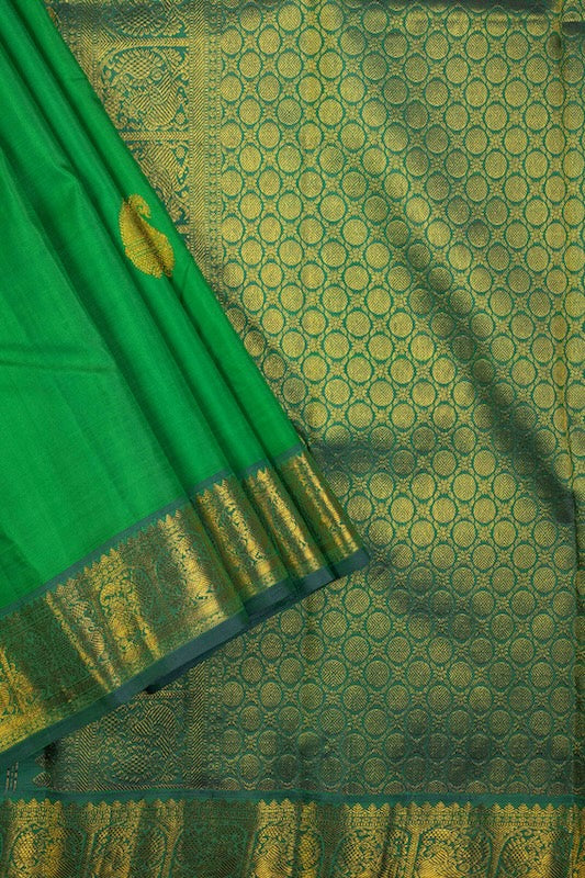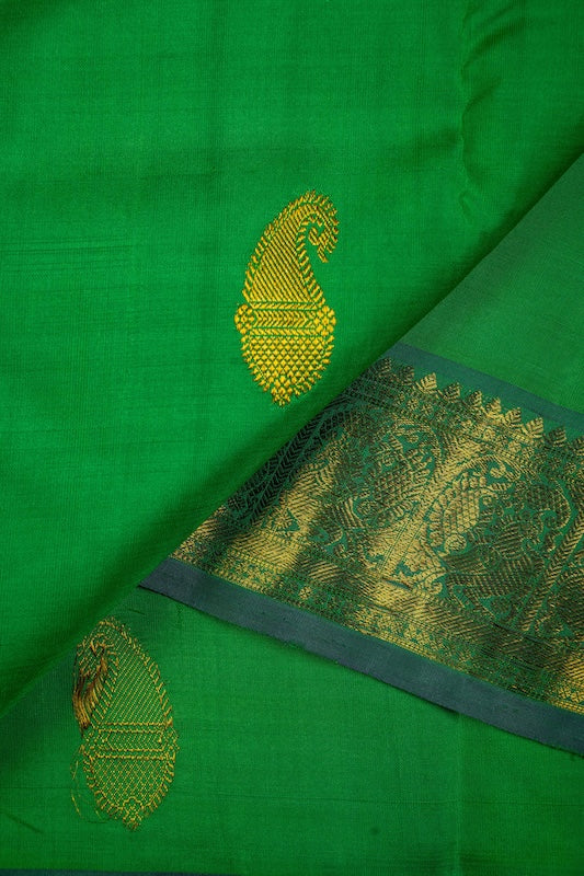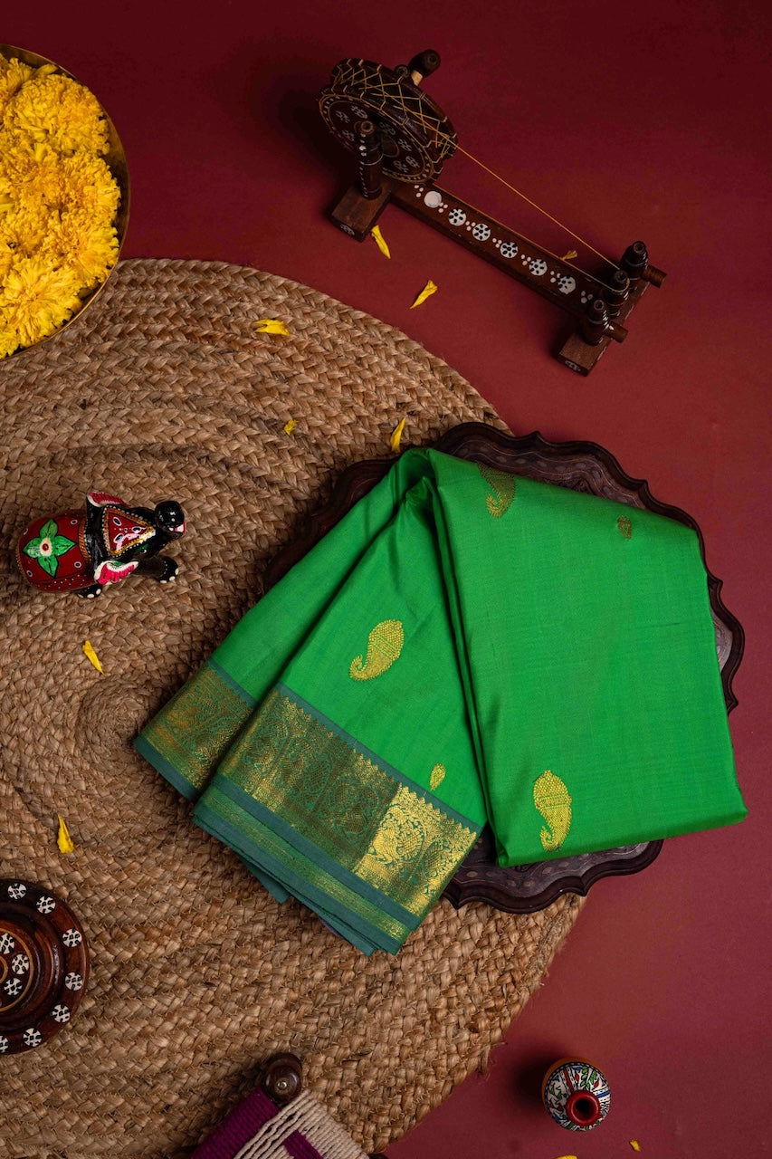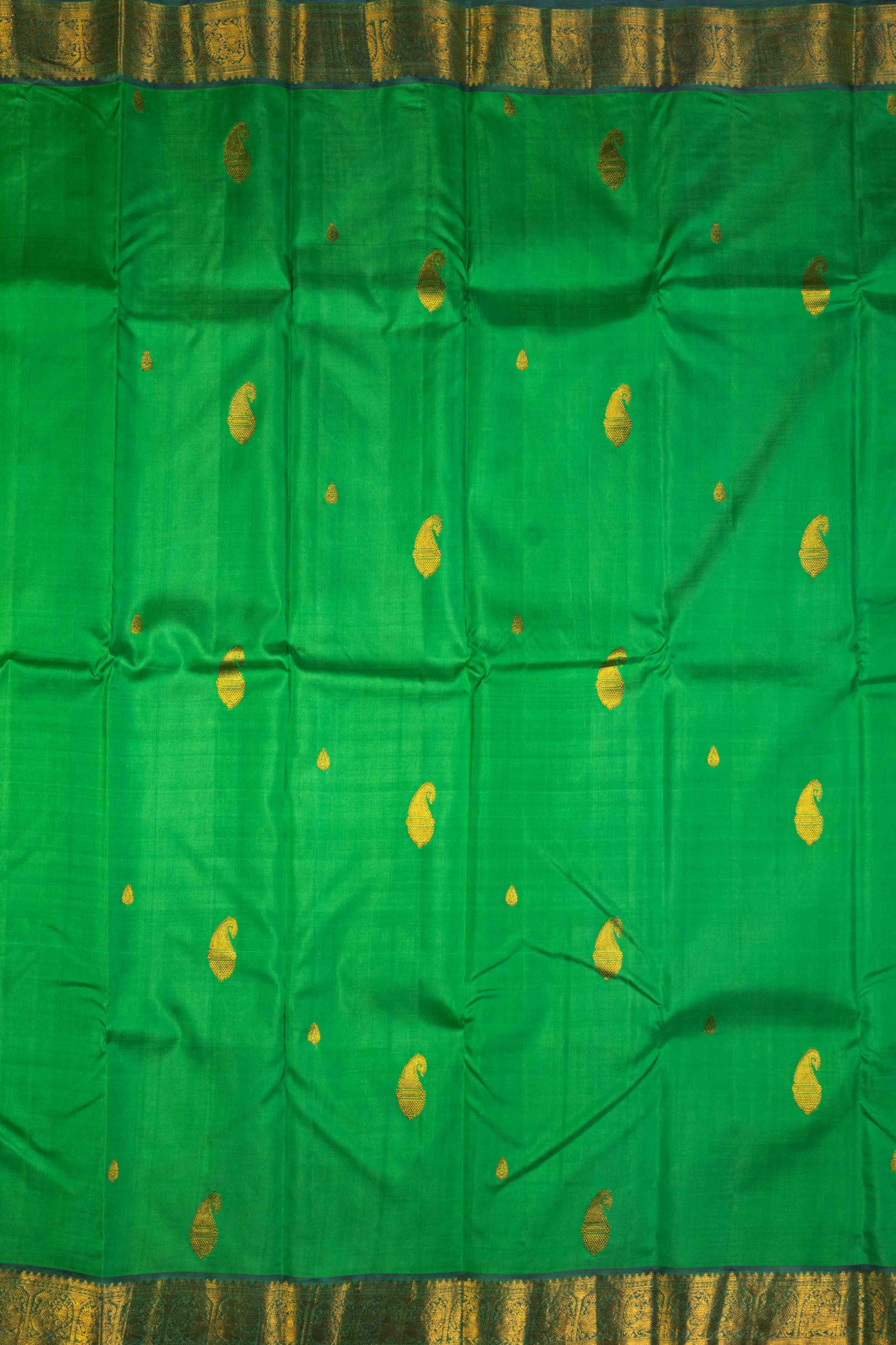 Previous NextParrot green kanchipuram silks saree with a pale blue contrast border. The body carries paisley bhuttas in gold zari.