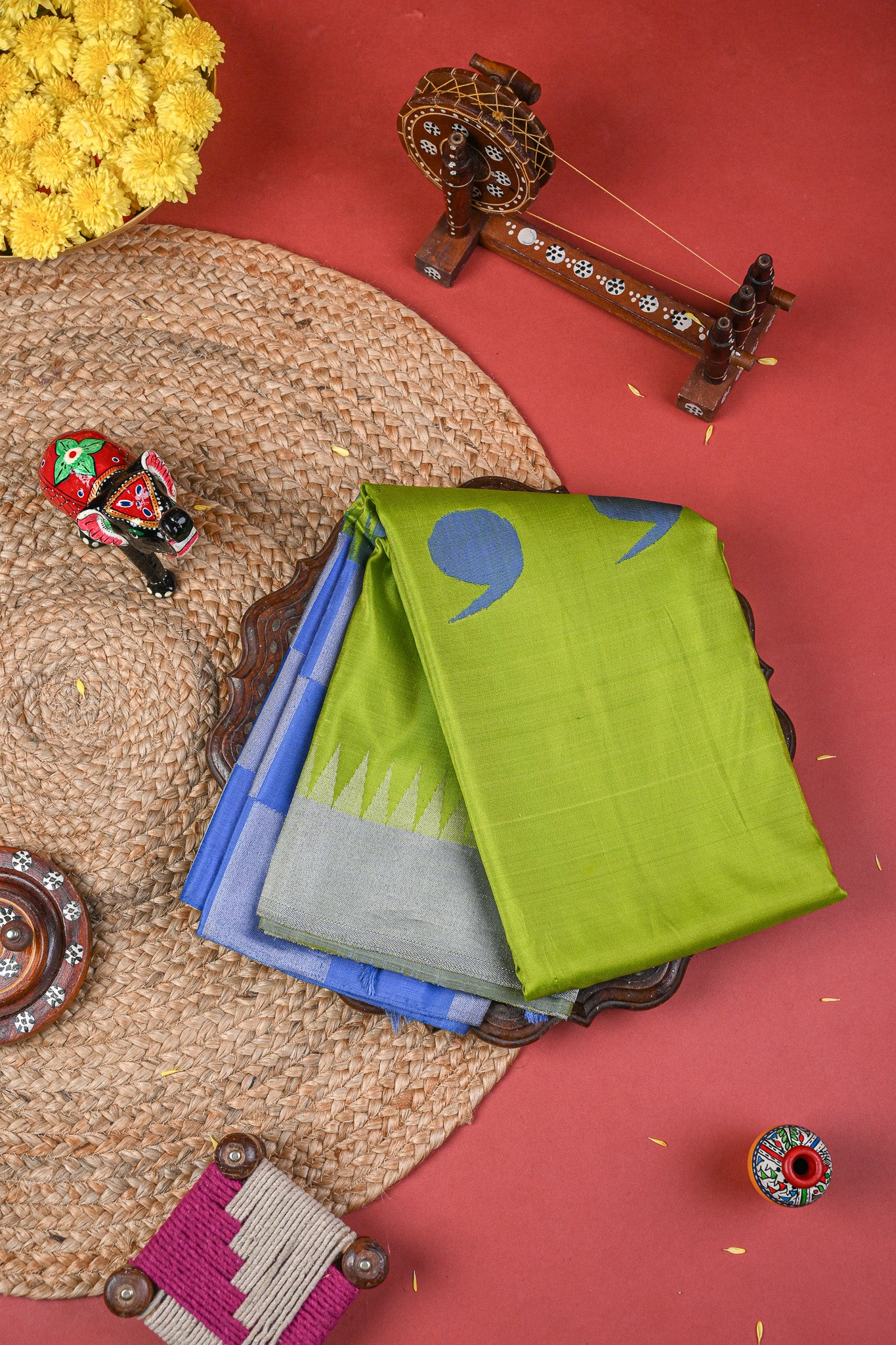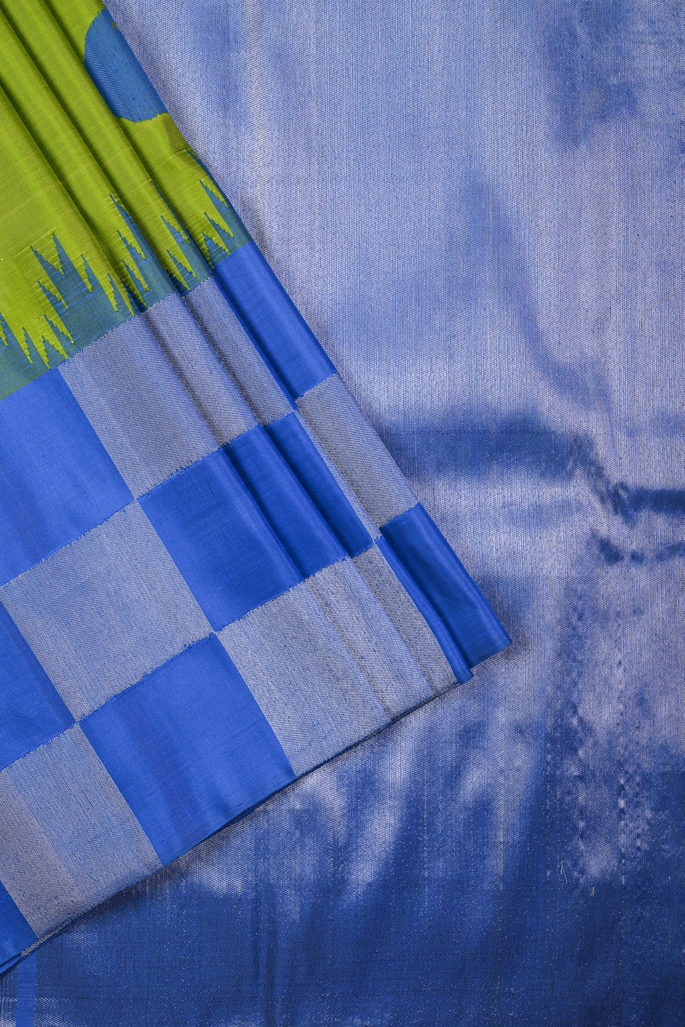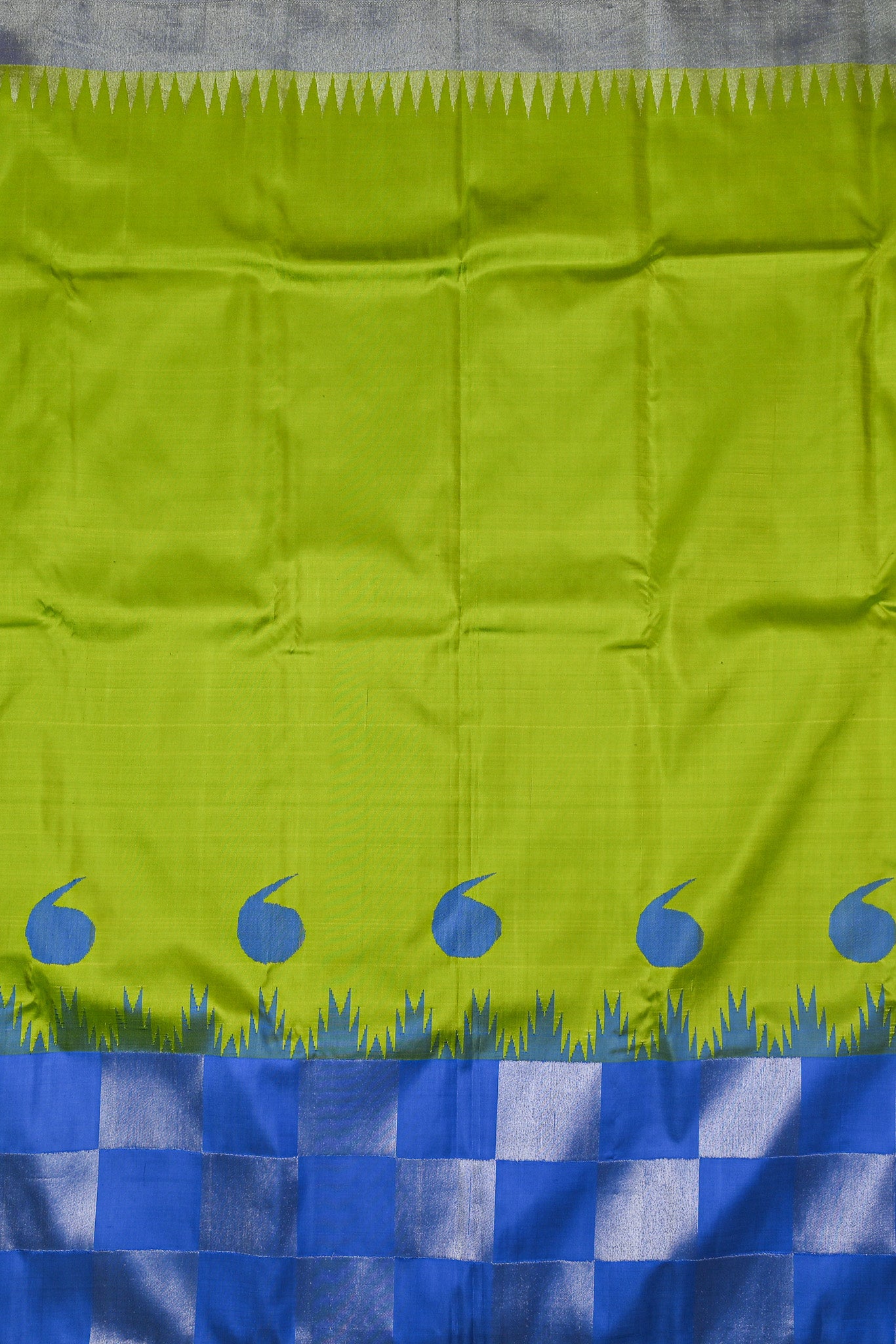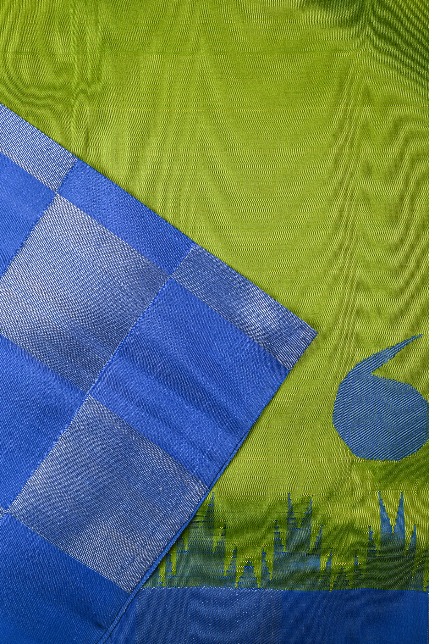 Previous NextParrot green kanchipuram silk saree with a one-sided border carrying block checks and paisley motifs in silver zari.