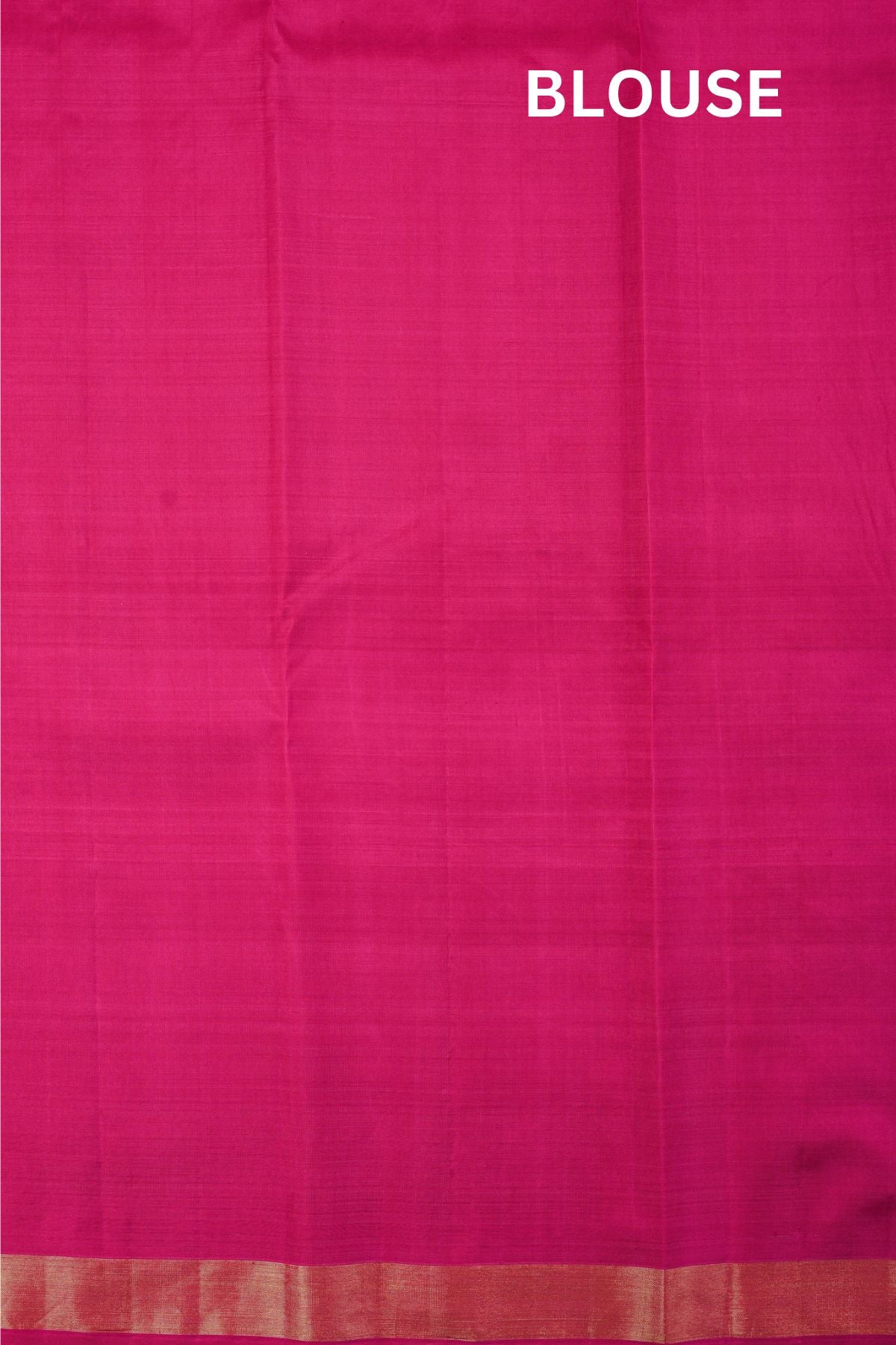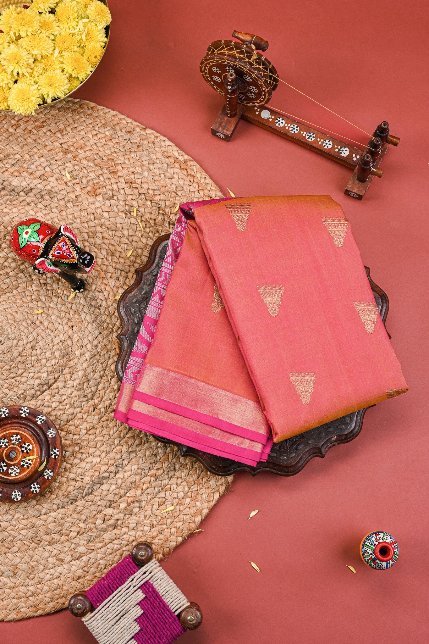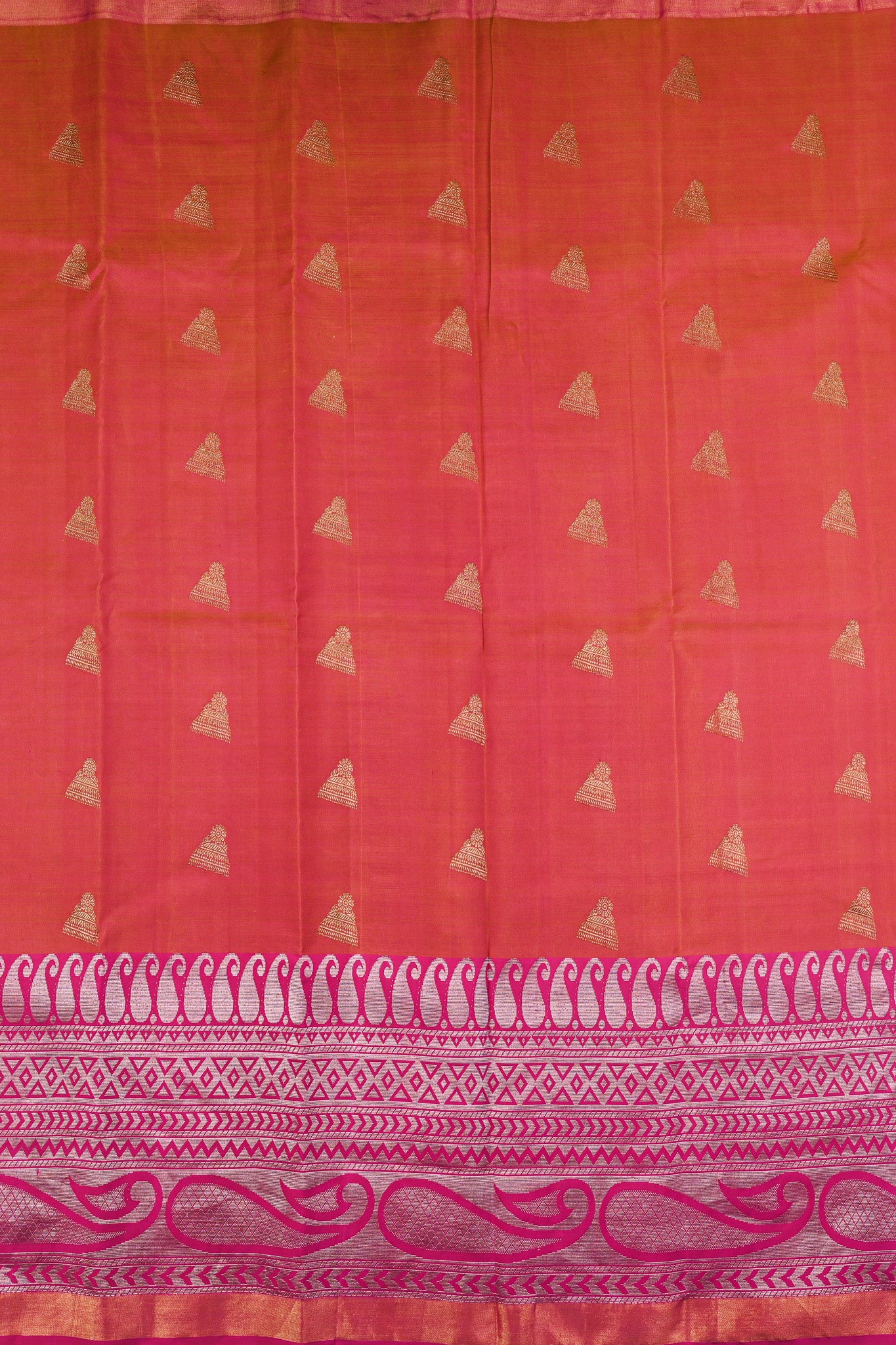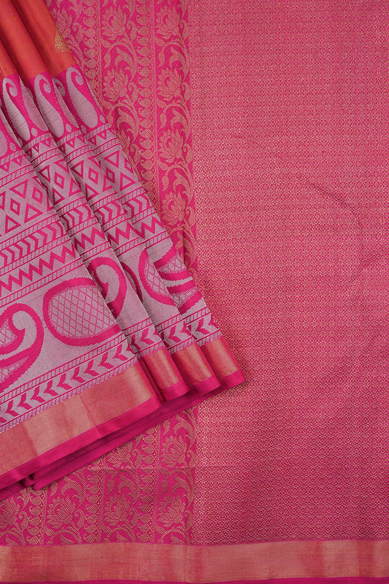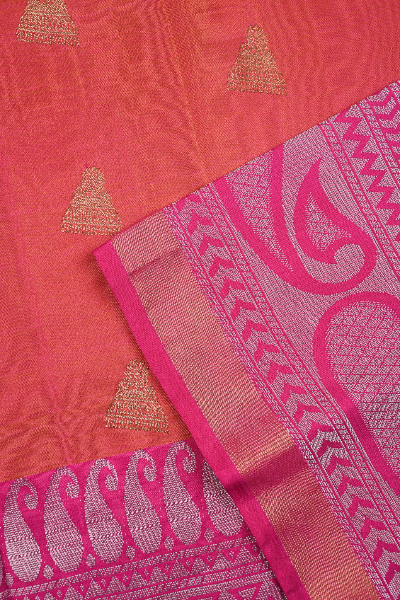Previous NextPeach kanchipuram silk saree with a long one-sided paisley patterned border in silver zari. The body carries "Jimiki" bhuttas in gold zari