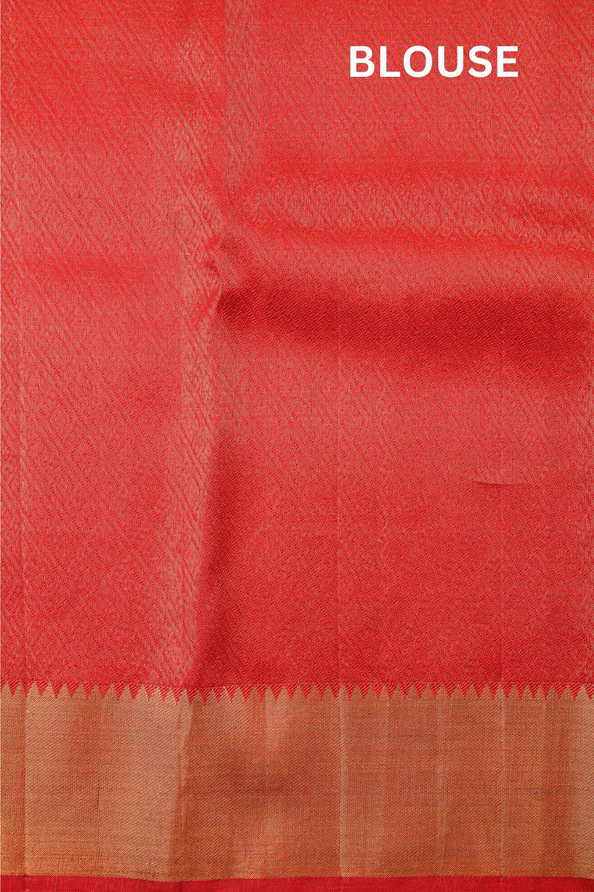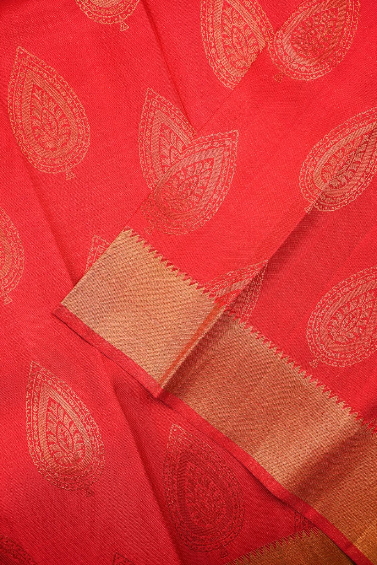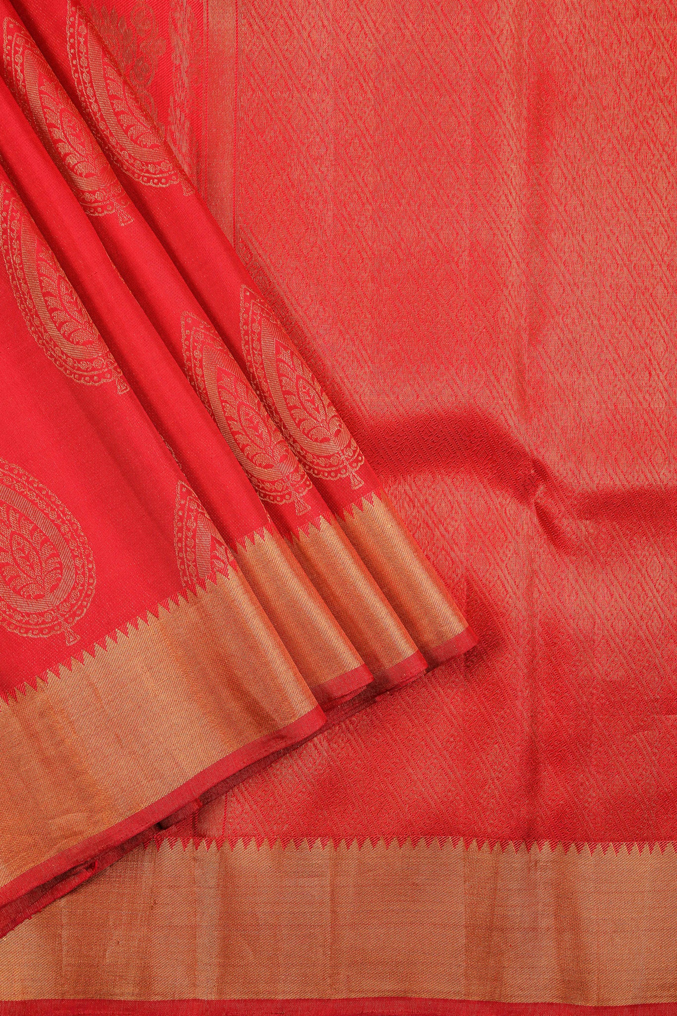 Previous NextPeach kanchipuram silk saree with classic cone bhuttas taking over the body, paired with a gold zari border.