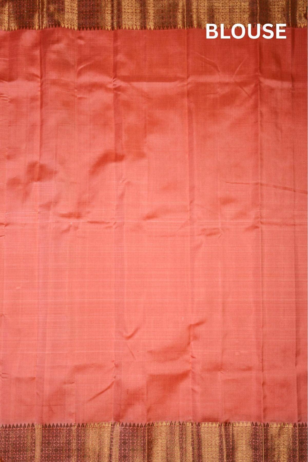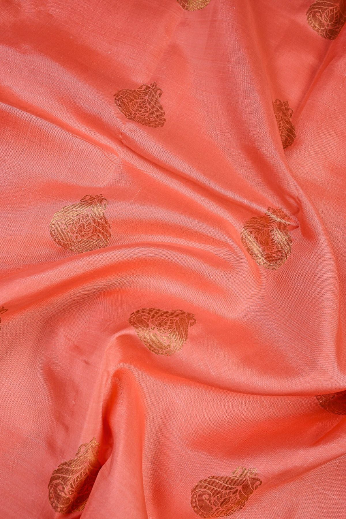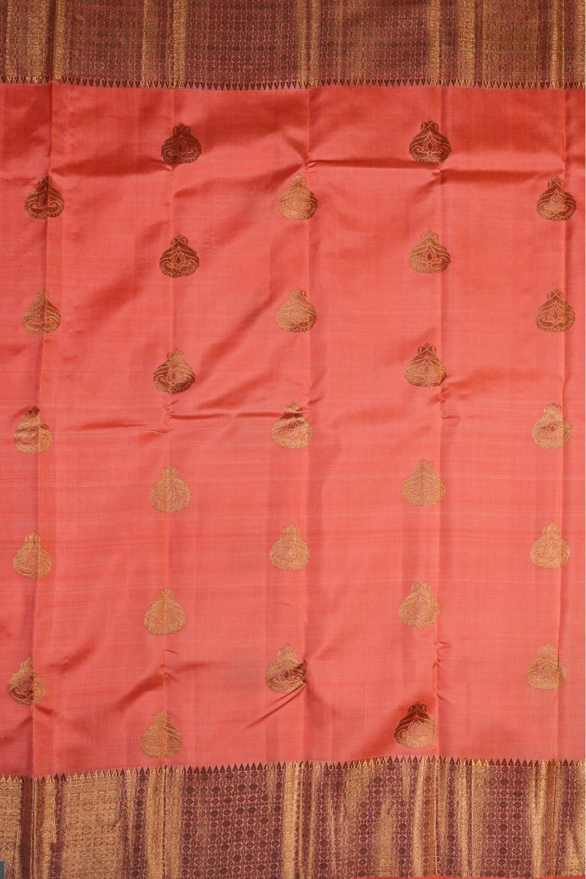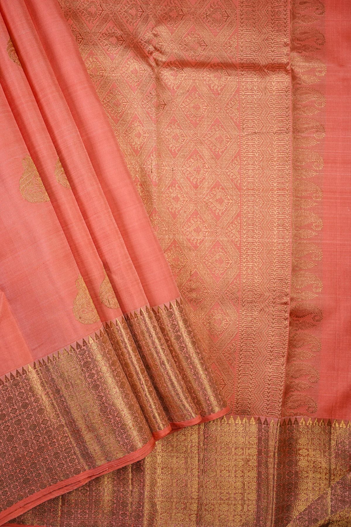 Previous NextPeach Kanchipuram Silk Saree with heritage motifs in golden zari with gird patterned border in gold zari. The "self" pallu is woven with diamond grid enclosing leaf patterns in gold zari. The saree comes with a solid colored blouse with the same gold border.