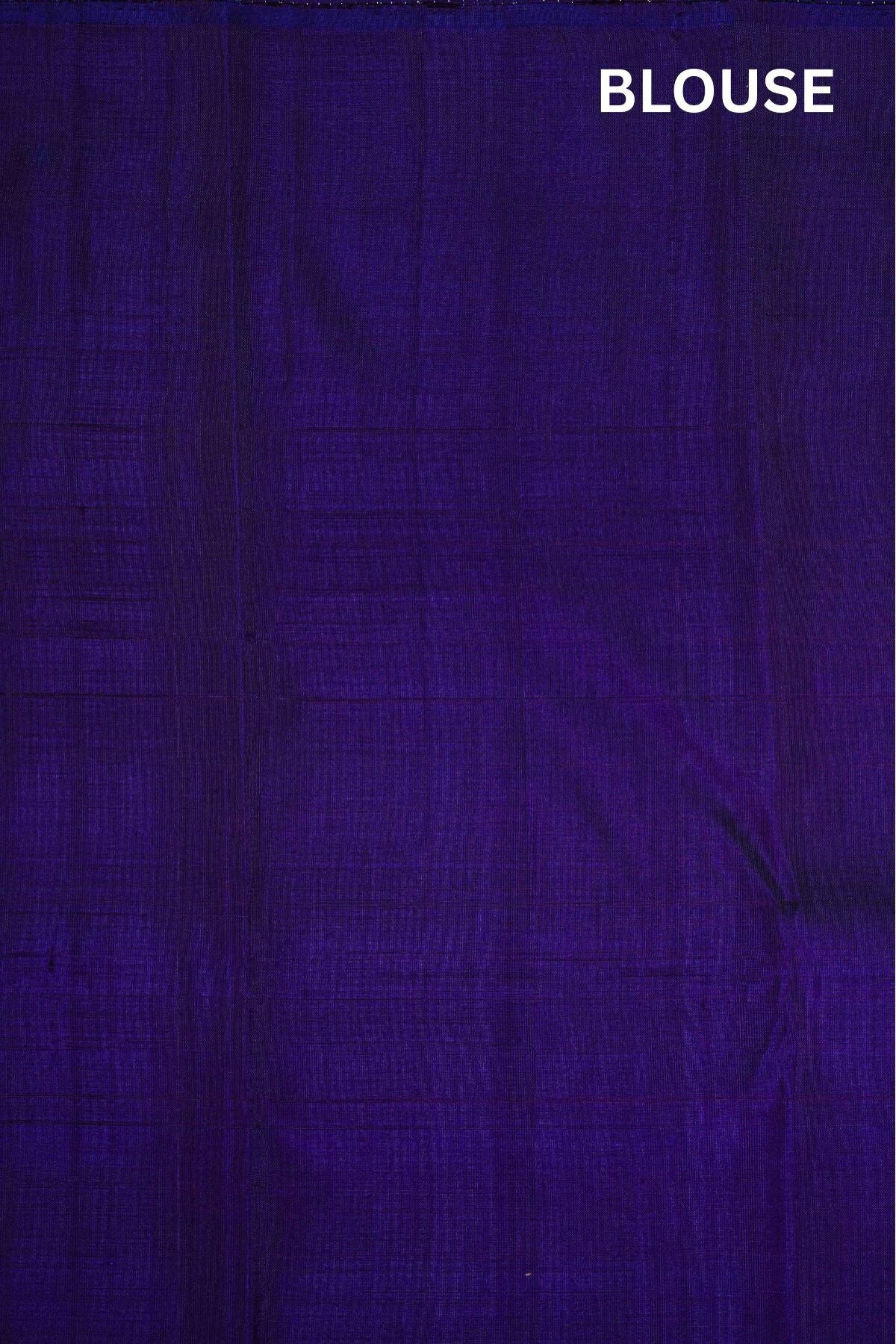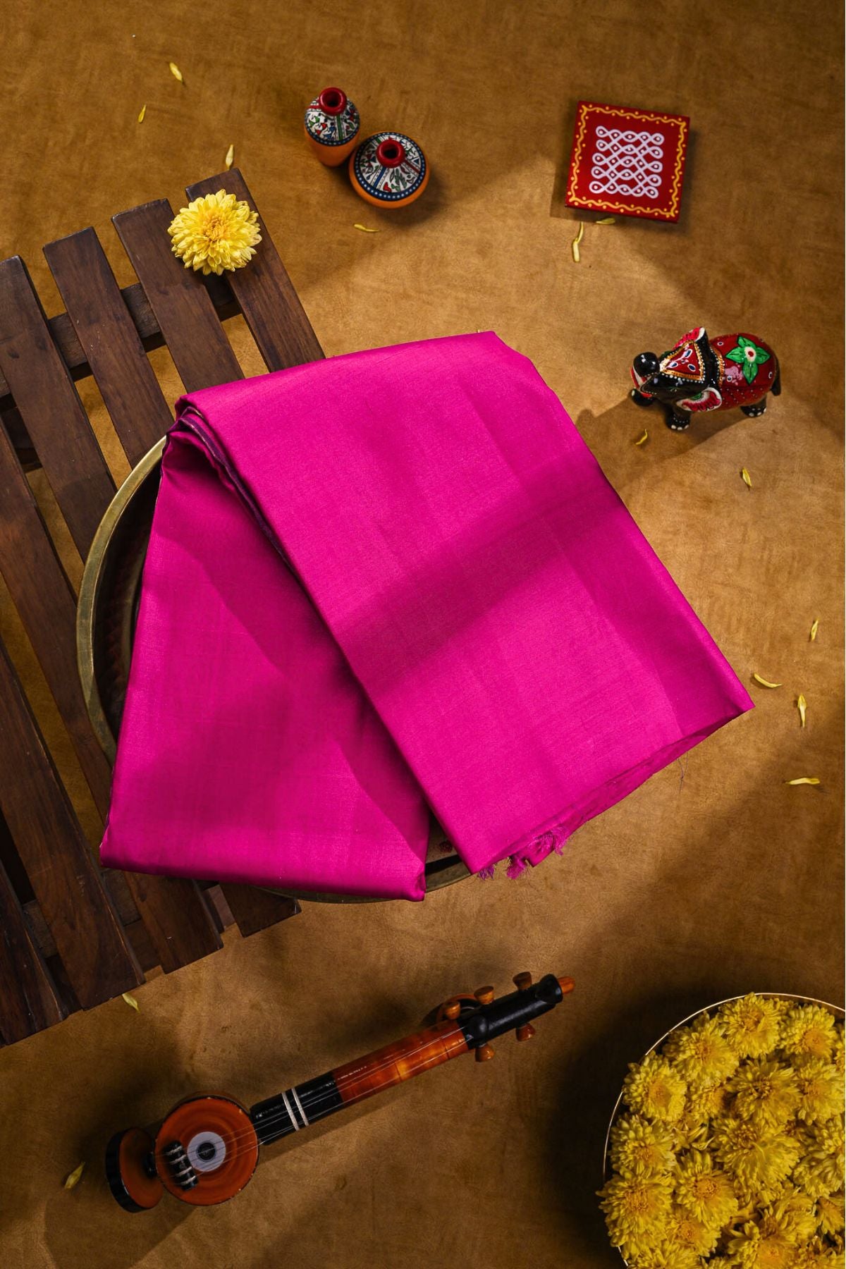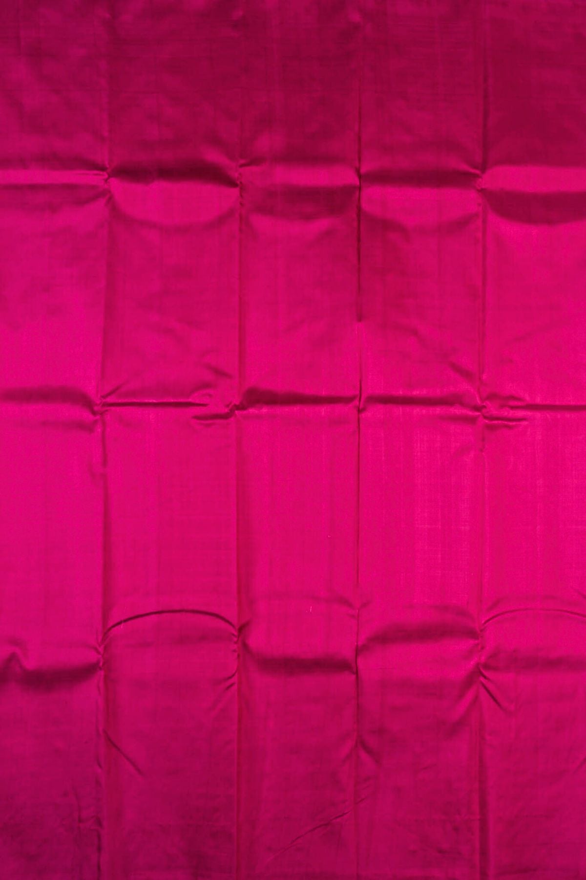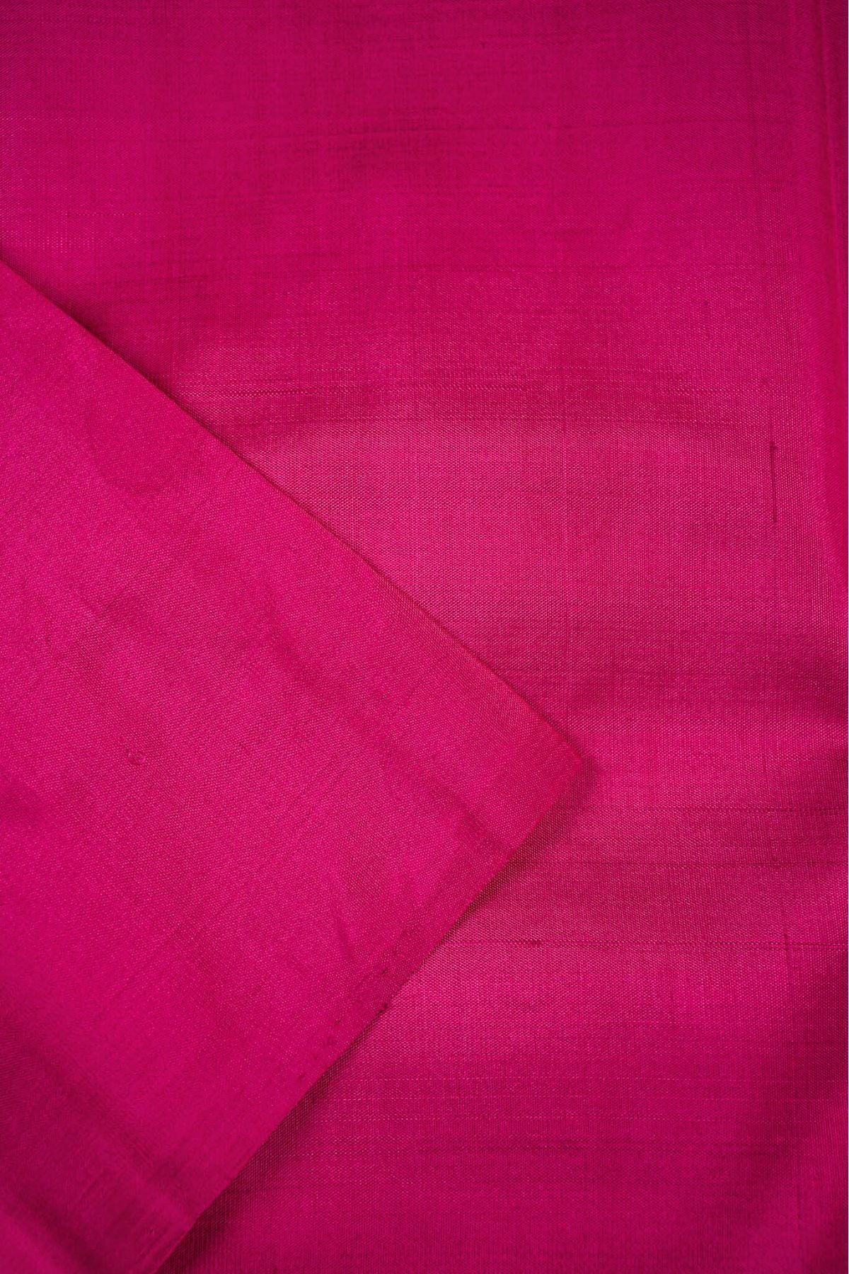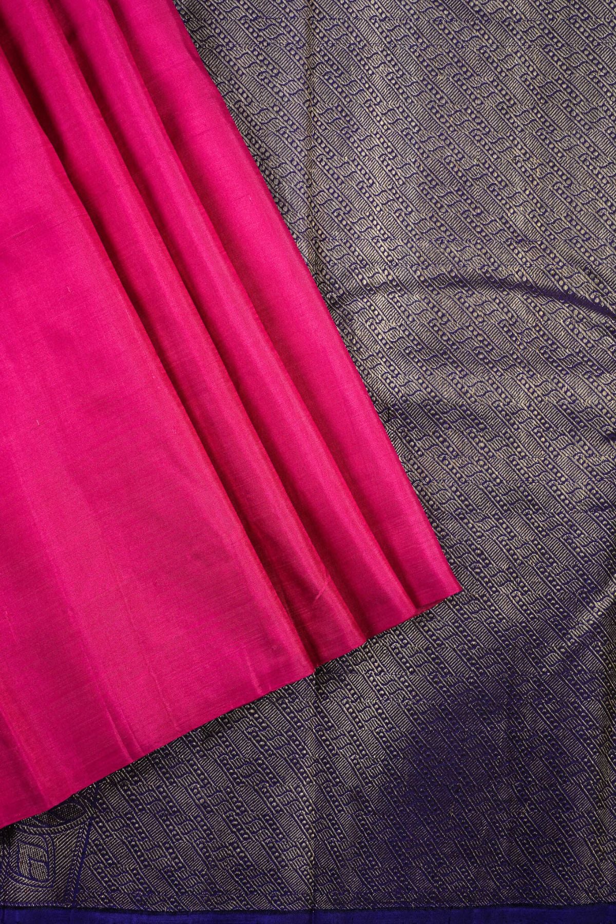 Previous NextPlain rani pink kanchipuram silk saree with a royal blue pallu embellished with wave and dot patterns in gold zari.