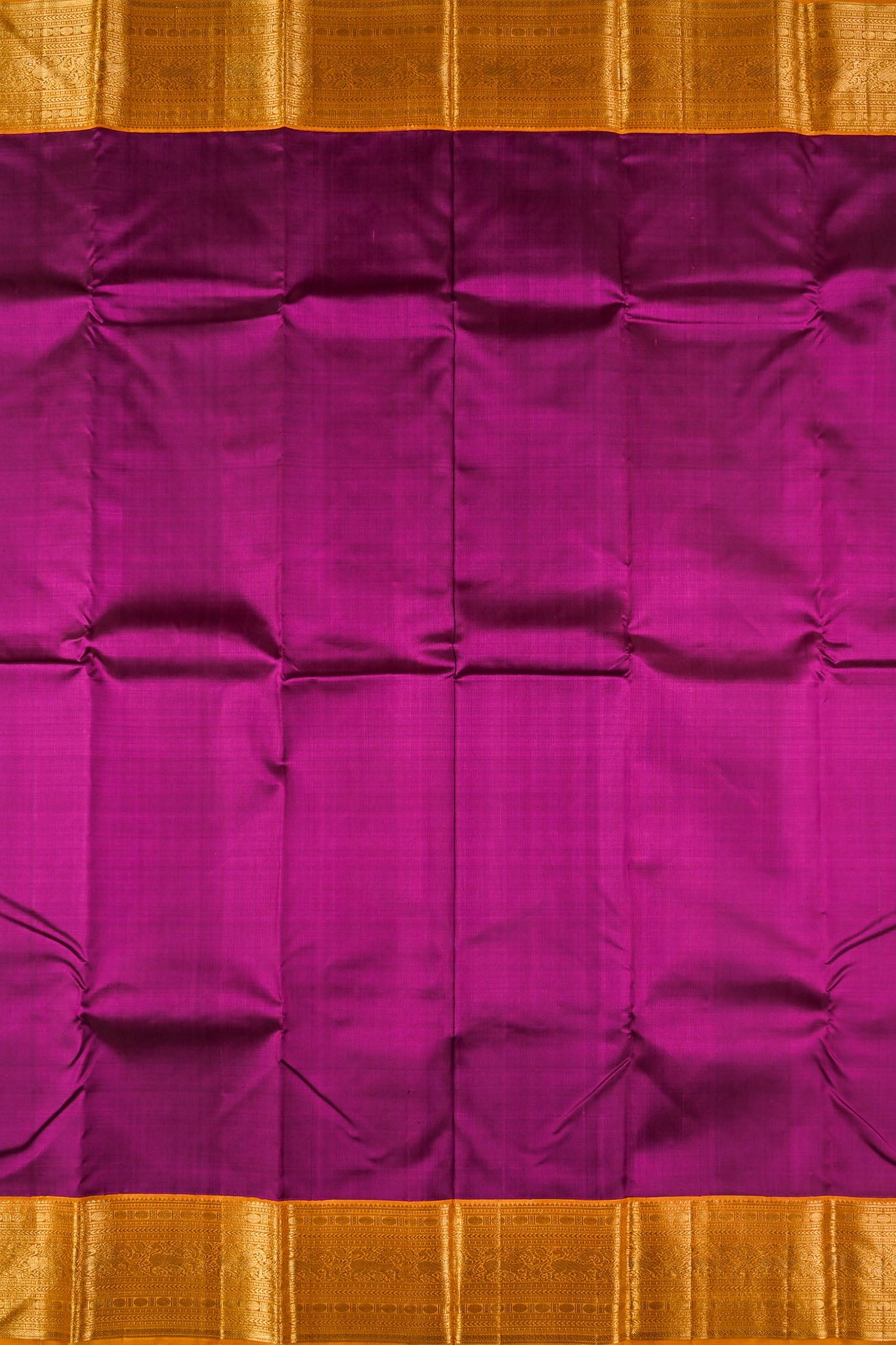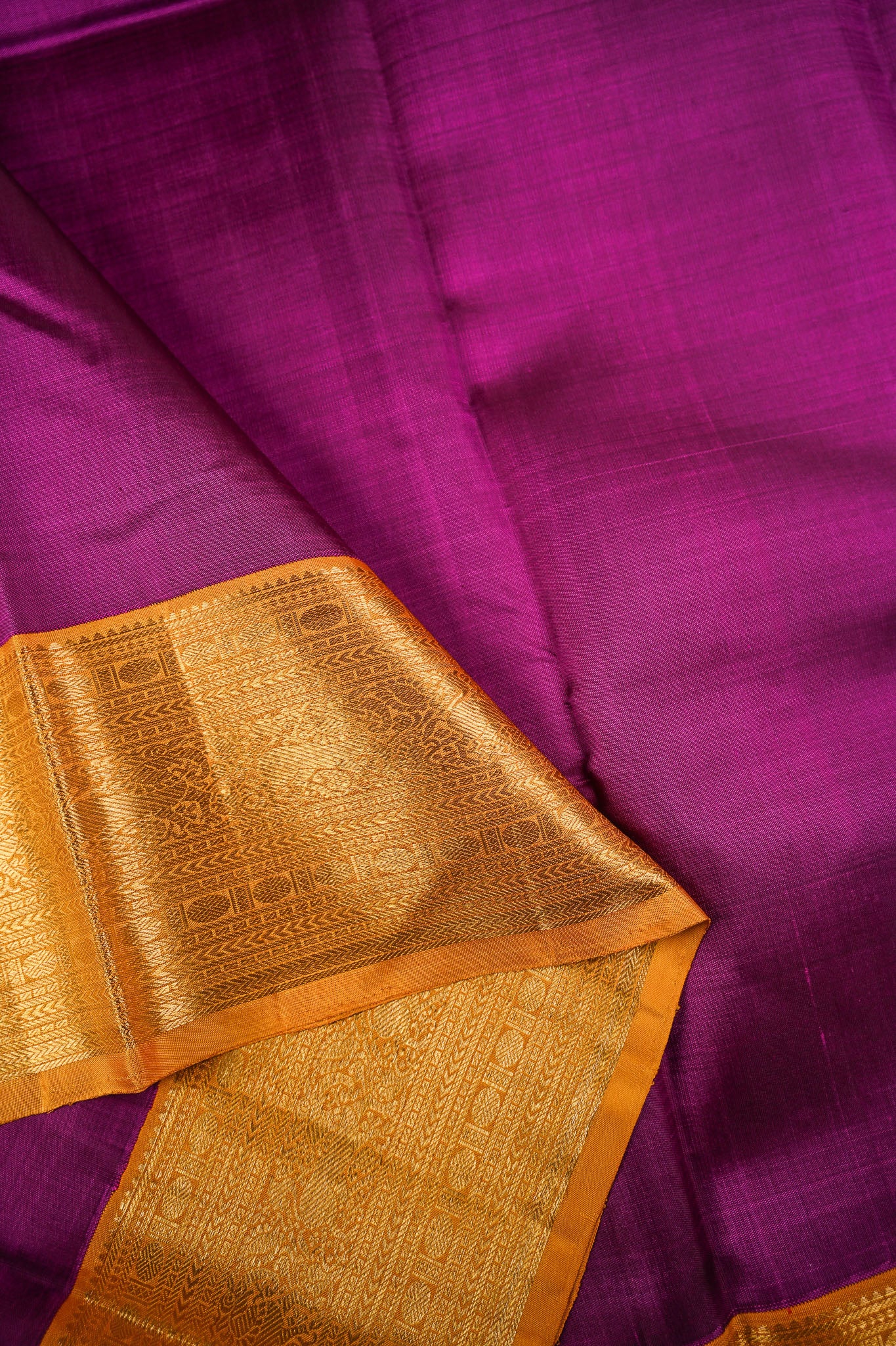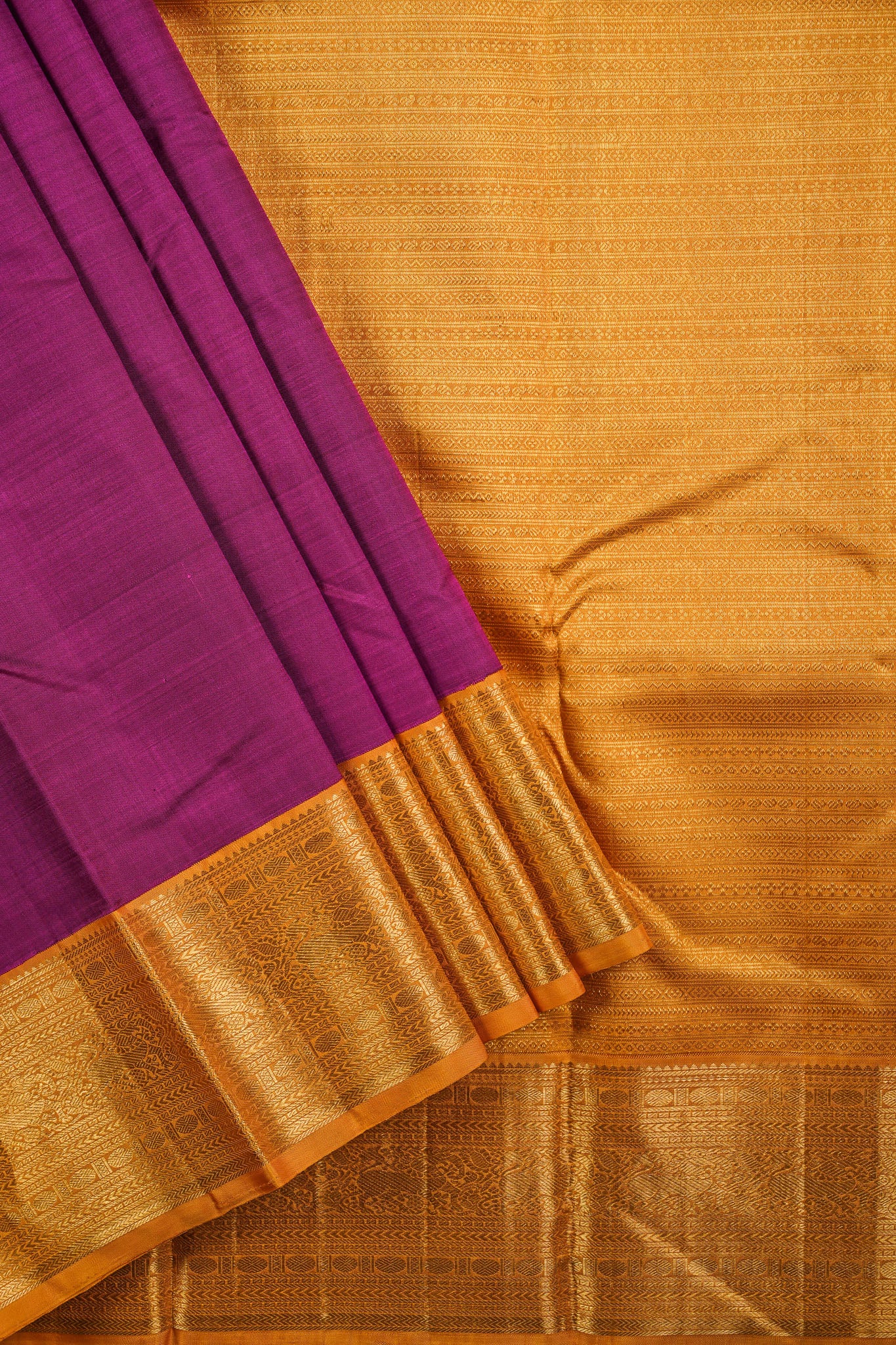 Previous NextPlain purple kanchipuram silk saree with a contrast mustard border, rich in gold zari