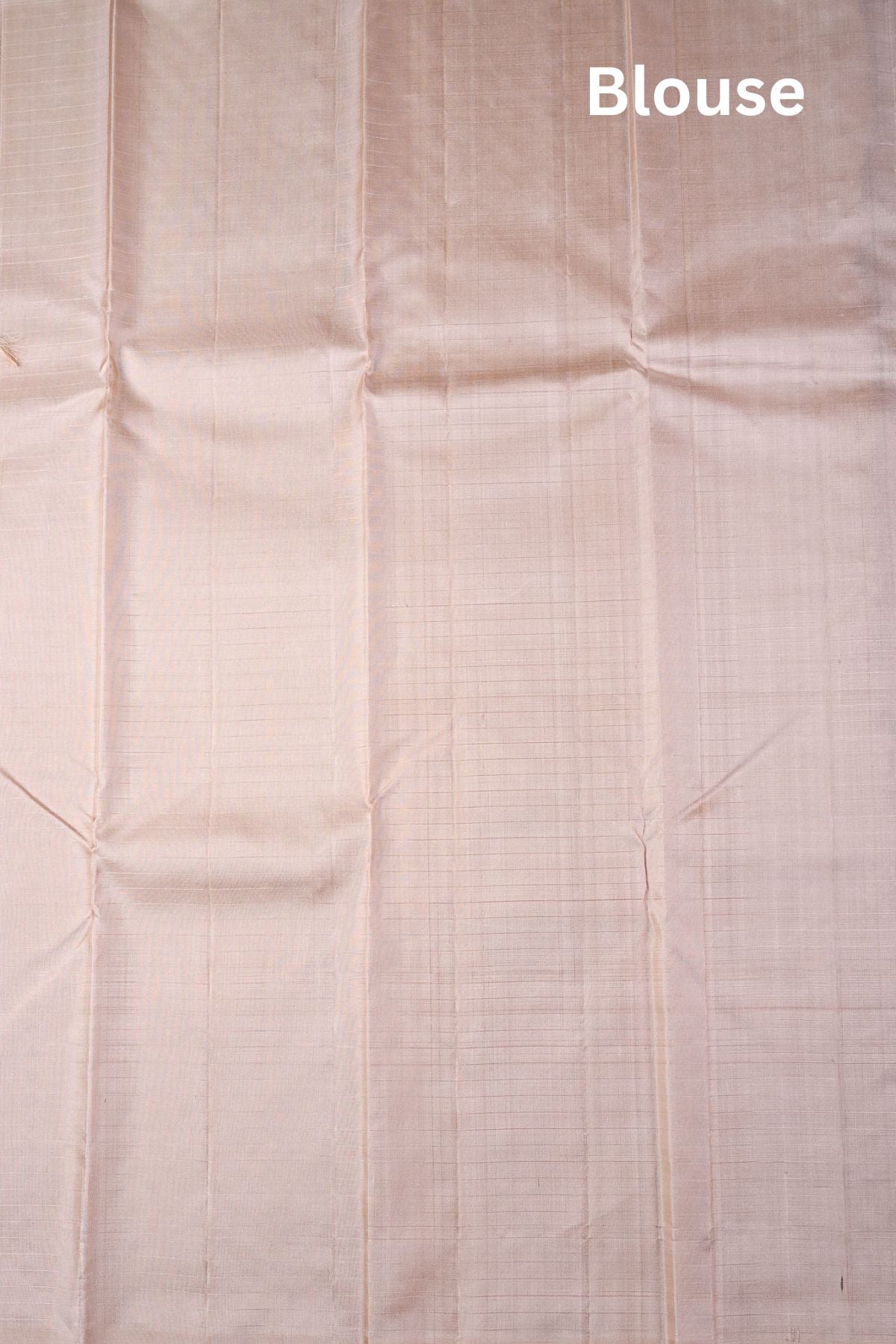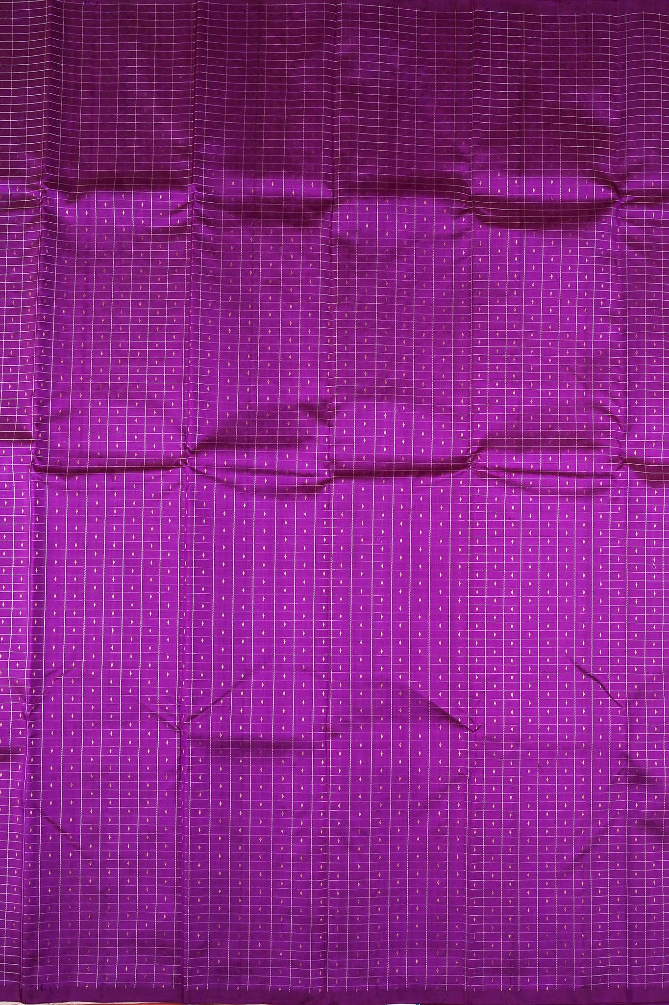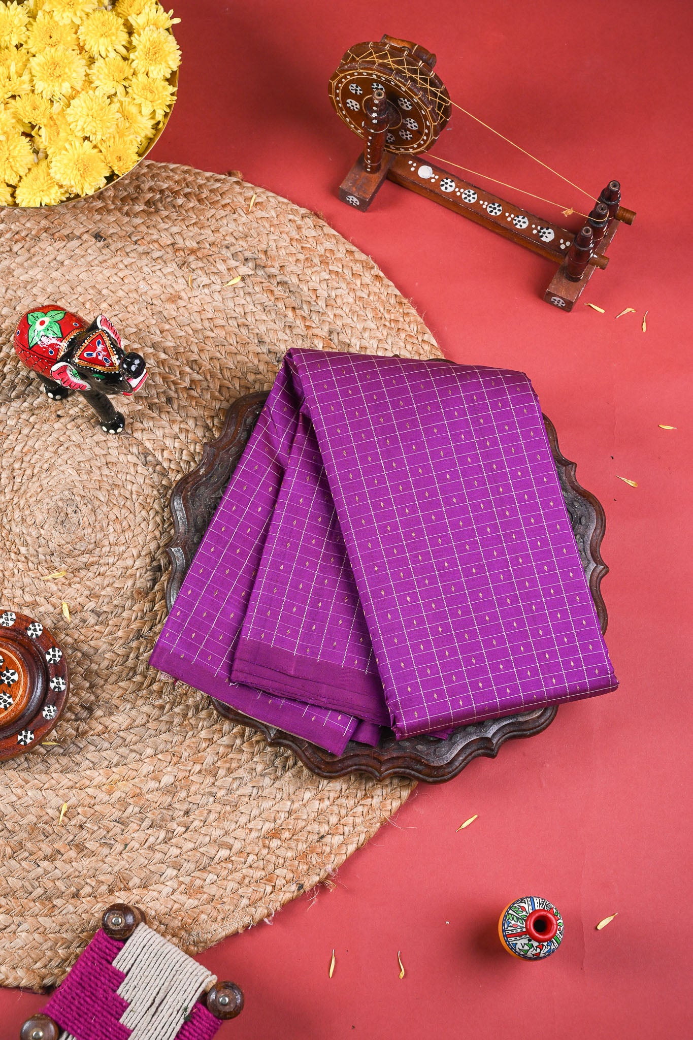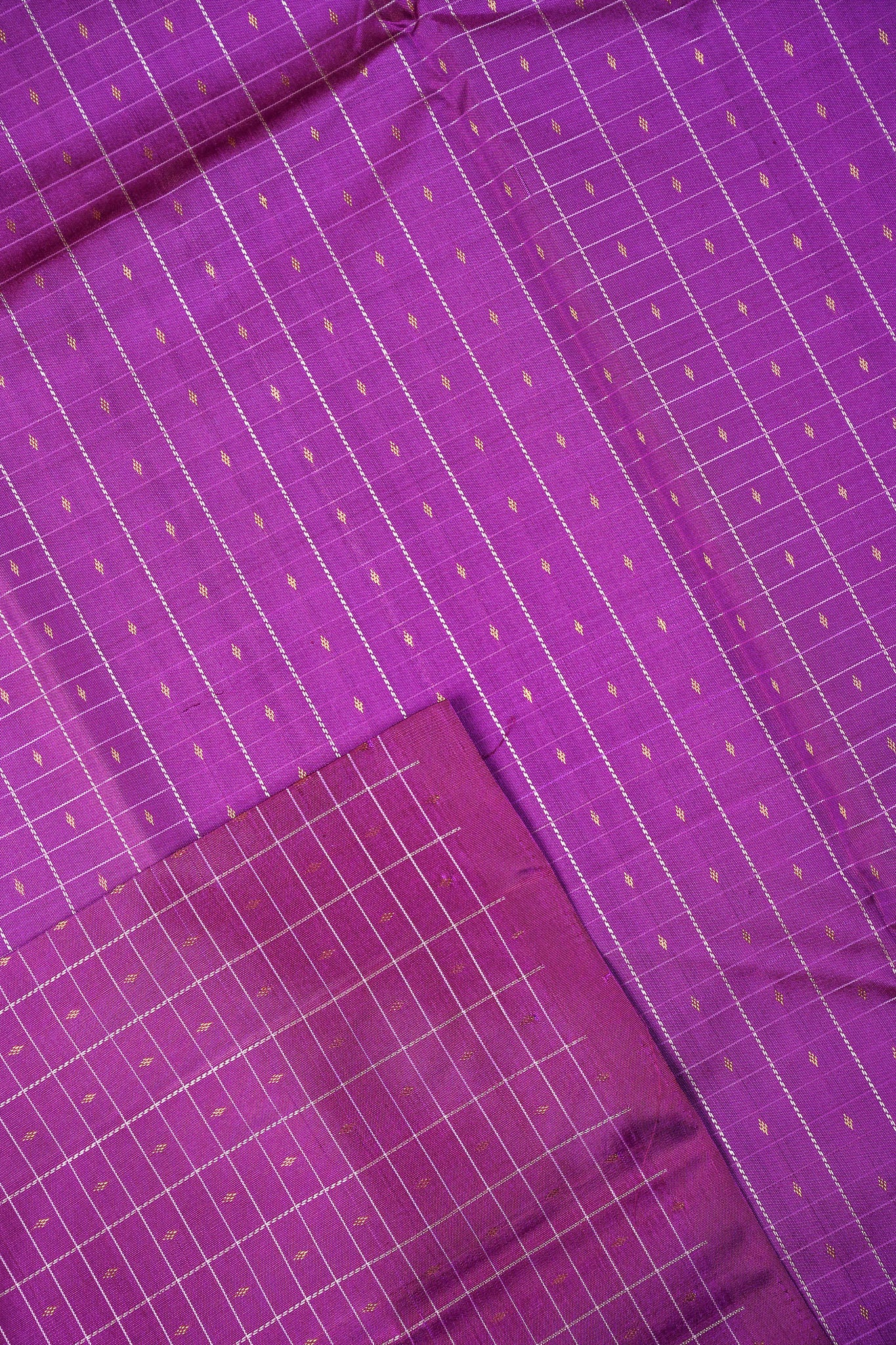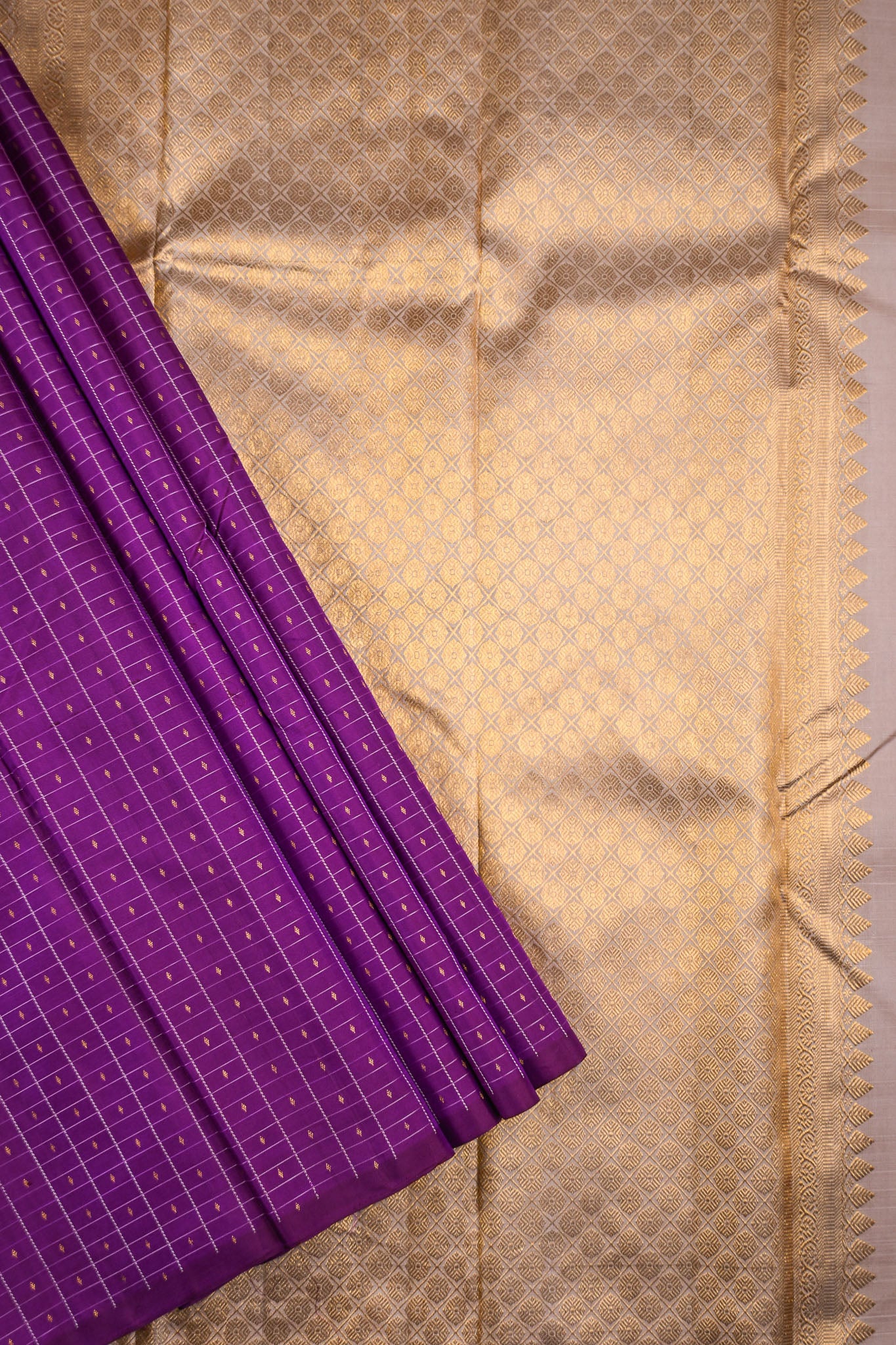 Previous NextPurple borderless kanchipuram silk saree with pulli-kattam zari pattern taking over the body, paired with a classic beige coloured grand pallu .