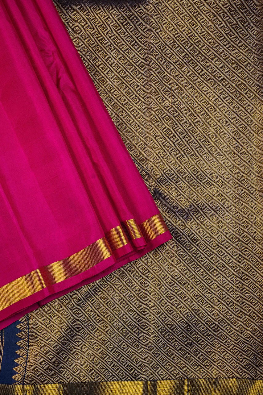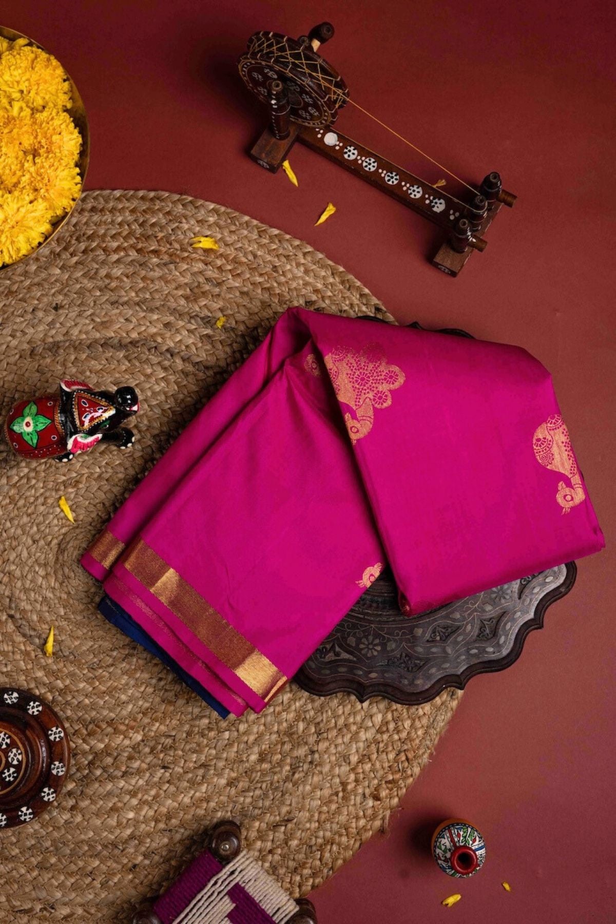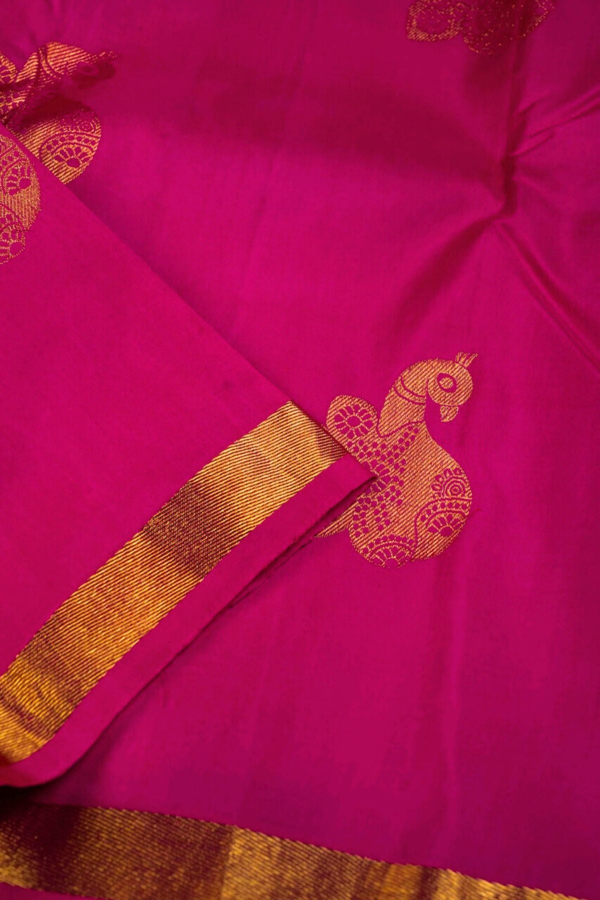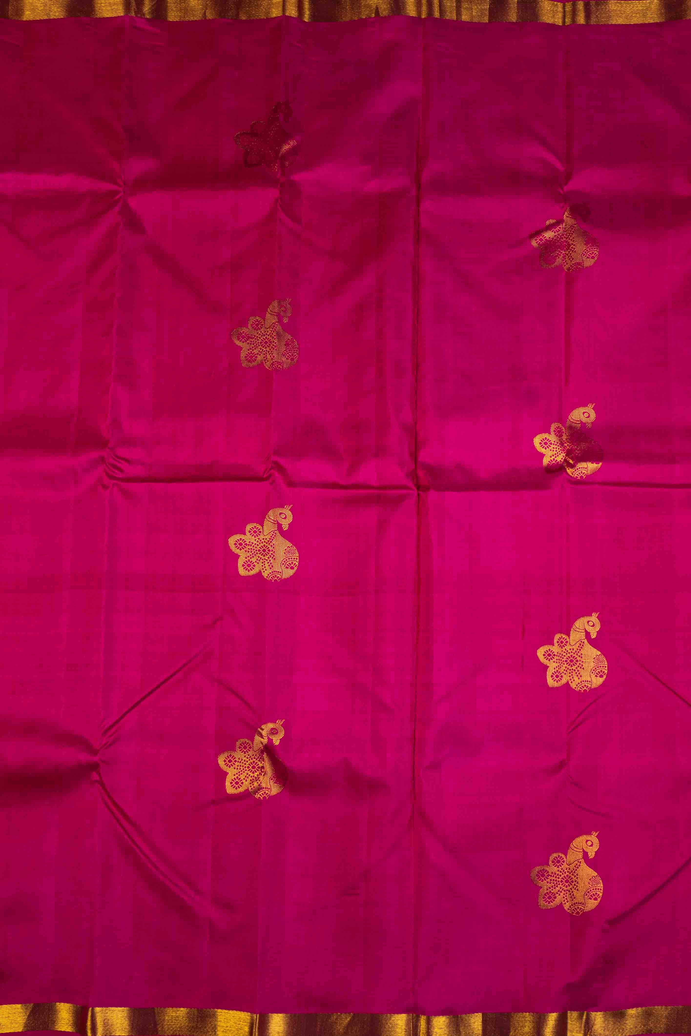 Previous NextRani pink kanchipuram silk saree with a small "self" border in gold zari. Stylized Annam bhuttas take over the body in gold zari.