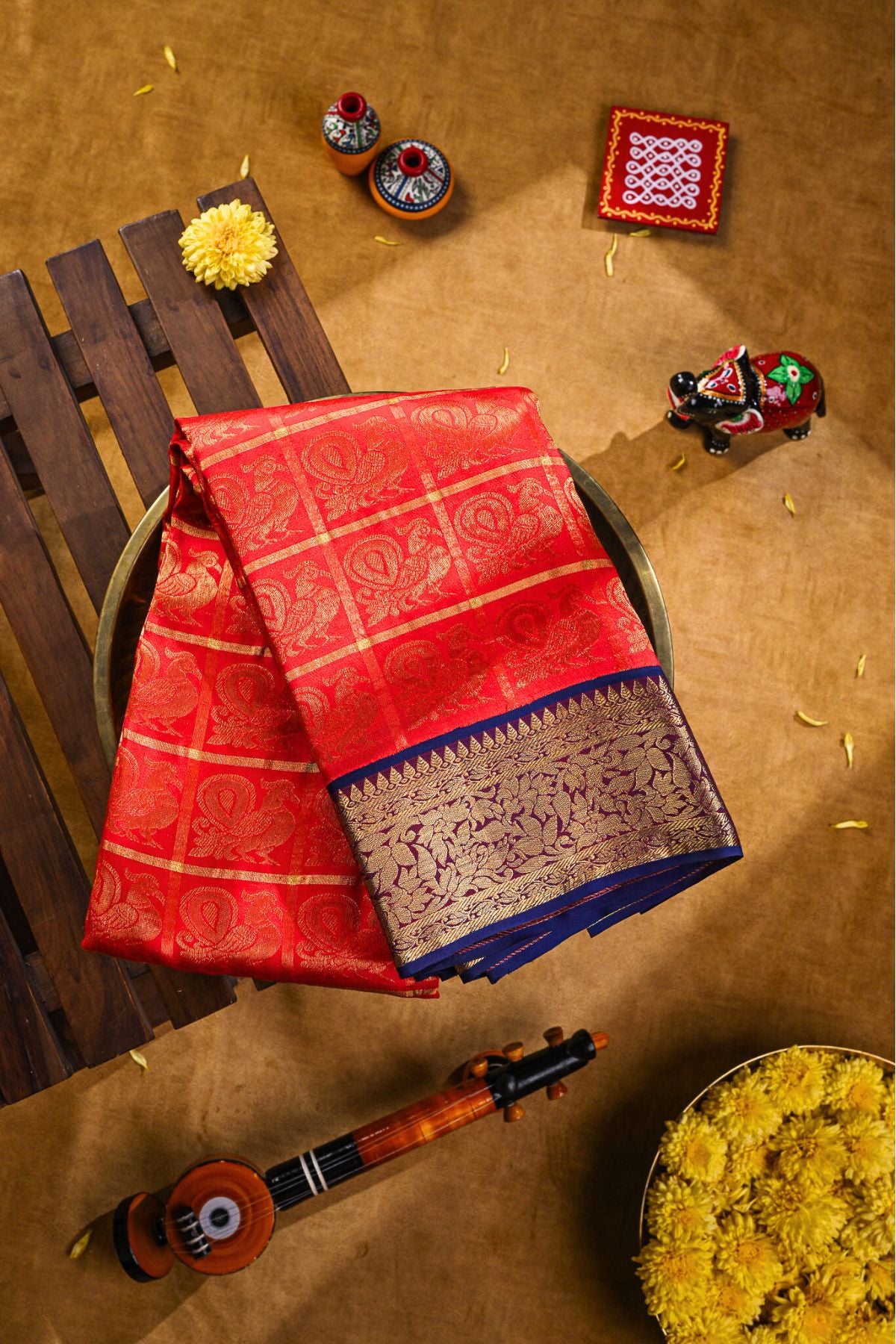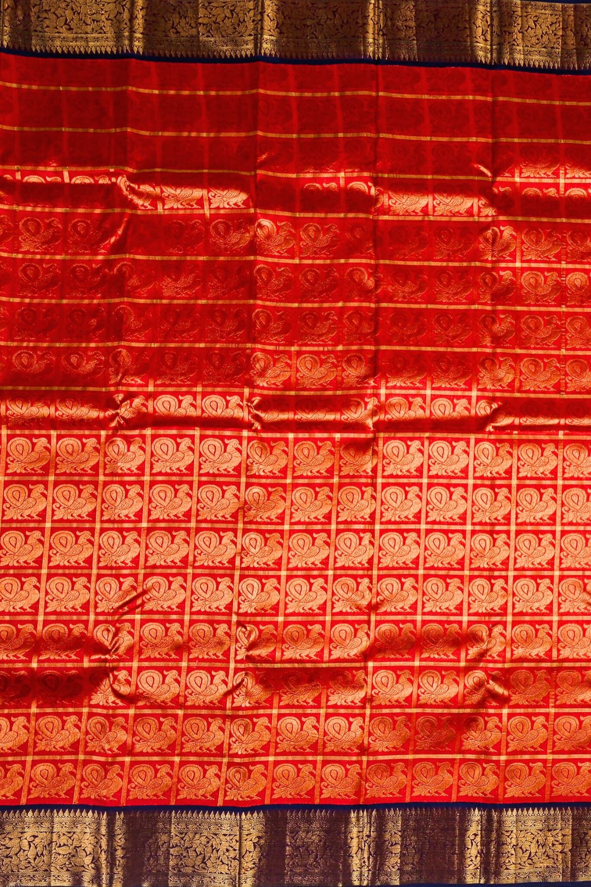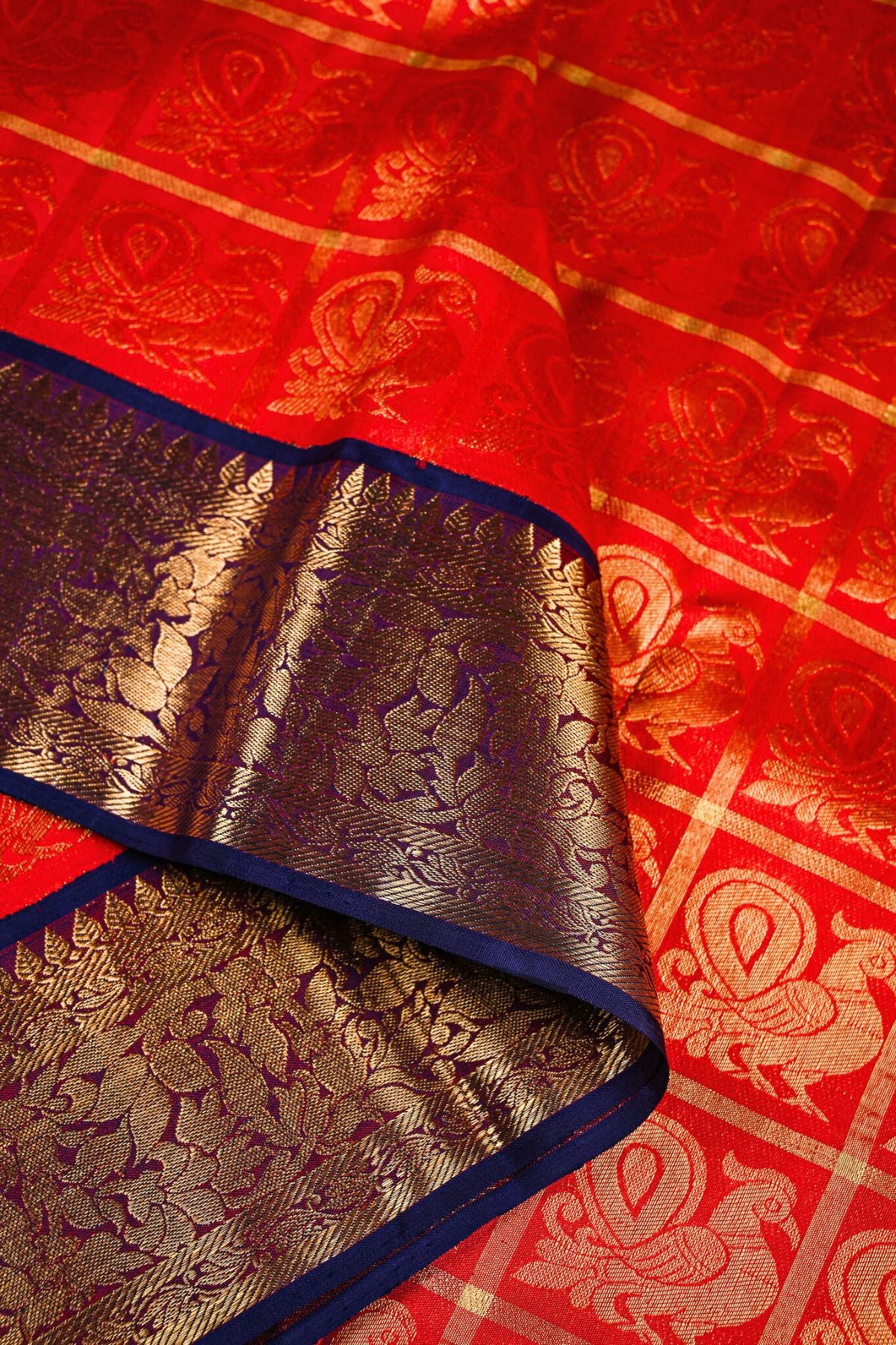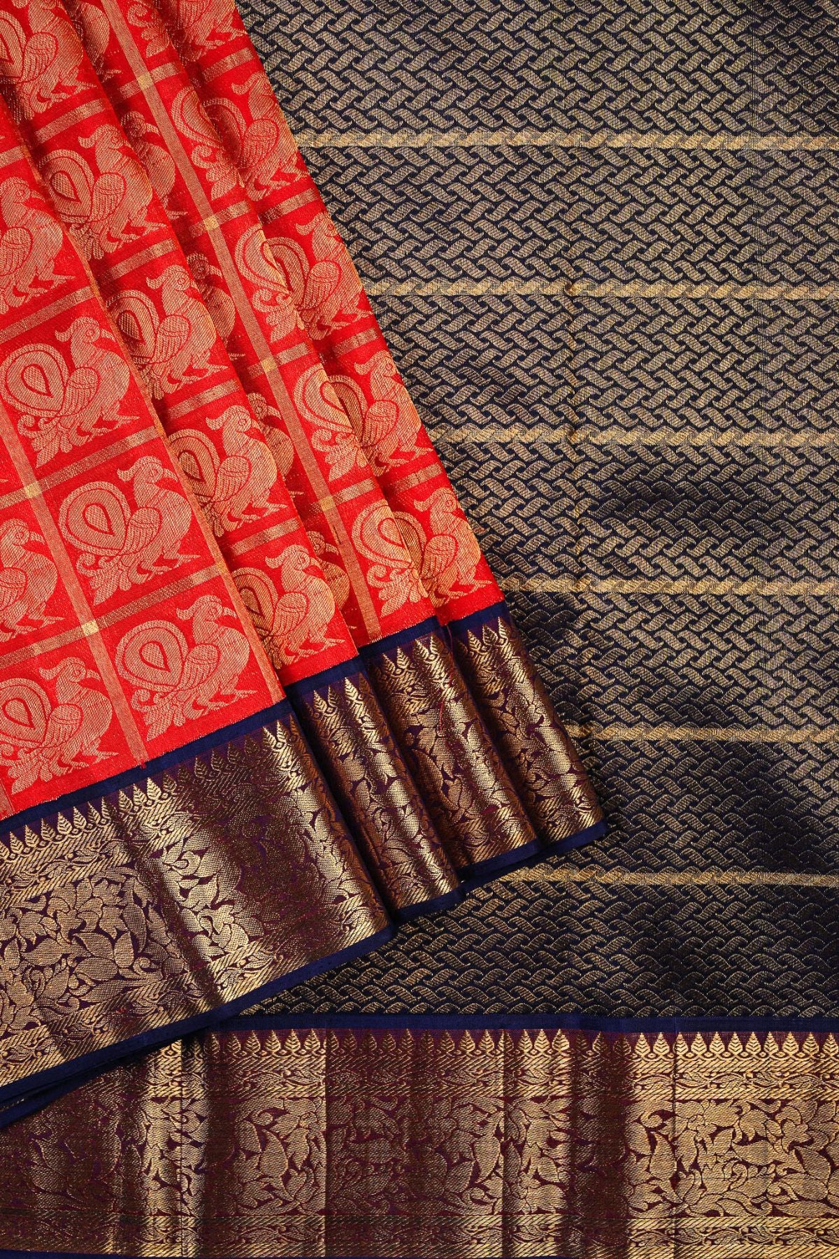 Previous NextRaspberry Red with Navy Blue Kanchipuram Silk Saree embellished with golden peacocks in checks on the body and floral leaves across the border. The pallu boasts rich golden interlocking wavelets on navy blue ground, adding elegance to the saree. Plain striped navy blue blouse with the same border