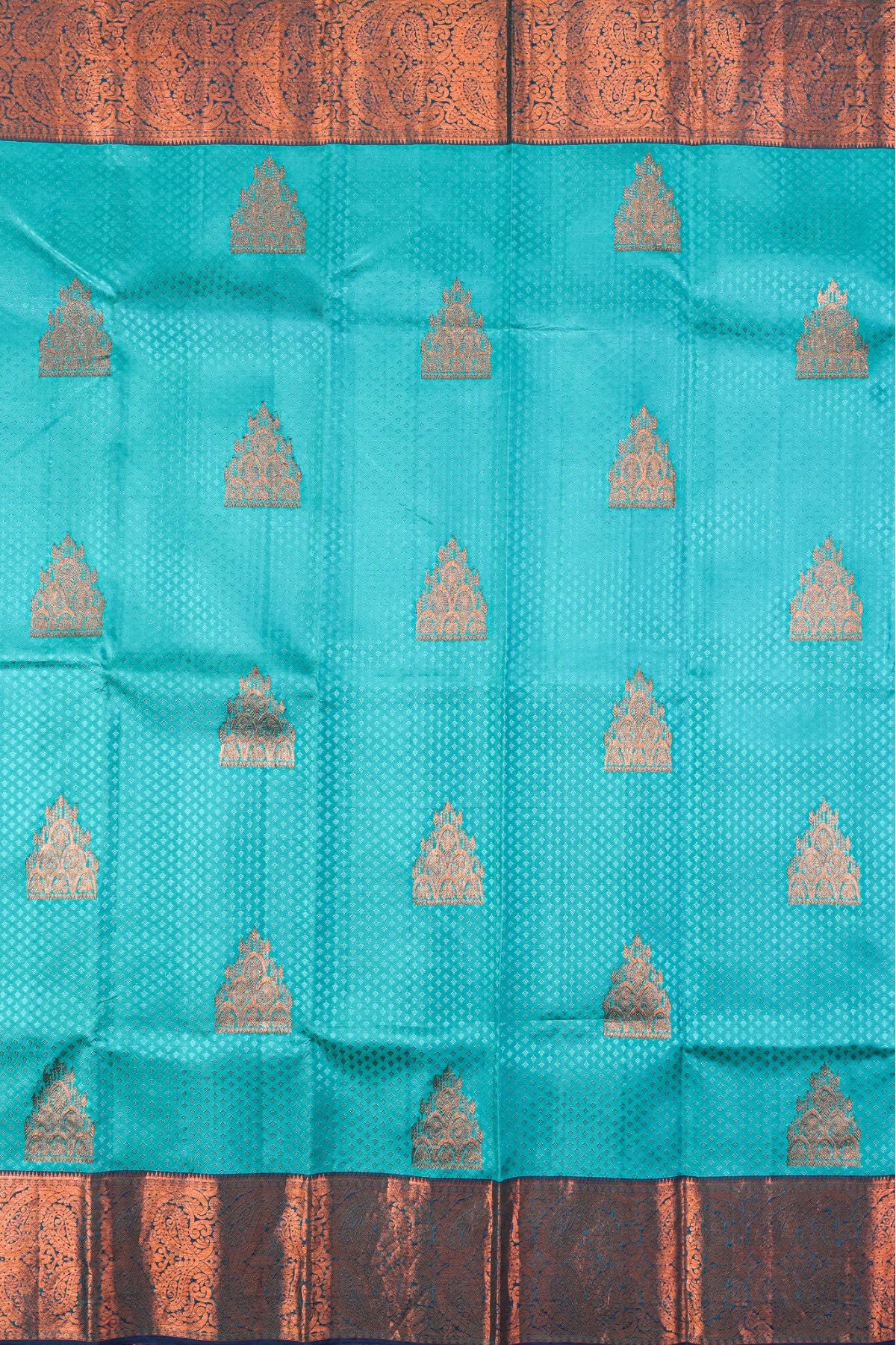 Previous NextSky blue kanchipuram silk saree with thread embossed patterns taking over the body, overlayered by Gopuram inspired bhuttas woven across the body.