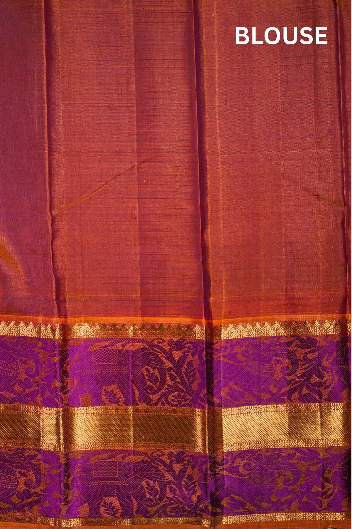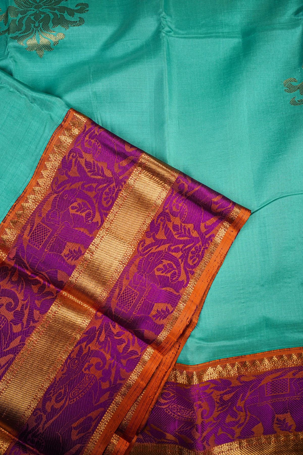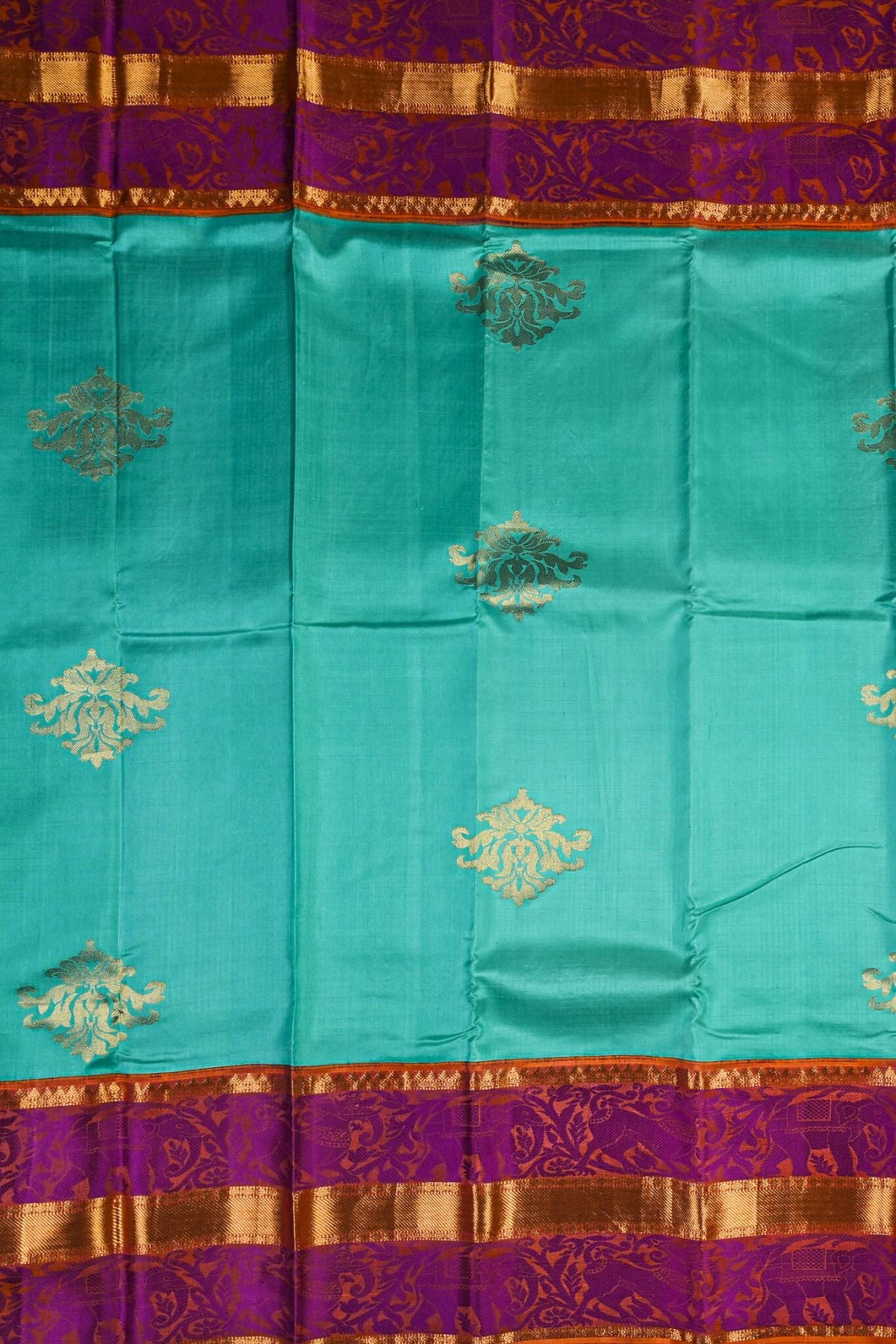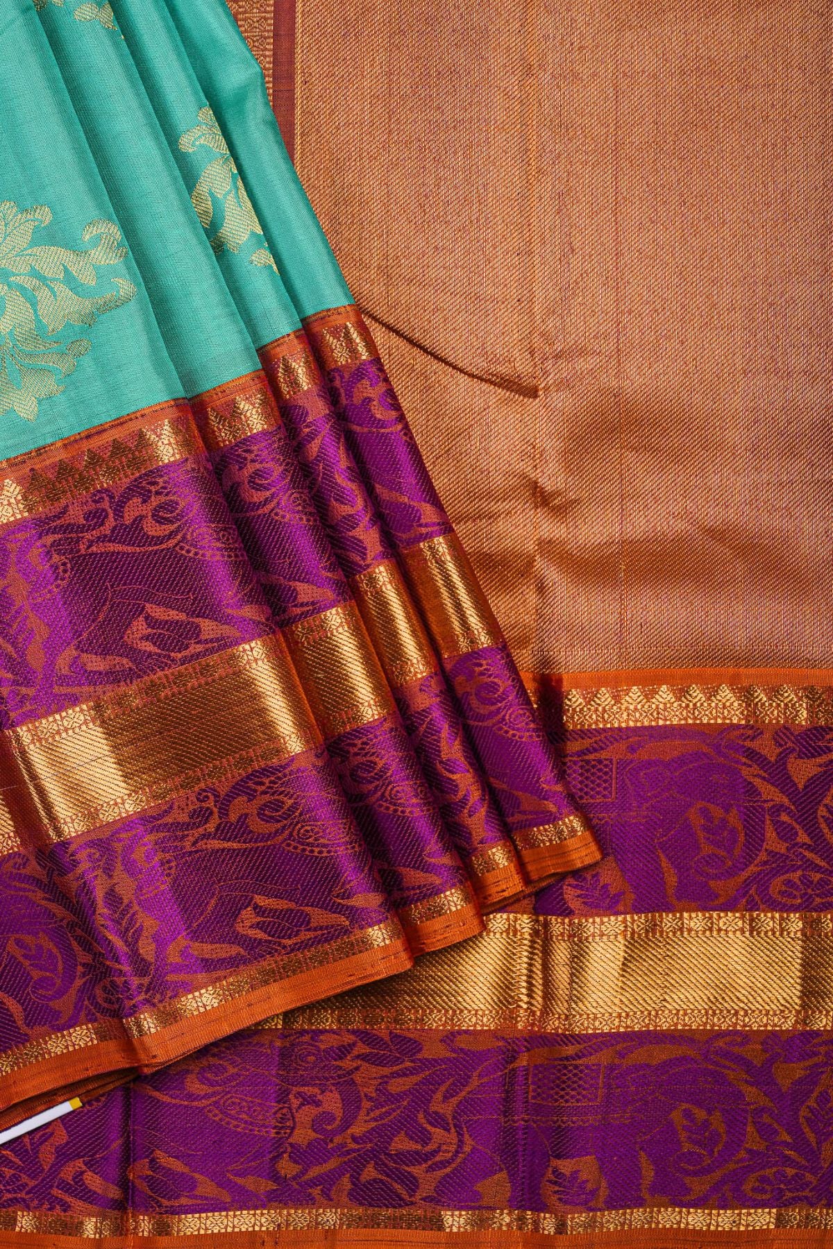 Previous NextTurquoise Kanchipuram Saree with floral motifs woven in golden zari. Rusty red and purple border with Yazhi and Elephant motifs are woven in purple threads.