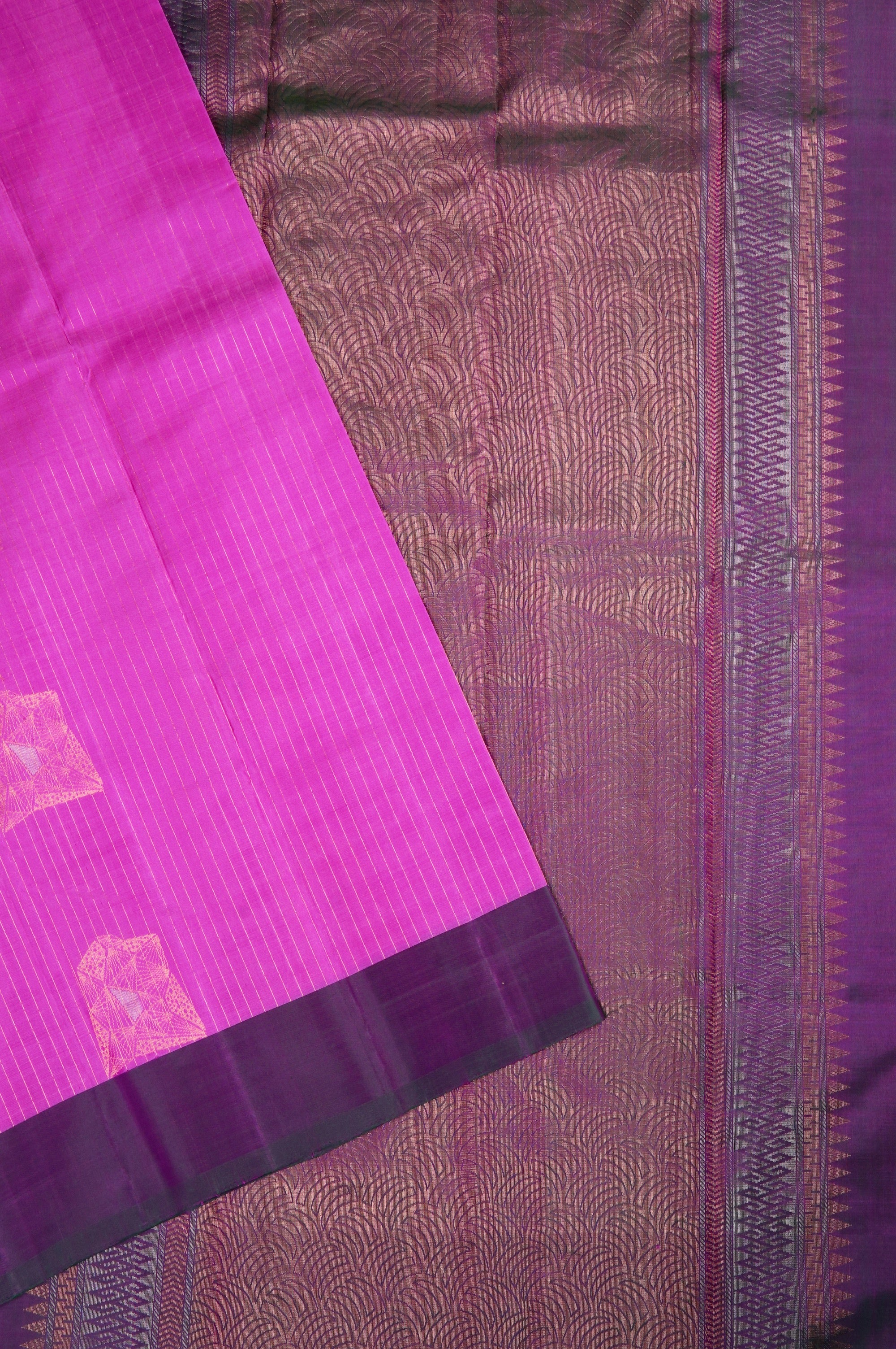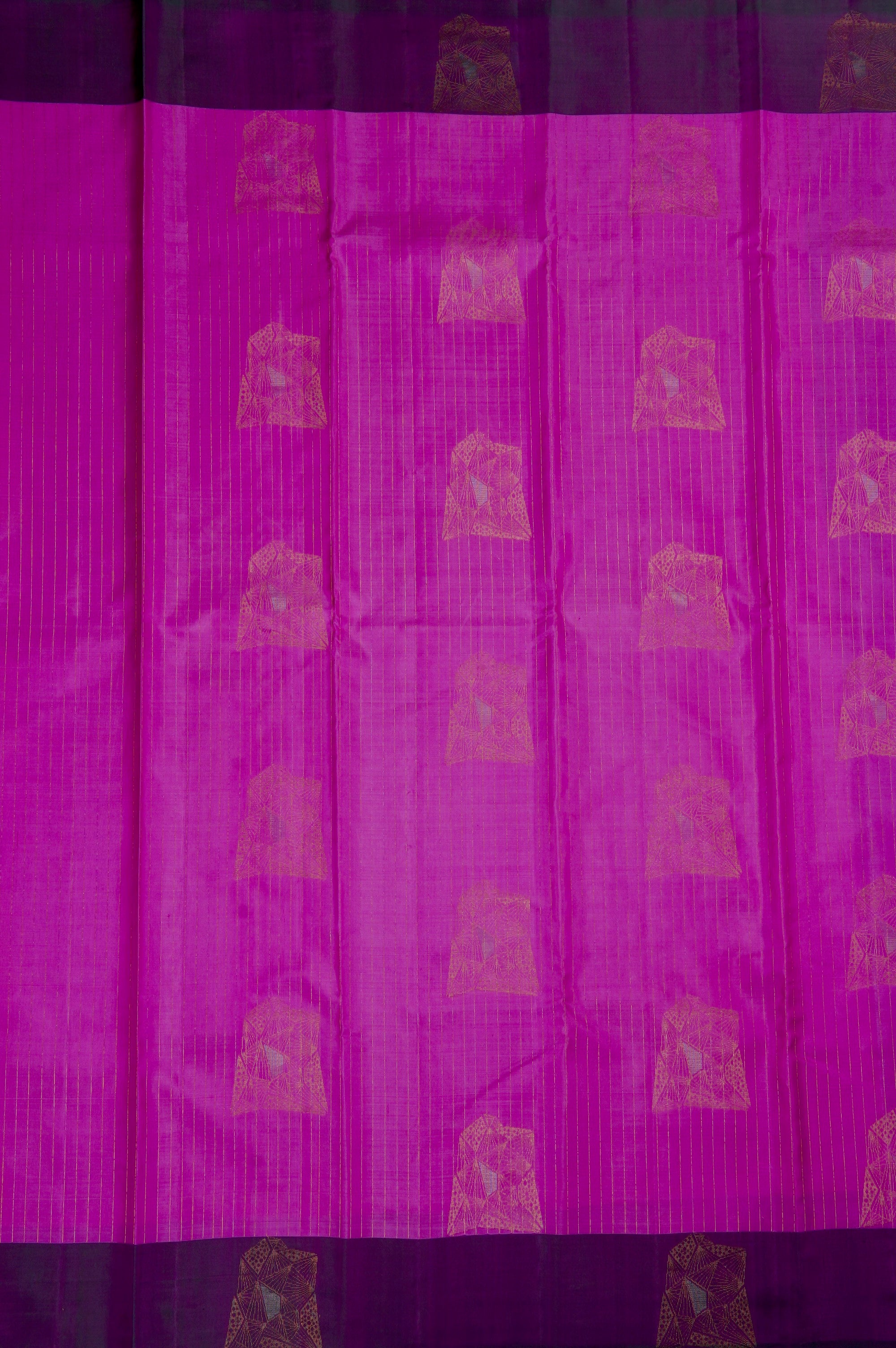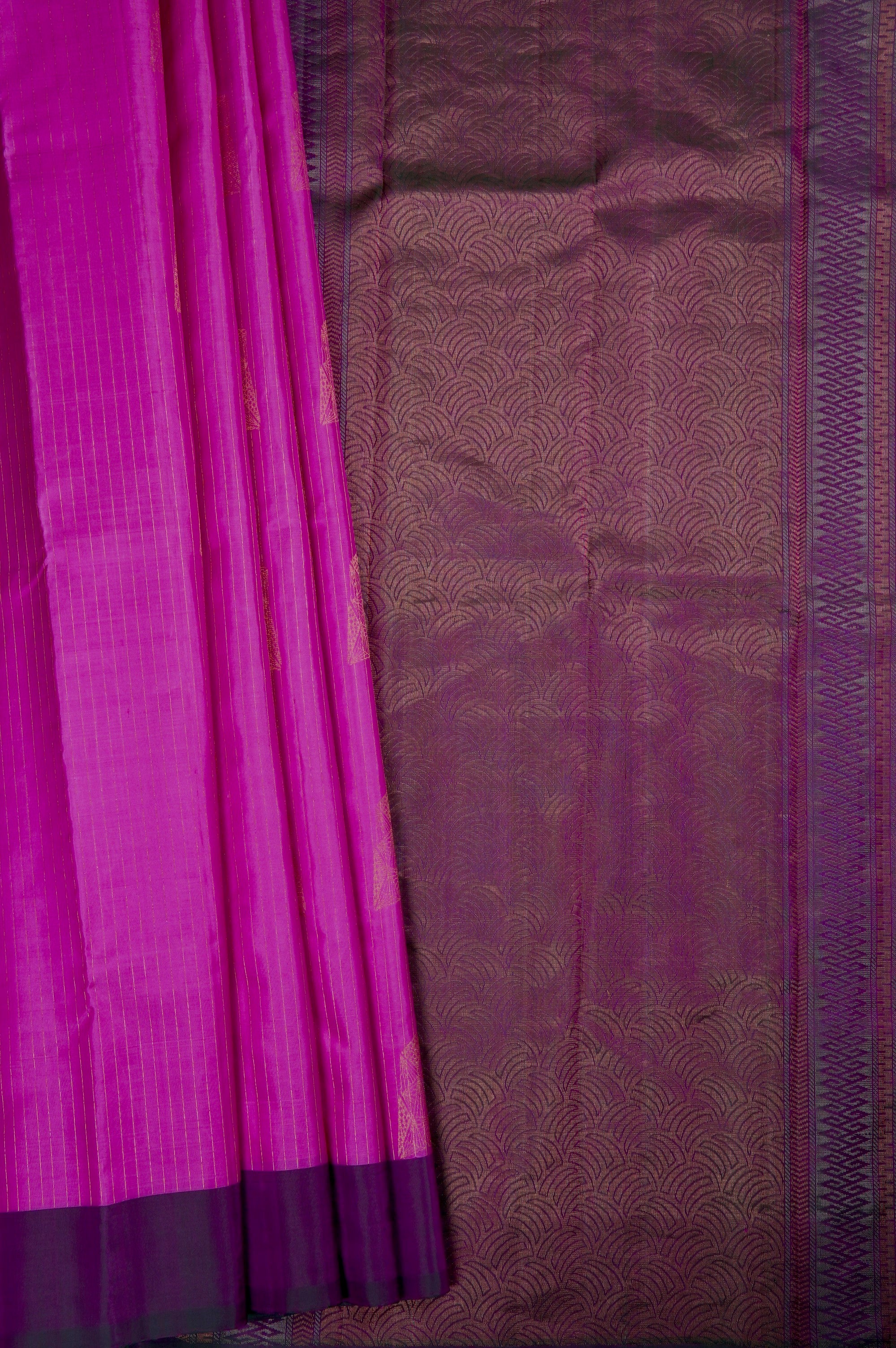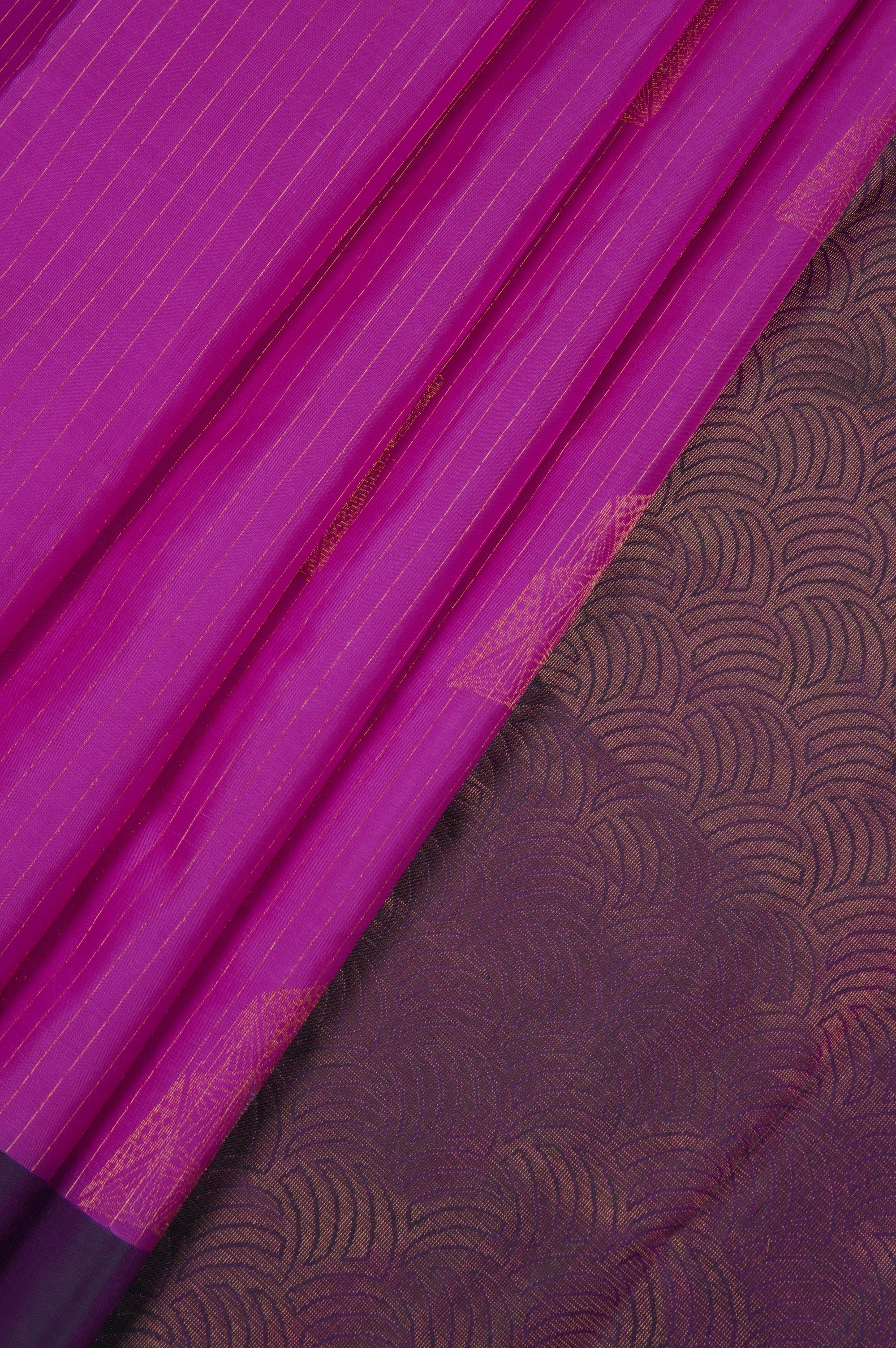 Previous NextDeep fuchsia soft silk saree with vaira oosi running vertically along the body along with abstract geometrical motifs placed all over the body in gold and silver zari, with a dark purple border. The pallu has a dark purple base with contemporary geometric elements forming scallops woven in gold zari, followed by bands of abstract designs woven in gold and silver zari. The saree has a solid dark purple blouse.