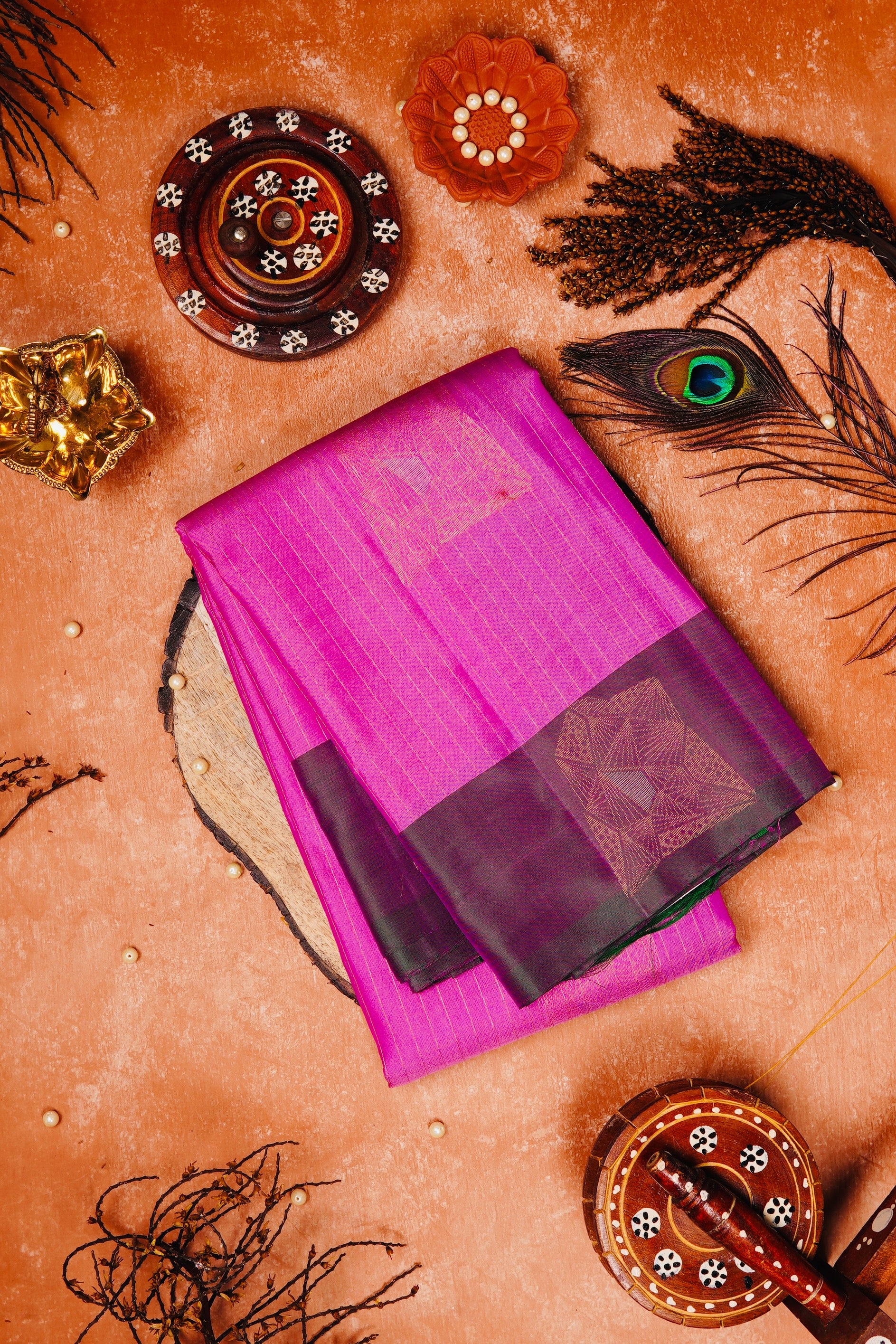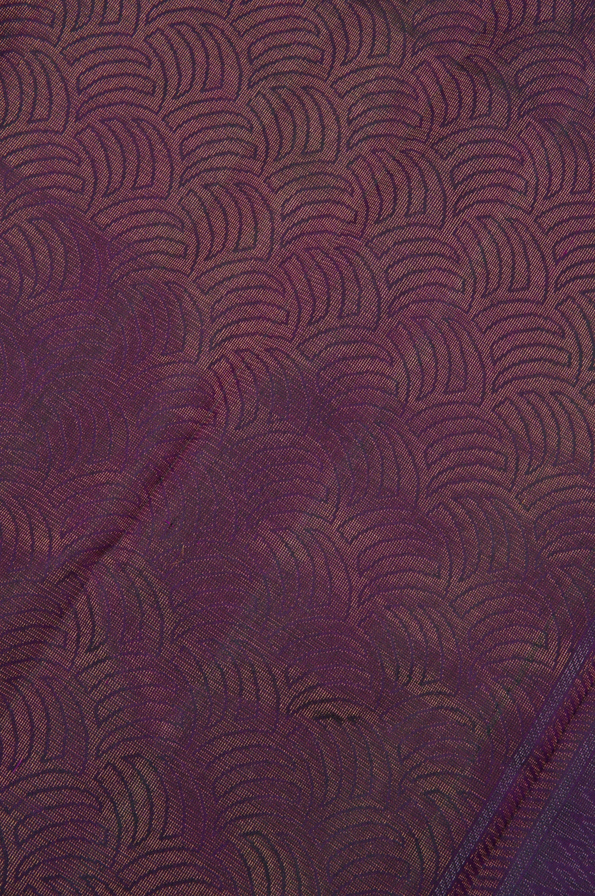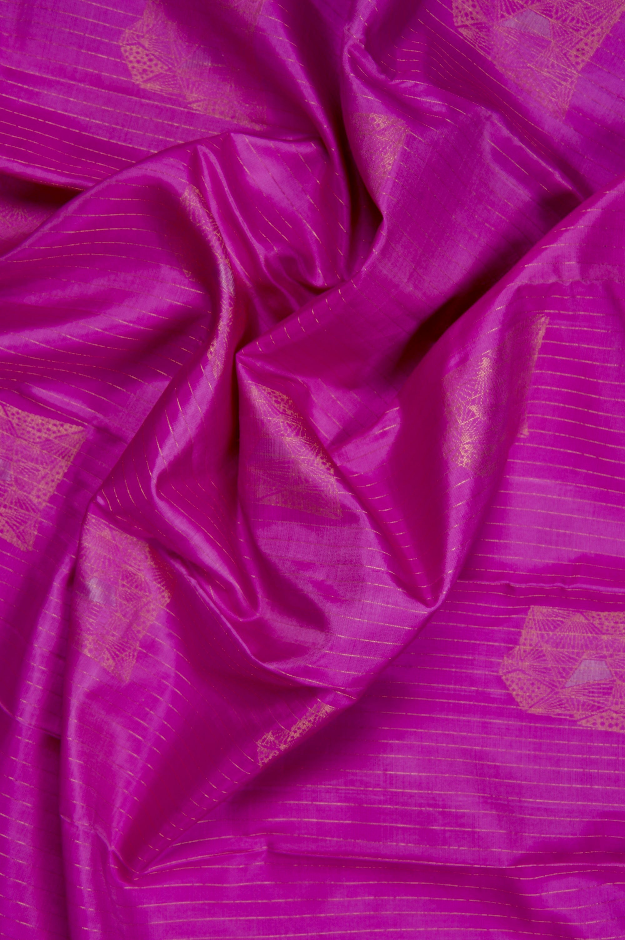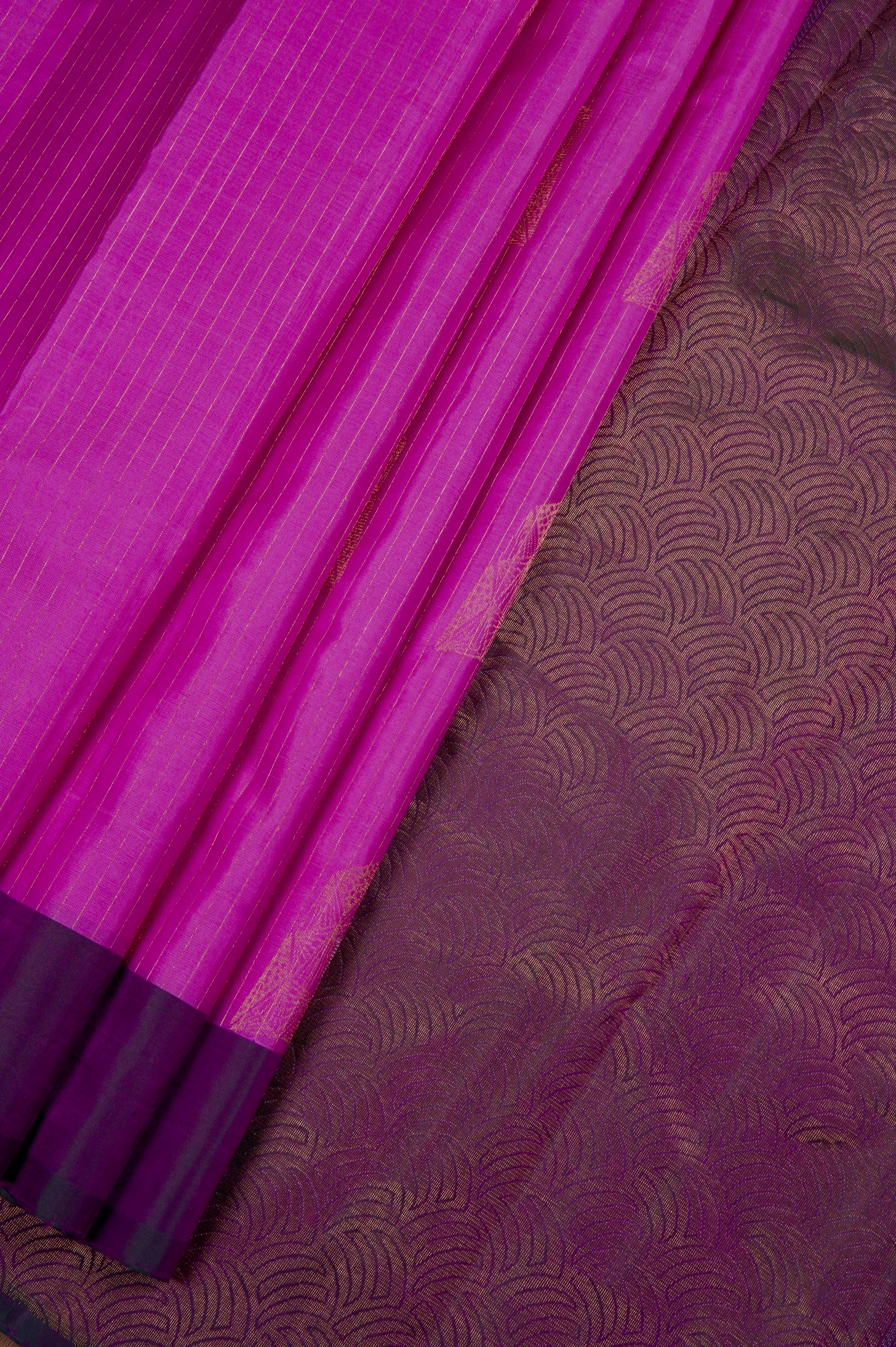 Previous NextDeep fuchsia soft silk saree with vaira oosi running vertically along the body along with abstract geometrical motifs placed all over the body in gold and silver zari, with a dark purple border. The pallu has a dark purple base with contemporary geometric elements forming scallops woven in gold zari, followed by bands of abstract designs woven in gold and silver zari. The saree has a solid dark purple blouse.